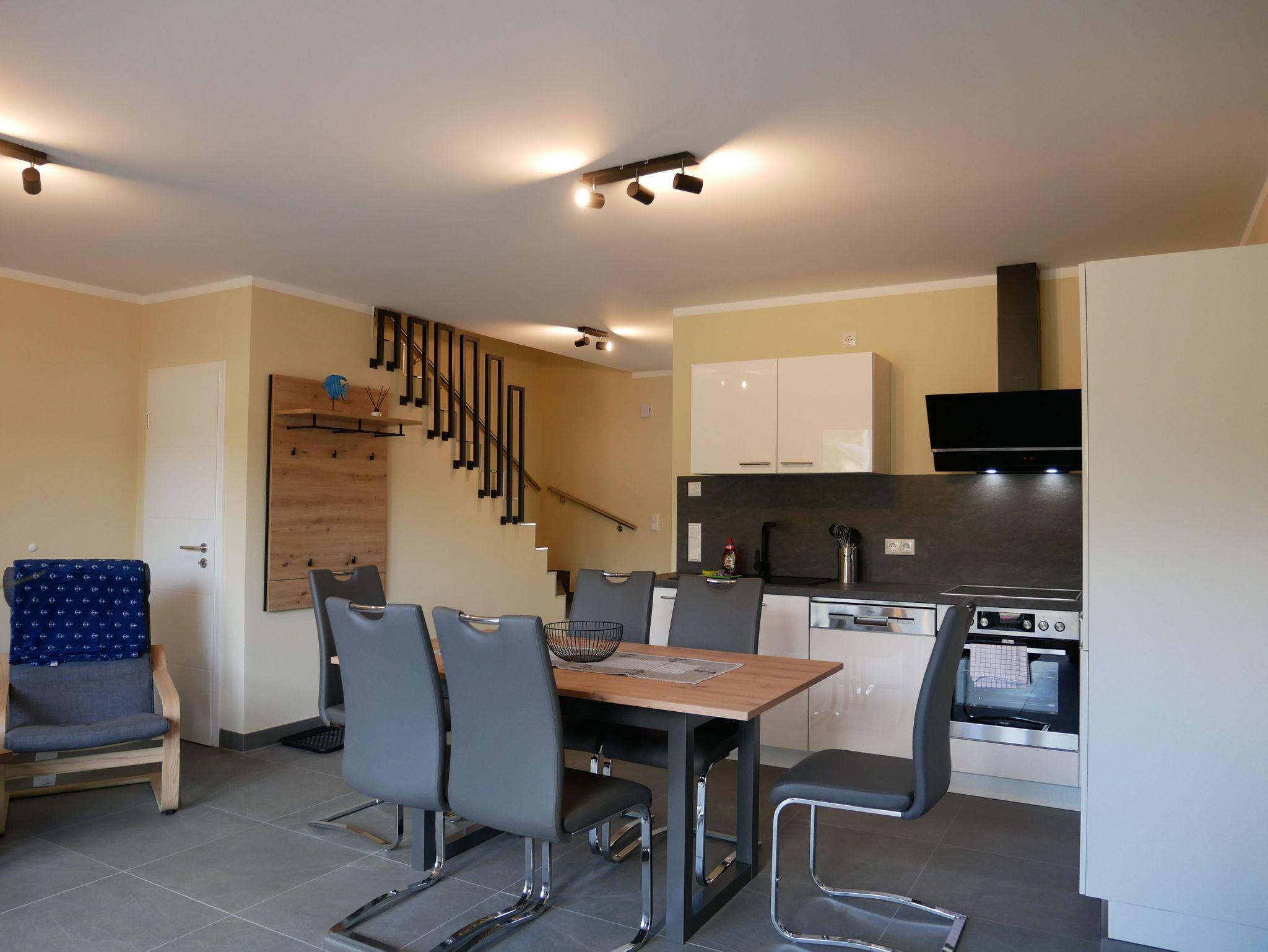 In Ihrer großzügigen, ca. 80m² großen Ferienwohnung im Kelm?s Küstennest erwartet Sie moderner Komfort auf zwei Etagen ? ideal für bis zu vier Personen. Im Erdgeschoss befindet sich der offen gestaltete Wohnbereich mit einem gemütlichen Sofa und einem Smart-TV (Flachbildfernseher). Die angrenzende, voll ausgestattete Küche mit Esstisch und Stühlen bietet alles, was Sie für eine entspannte Selbstverpflegung benötigen: Herd, Backofen, Mikrowelle, Kühlschrank mit Tiefkühlfach, Spülmaschine, Toaster, Wasserkocher, Kaffeemaschine und Waschmaschine stehen Ihnen zur Verfügung.