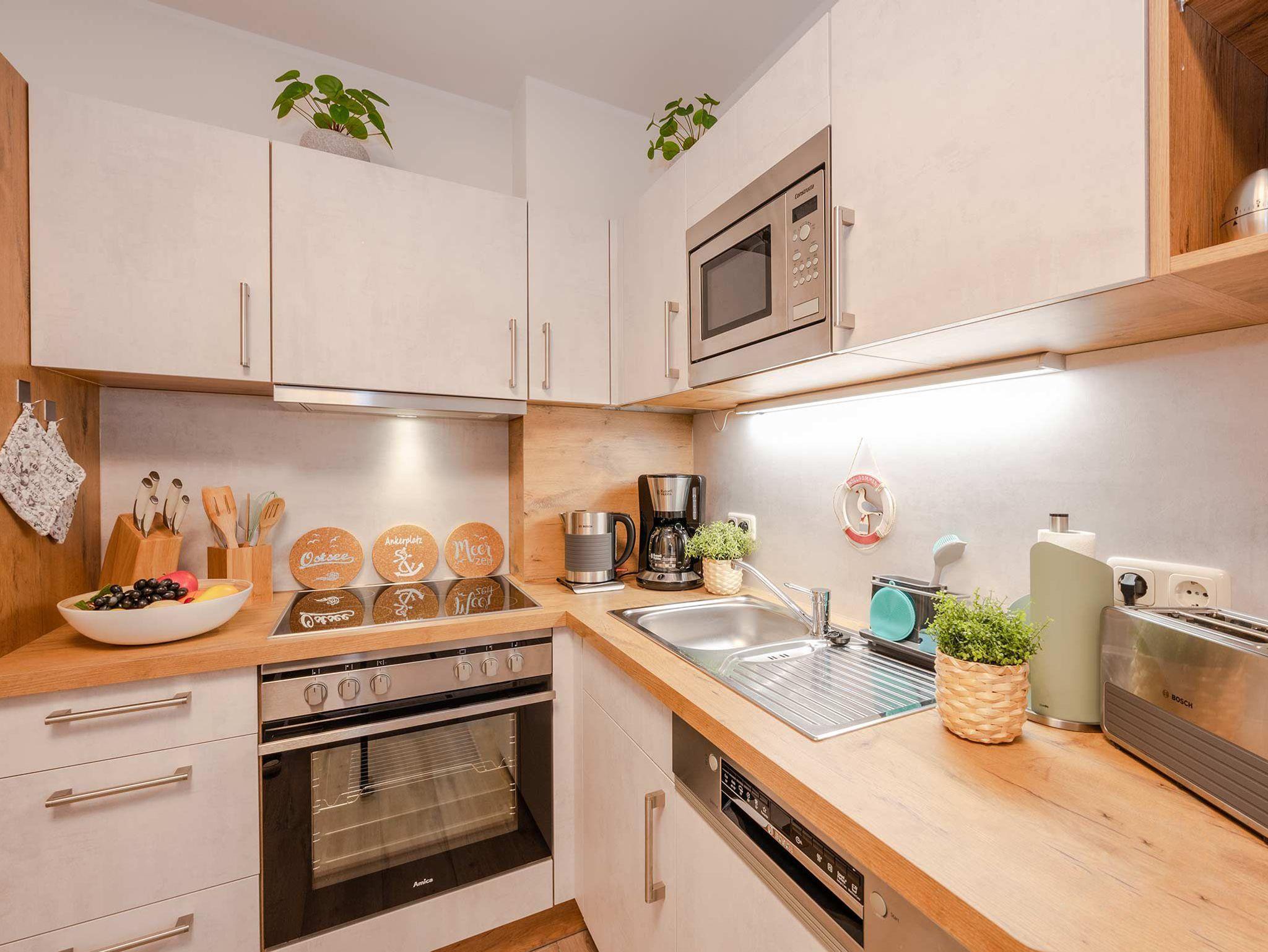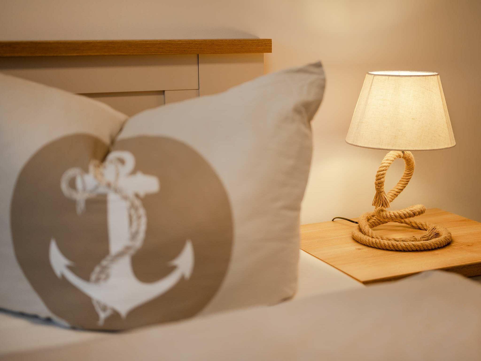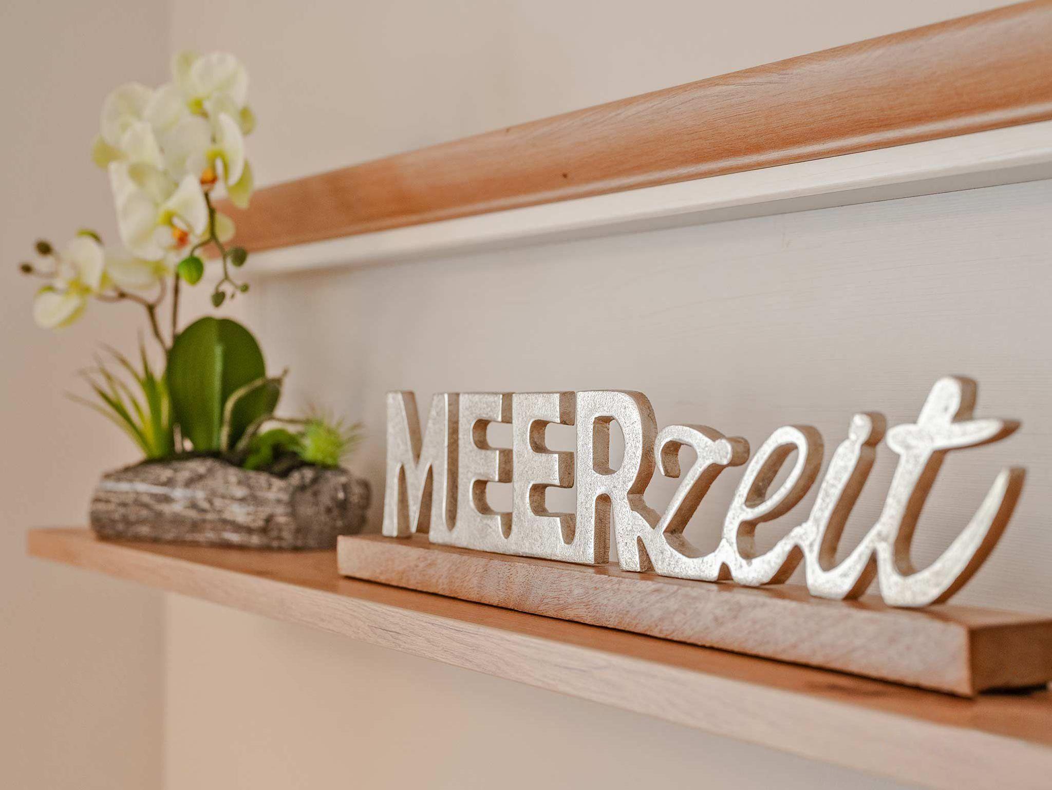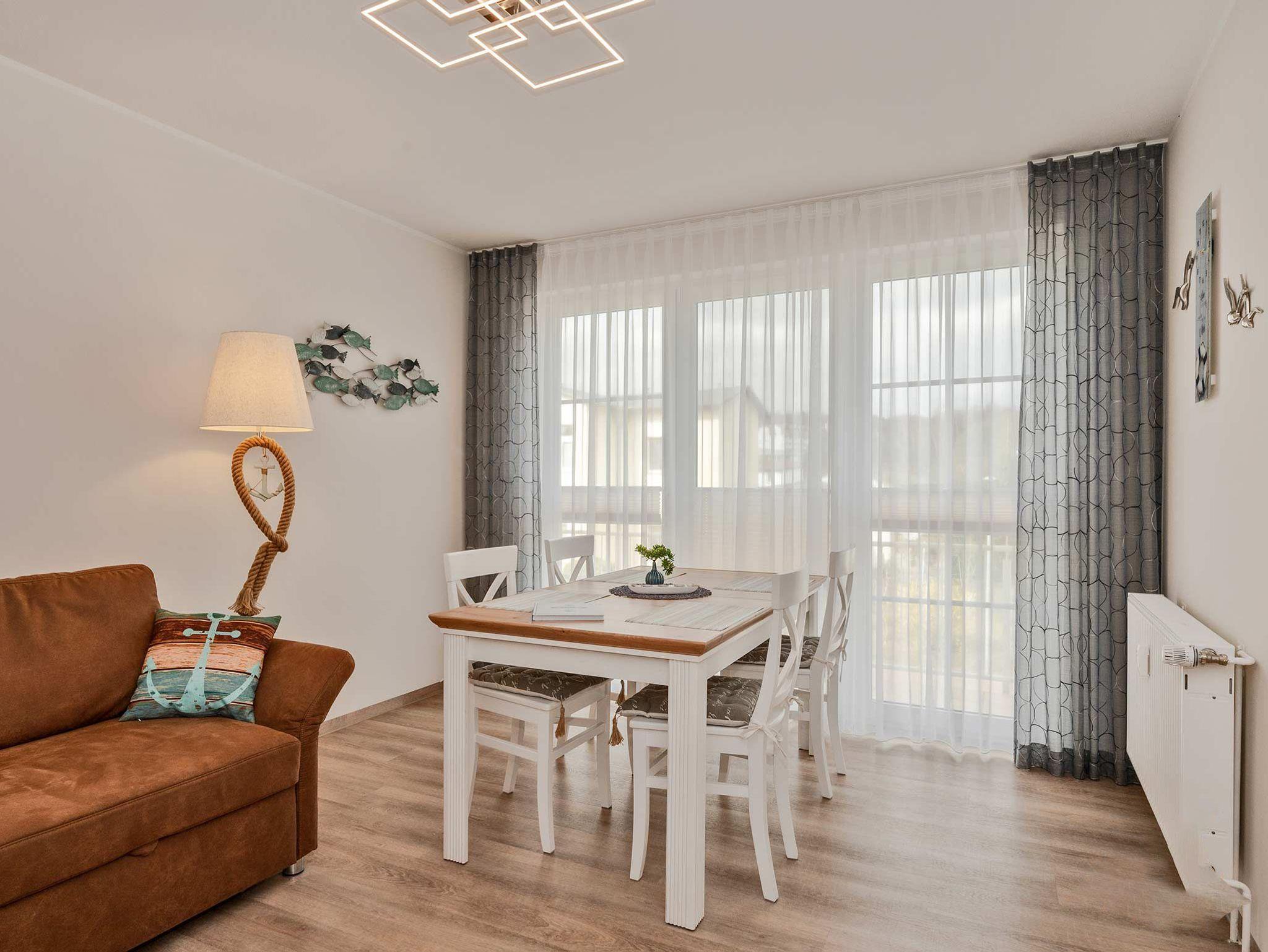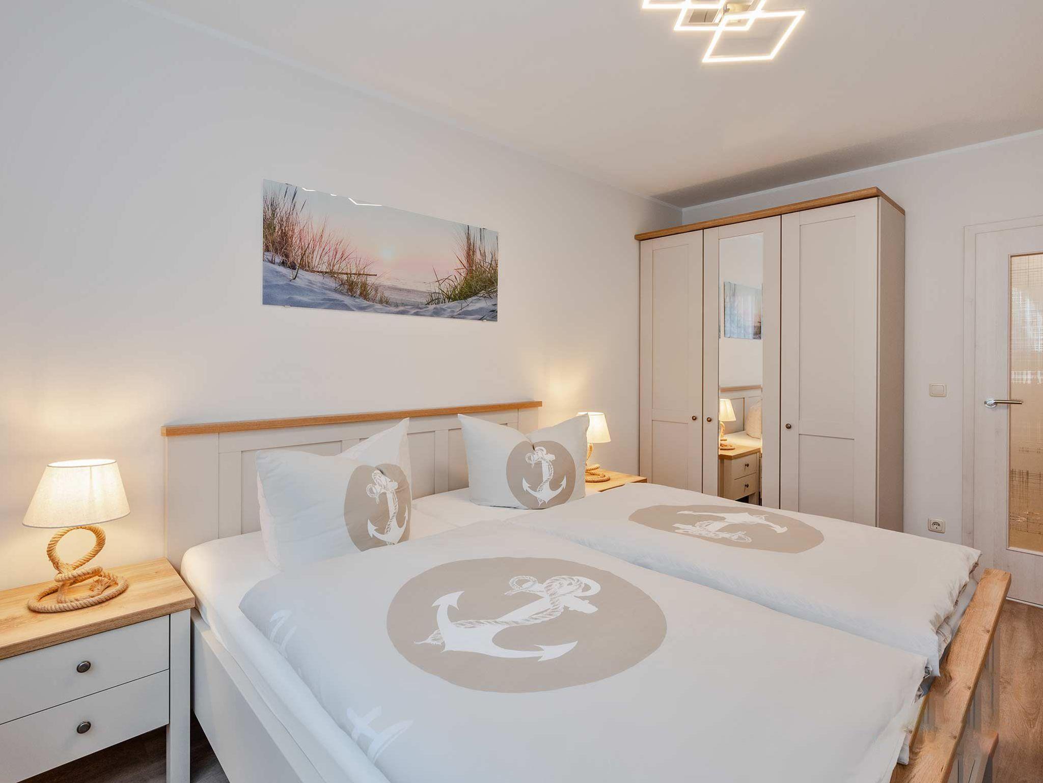 Die moderne 2- Raum Ferienwohnung befindet sich im 1. Obergeschoß der Villa Maria-Gabriele. Die Wohnung wurde im Jahr 2022 komplett modernisiert und mit viel Liebe zum Detail eingerichtet. Auf 44 qm erwartet sie ein gemütliches Wohnzimmer mit einer ausziehbaren Schlafcouch (Aufbettung für 3.+4. Pers. 1,80 x 2,00m), Smart- TV sowie einem Esstisch. Vom Wohnzimmer aus gelangen Sie auch auf den möblierten Balkon in Nord- West Lage. Die voll ausgestattete Küche ist mit Spülmaschine, Backofen, Ceran- Kochfeld, Mikrowelle, Kühlschrank mit Gefriermöglichkeit, Wasserkocher, Toaster und Kaffeemaschine ausgestattet und lässt keine Wünsche offen. Das Schlafzimmer verfügt über ein Doppelbett (1,80 m x 2,00 m), Smart-TV und einem Kleiderschrank. Das maritime Badezimmer ist mit Dusche, WC, Föhn und Waschmaschine ausgestattet. Ein Kinderbett, Kinderhochstuhl sowie Kindergeschirr stehen Ihnen kostenfrei zur Verfügung.