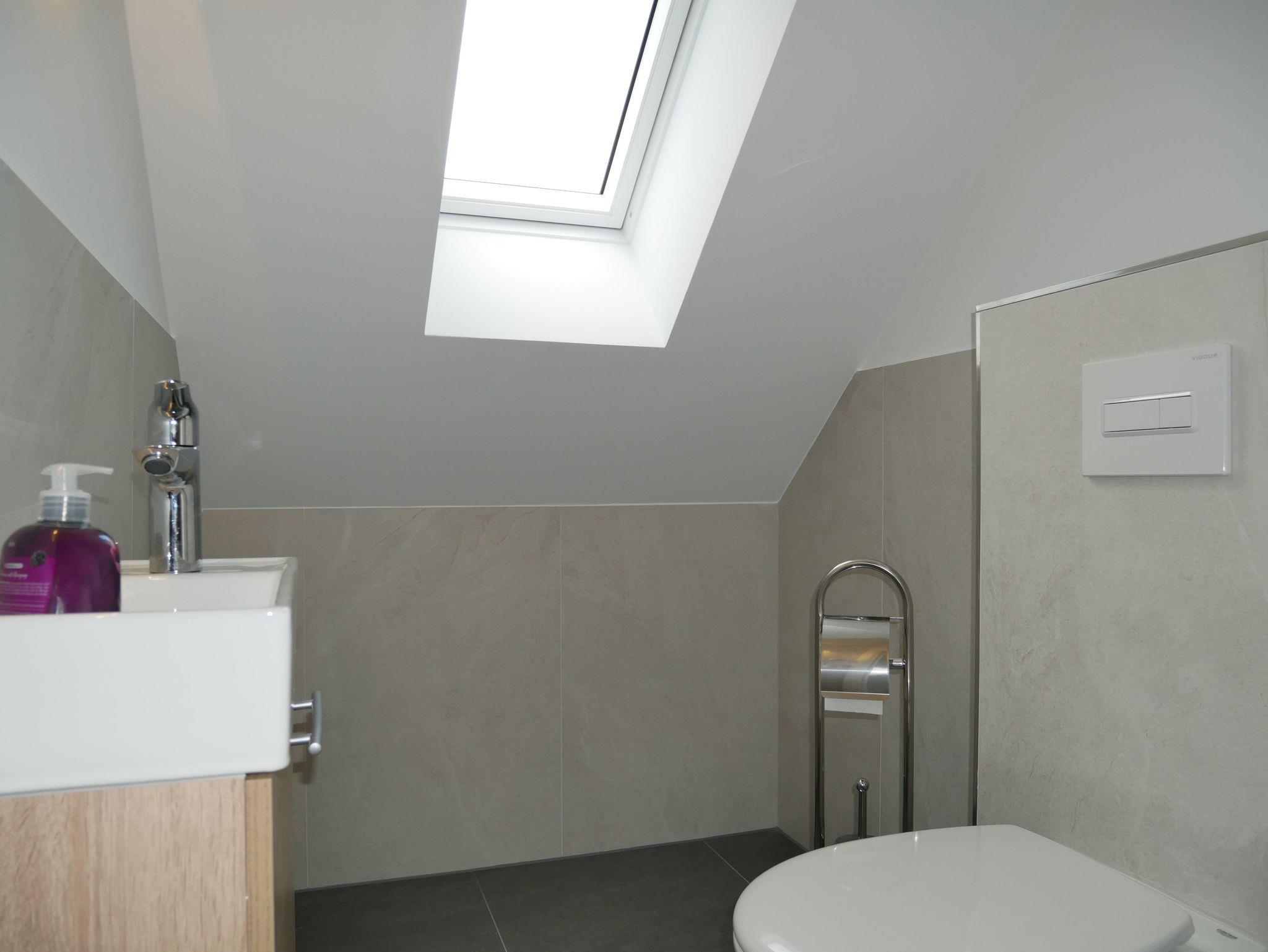 Das helle Tageslichtbad ist mit zwei Waschbecken, einem WC sowie einer ebenerdigen Dusche ausgestattet und verfügt über ein Fenster zur natürlichen Belüftung. Im Obergeschoss befindet sich ein zusätzliches WC.
