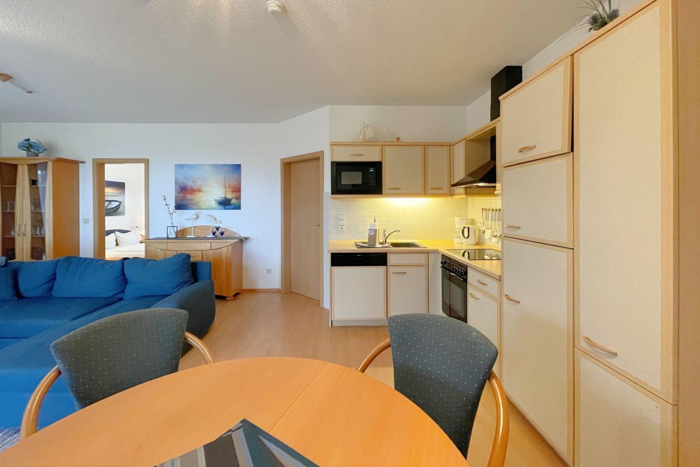 Die offene Küche öffnet sich zum Wohnzimmer und ist mit modernen Annehmlichkeiten wie einem Backofen, einer Mikrowelle, einem Cerankochfeld und einer Geschirrspülmaschine ausgestattet. So wird das Zubereiten von köstlichen Mahlzeiten zum Vergnügen. Für gesellige Essensmomente steht Ihnen ein gemütlicher Esstisch zur Verfügung. Das Wohnzimmer ist geschmackvoll eingerichtet und bietet eine Sofaecke, in der Sie entspannen und den Abend bei einem guten Film auf dem digitalen Fernseher ausklingen lassen können.