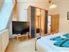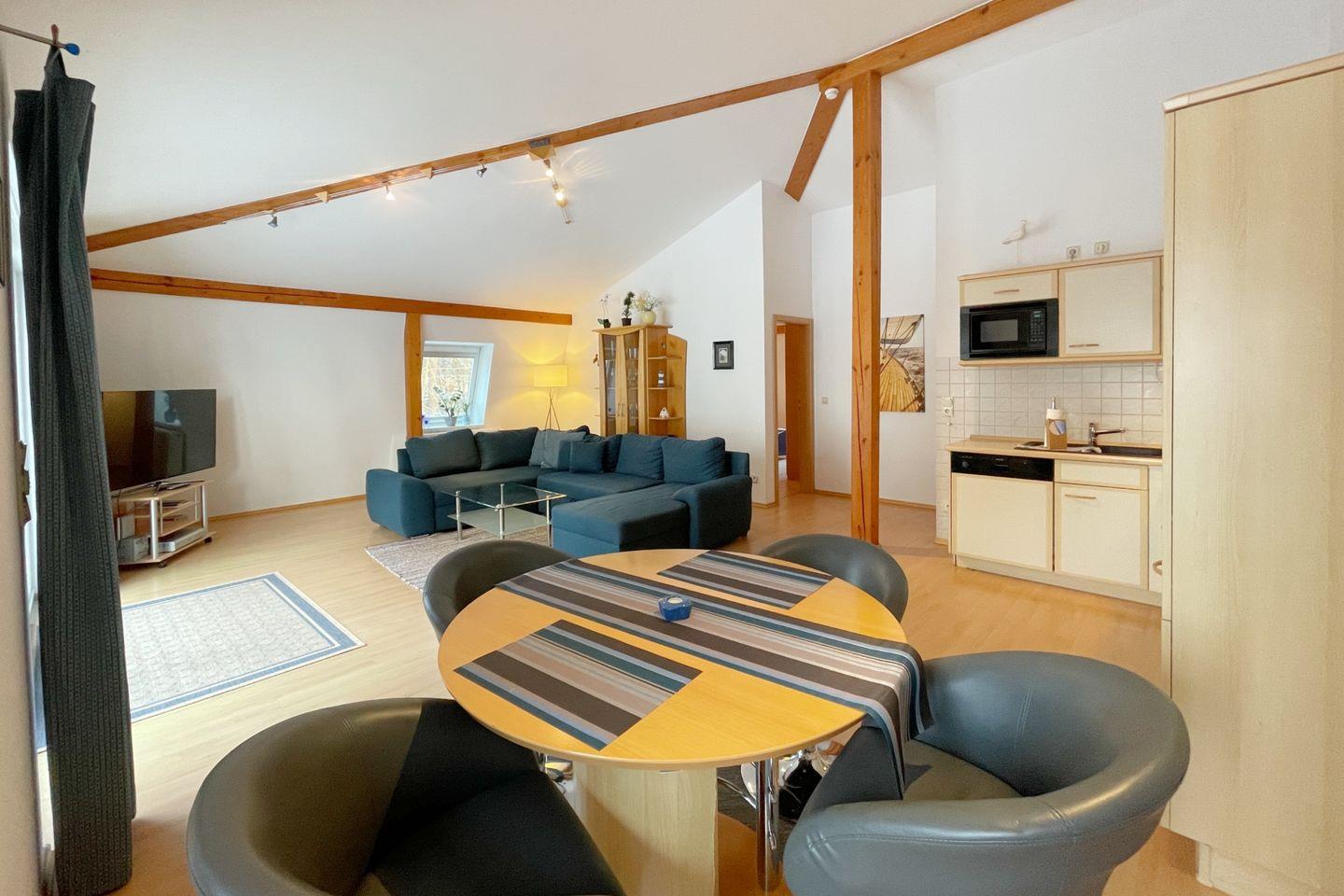 Die Wohnung umfasst ein Schlafzimmer und ein modernes Badezimmer mit Dusche – ideal für entspannte Stunden nach einem aktiven Tag am Strand. Der offen gestaltete Wohnbereich mit gemütlicher Sofaecke und Essbereich lädt zu geselligen Abenden ein. Für die Unterhaltung sorgt eine moderne HiFi-Anlage sowie zwei digitale TV-Geräte für gemütliche Filmabende.