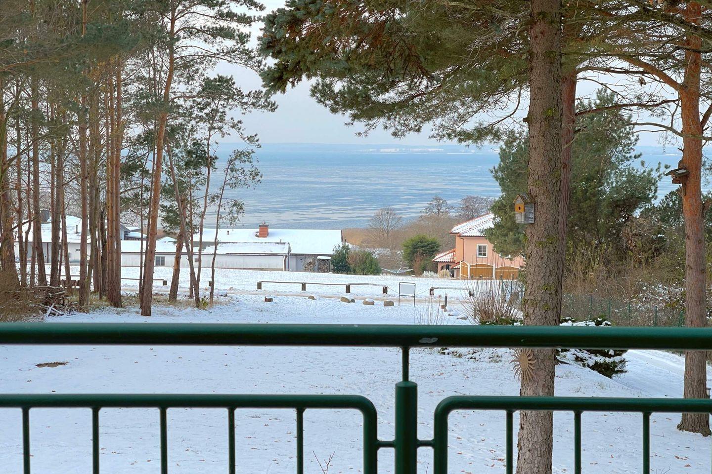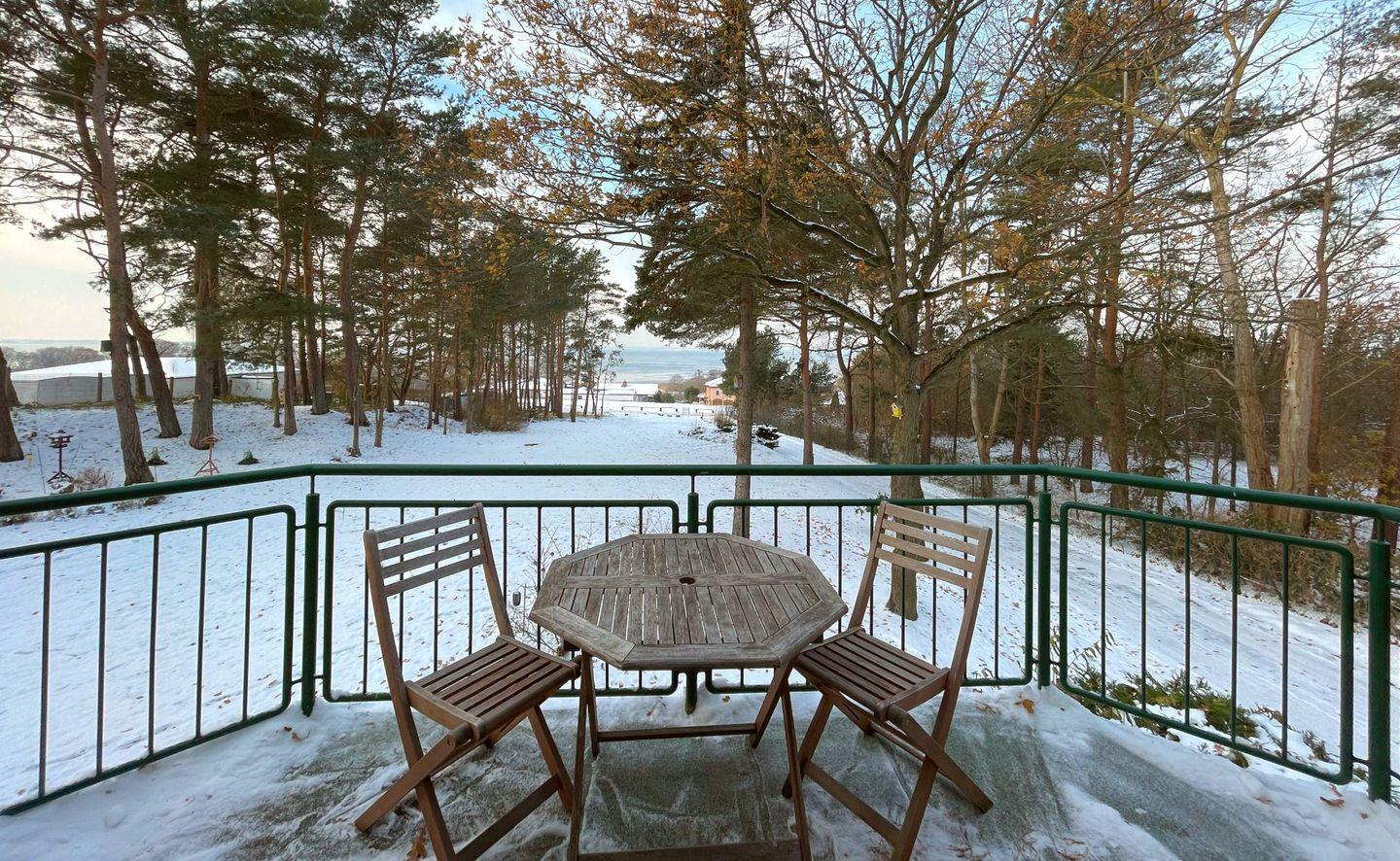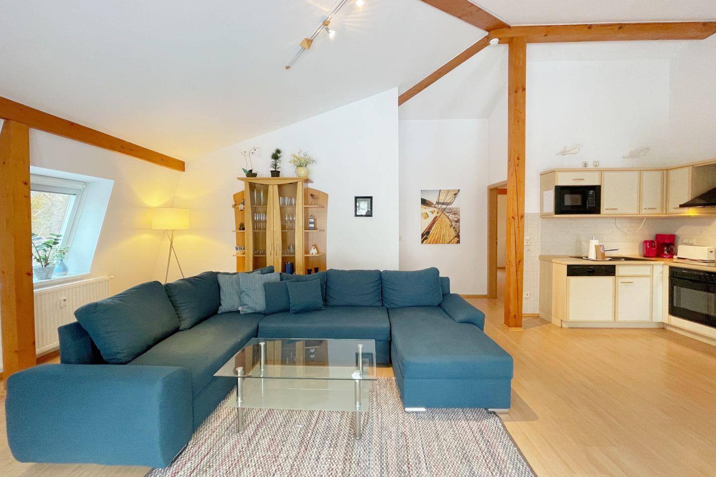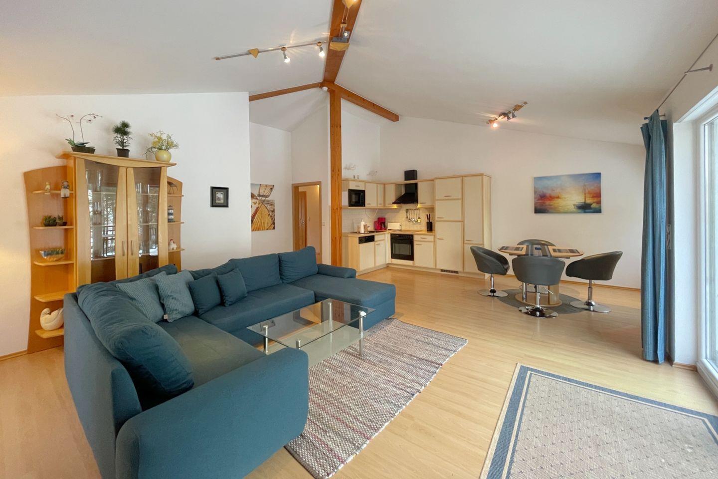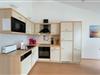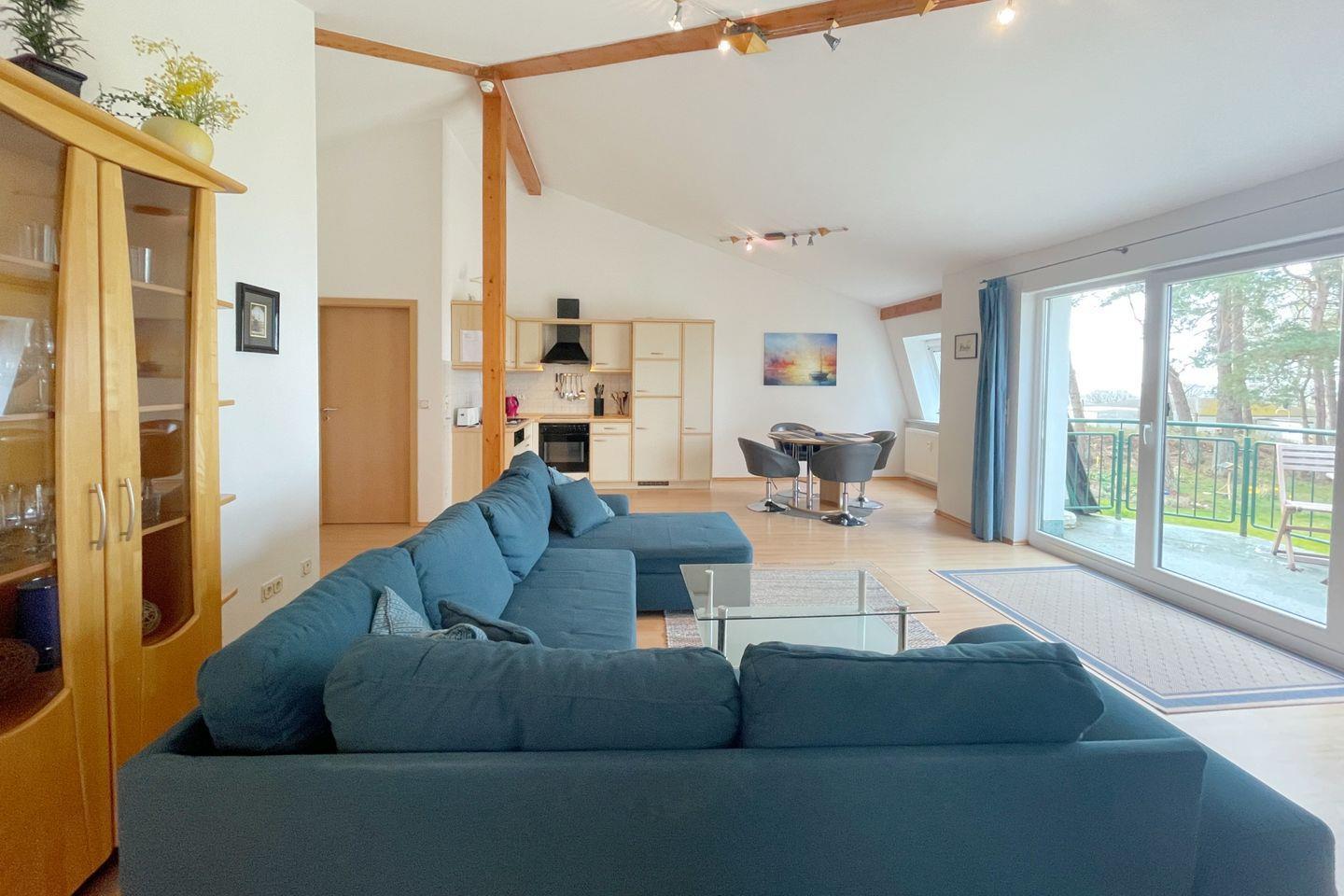 Die offene Küche ist komplett ausgestattet mit hochwertigen Küchenutensilien, einem Cerankochfeld, Backofen, Mikrowelle, Kühlschrank mit Gefrierfach, Geschirrspüler und einer Kaffeemaschine – hier können Sie im Handumdrehen köstliche Gerichte zubereiten. Von der Küche aus gelangen Sie direkt auf den Balkon, auf dem Sie bei einem Glas Wein den herrlichen Blick auf die umliegende Natur und das Achterwasser genießen können.