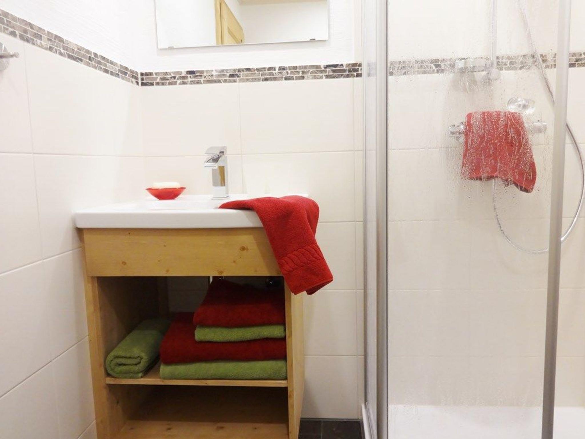 Badezimmer mit Dusche, WC, Handtuchtrockner und Fön, Dusch- und Handtücher