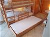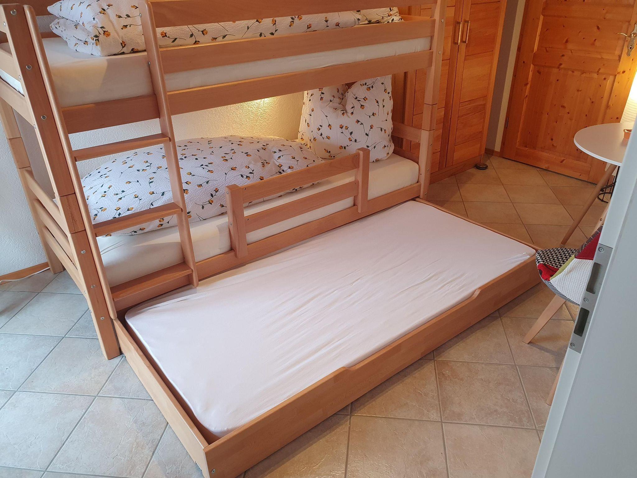Innen erwartet Sie ein großzügiger Wohn- und Essbereich, eine voll ausgestattete Küche mit Thermomix, Geschirrspüler, Mikrowelle, Backofen, Kaffeemaschine, Wasserkocher und Toaster sowie ein schönes Badezimmer mit Dusche, Badewanne und WC. Ein Elternschlafzimmer und ein gemütliches Kinderzimmer mit Stockbett sorgen für erholsame Nächte. Ergänzt wird das Stockbett durch ein herausrollbares Zusatzbett, welches individuell im Zimmer platziert werden kann. Die Matratze ist 12 cm stark und liegt einem Lattenrost auf. Die Polstergarnitur im Wohnbereich ist auf 1,50 m mal 2,00 m ausziehbar.