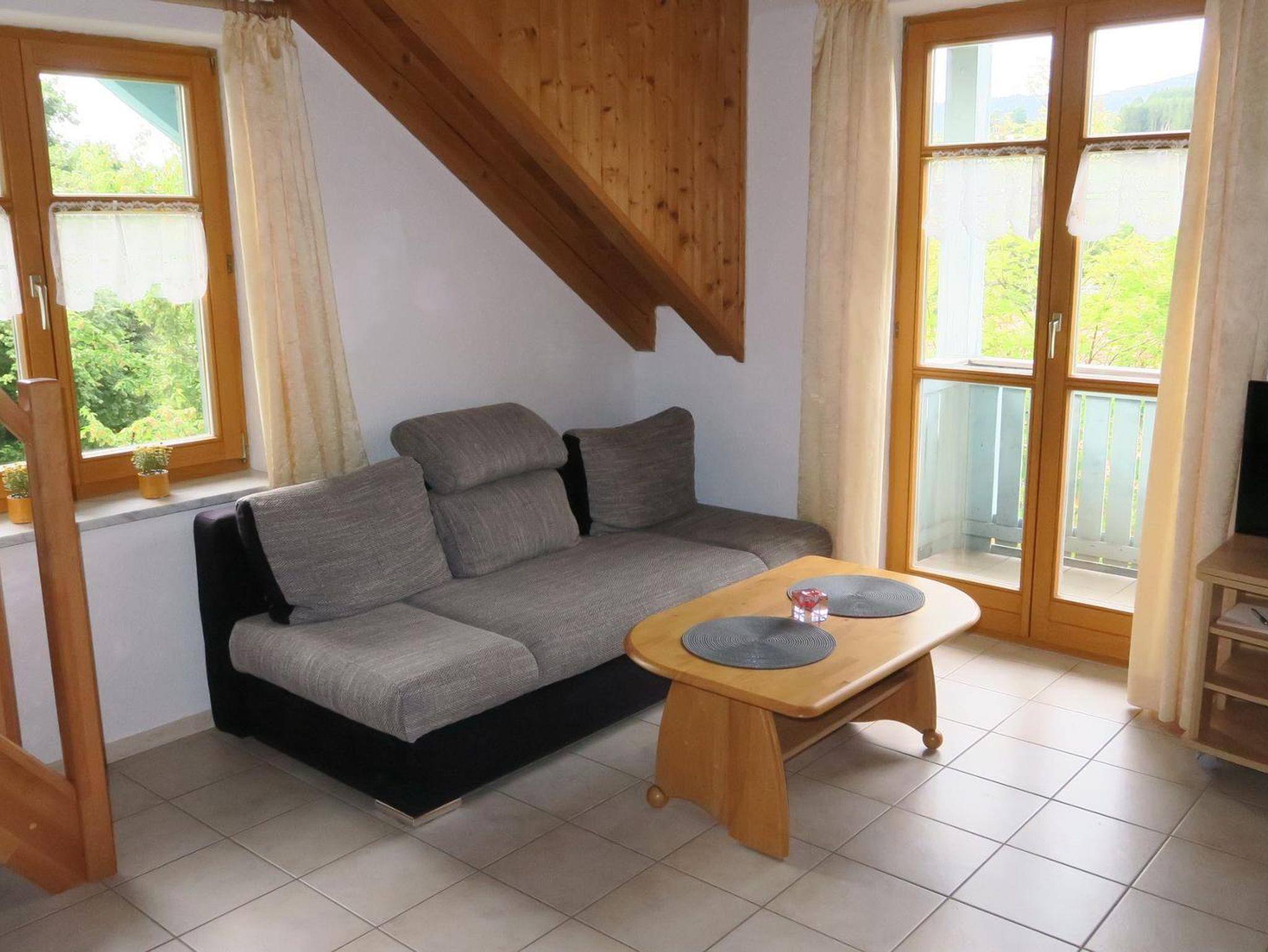 Herzlich Willkommen in der Ferienwohnung Osserpanorama! Sie befindet sich ca. 5 Gehminuten vom Haus Osserblick entfernt in einer kleinen Anlage und bietet neben einem großen Balkon einen herrlichen Bergblick auf den Osser. Wegen der Hanglage erreicht man das 2. Obergeschoss über eine einzige Treppe (so als ob es sich um das 1.OG handeln würde). Die FeWo ist für max. 4 Personen geeignet (2 Erw./2 Ki oder max. 3 Erw.) geeignet. Sie ist ca. 44qm groß und verfügt über ein Wohnzimmer mit Küche und einem ausziehbaren Schlafsofa (140x200 cm), ein Schlafzimmer mit Doppelbett (180x200 cm) und eine Galerie mit 2 Betten (jeweils 90x200 cm). Das Wohn/Esszimmer ist mit einer Eckbank für 4 Pers. und einem Flat_TV ausgestattet. Vierplattenkochfeld mit Backofen, Kühlschrank, Kaffeemaschine, Wasserkocher u. Toaster sind vorhanden. Das Badezimmer verfügt über eine Dusche und WC. Die Wohnung wird über eine Fußbodenheizung beheizt.
