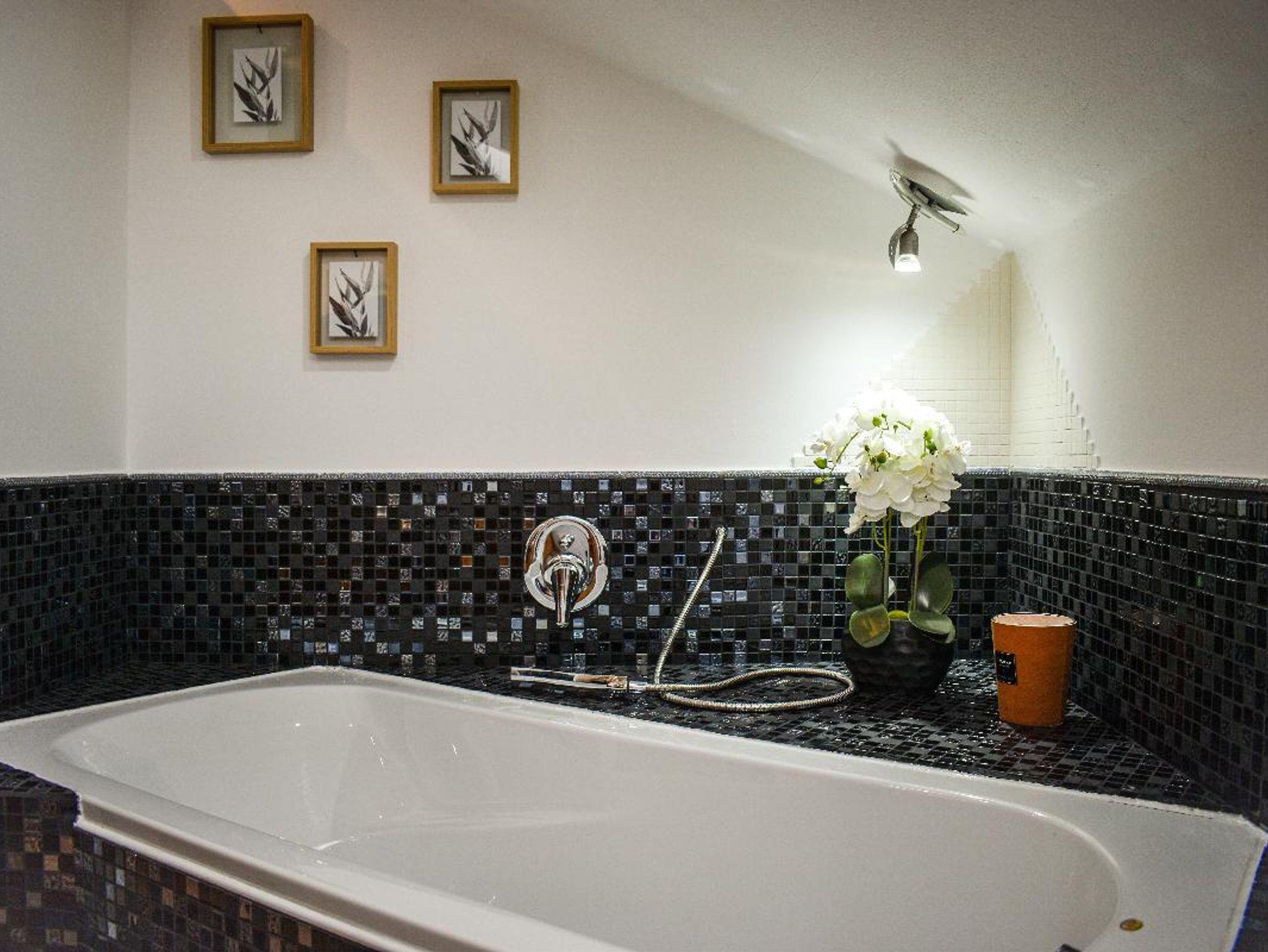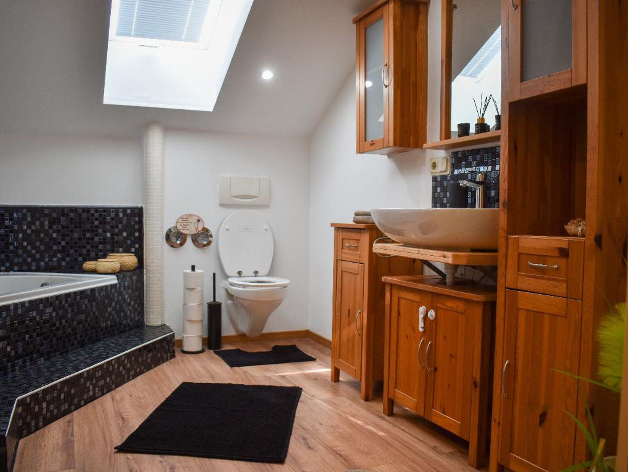 Das Badezimmer ist ausgestattet mit einer Eckbadewanne, Dusche und WC.