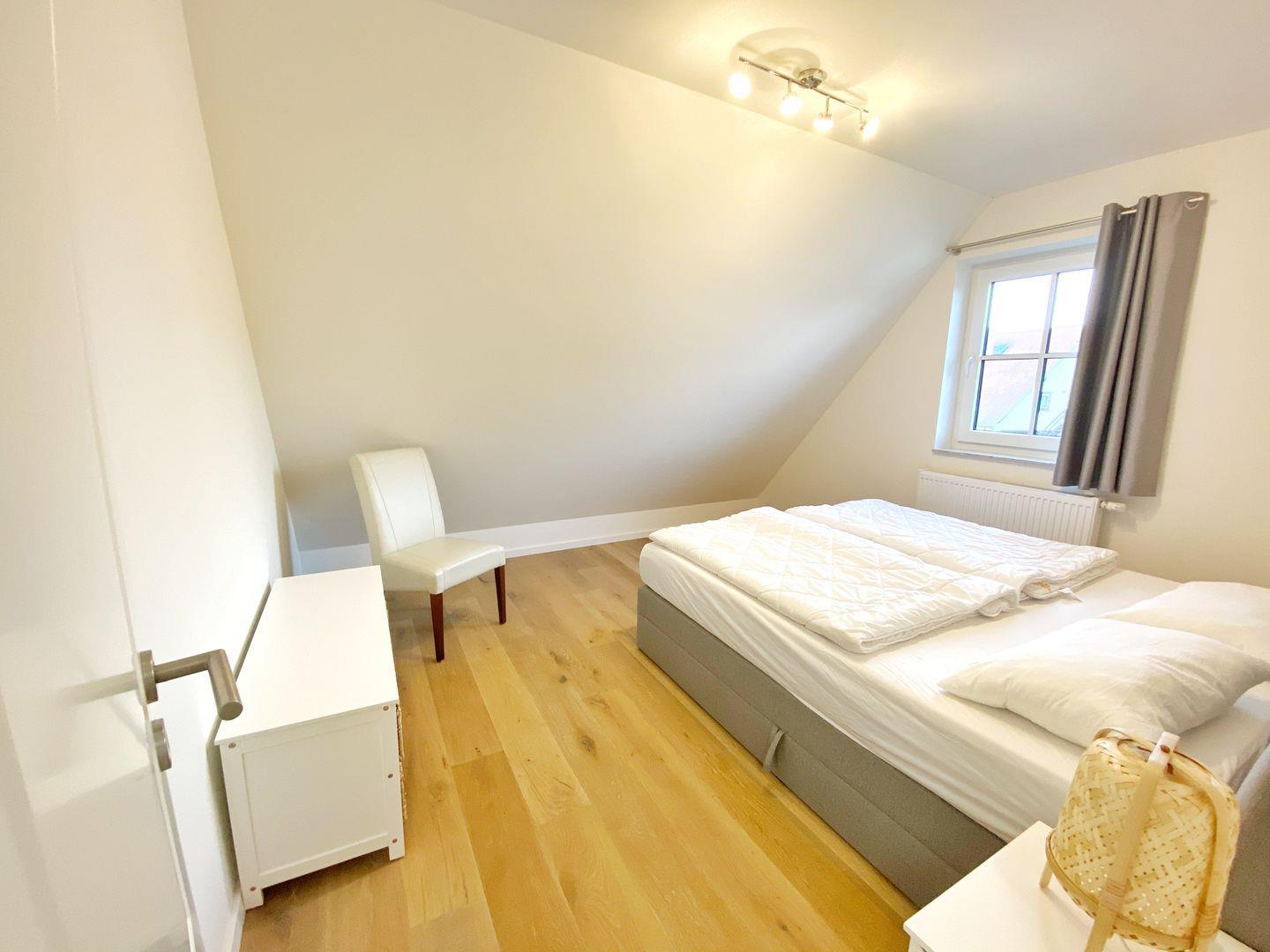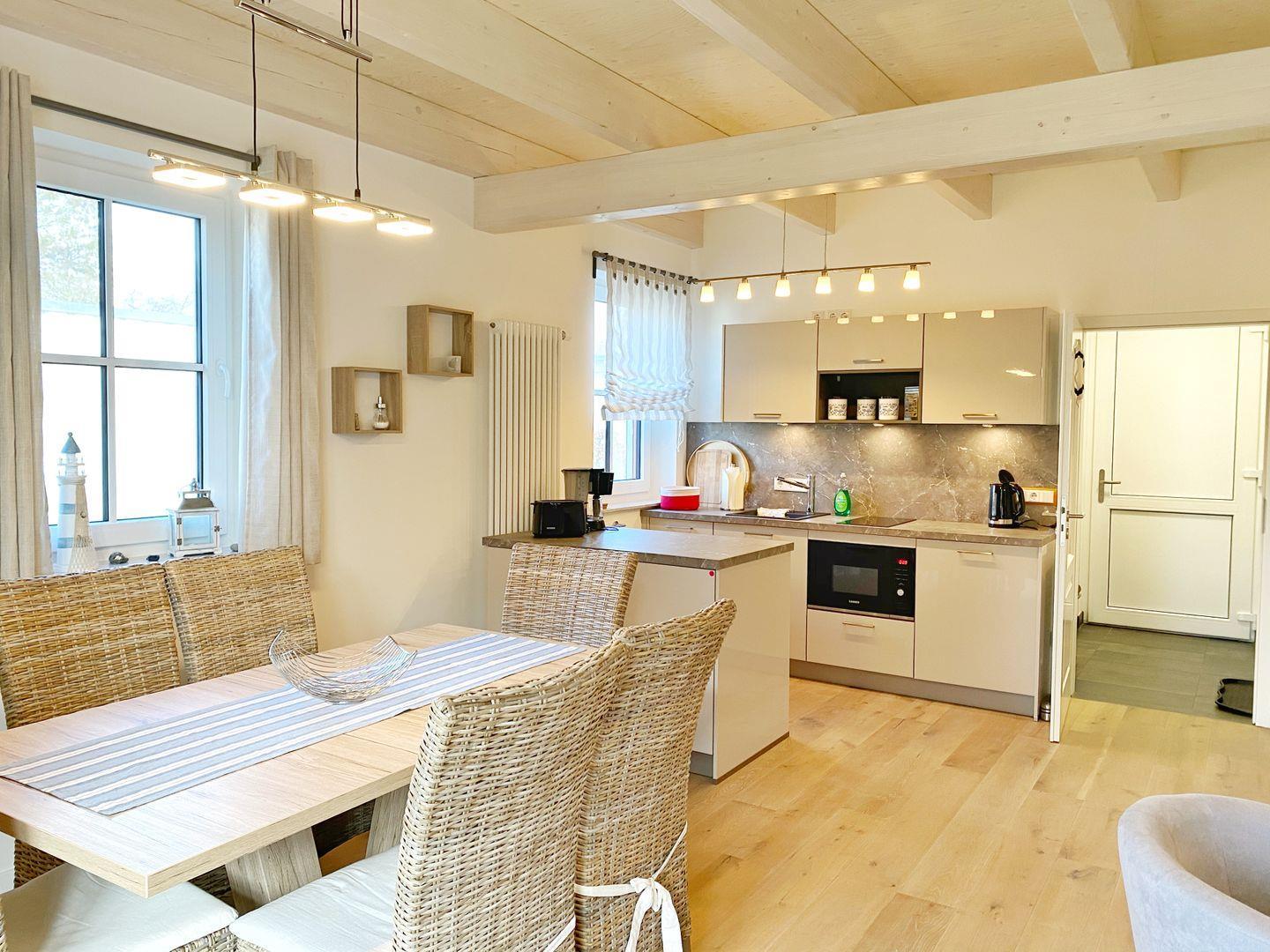 Auf 87qm Wohnfläche finden 4 Personen ausreichend Platz. Im Erdgeschoß der Doppelhaushälfte befindet sich das gemütliche Wohn-Esszimmer mit offener Küche. Von dort gelangt man auf die vorgelagerte Terrasse und in den Garten. Der Wohnbereich ist in warmen Farben und Holzoptik gemütlich und modern eingerichet. Die moderne Einbauküche verfügt über Geschirrspüler, Induktionsherd, Mikrowelle, Kühlschrank mit Gefrierfach, Wasserkocher, Kaffeemaschine Toaster und zahlreiche Küchenutensilien. Im Obergeschoß befinden sich die beiden Schlafzimmer. Das eine Schlafzimmer verfügt über ein bequemes Boxspring-Doppelbett und das andere Schlafzimmer über ein Einzelbett, welches man durch Auszug zu einem Doppelbett vergrößern kann. Im Haus gibt es zwei Bäder, ein kleineres im Erdgeschoß mit Dusche. Das größere Bad im Obergeschoß verfügt zusätzlich zur Dusche auch über eine Badewanne. Zum Haus gehört eine Terrasse mit Gartenmöbeln, ein Carport für den Pkw und ein Schuppen im Garten.