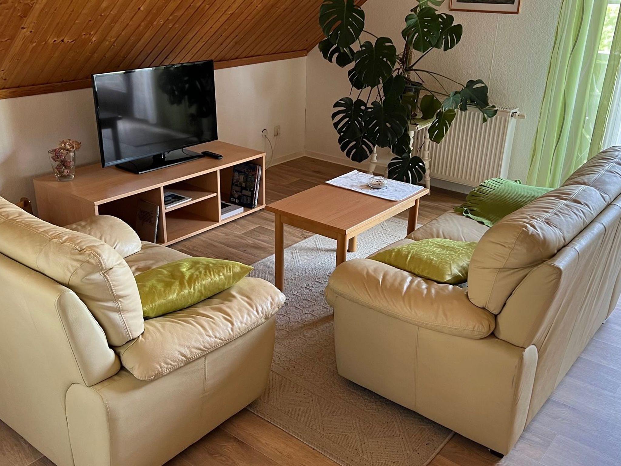? großzügiger Wohnraum mit Couchgarnitur, Flachbild-TV und Radio
