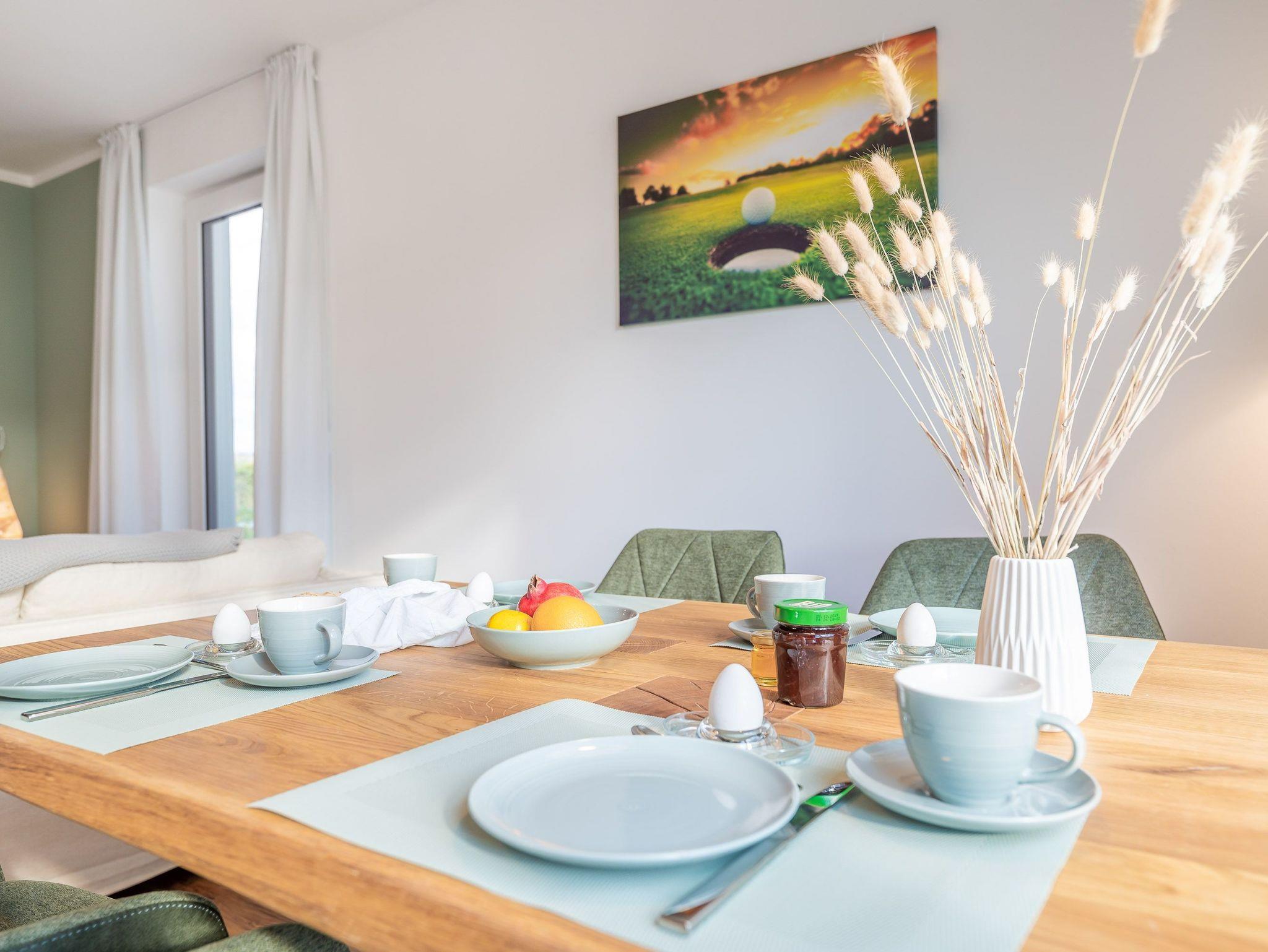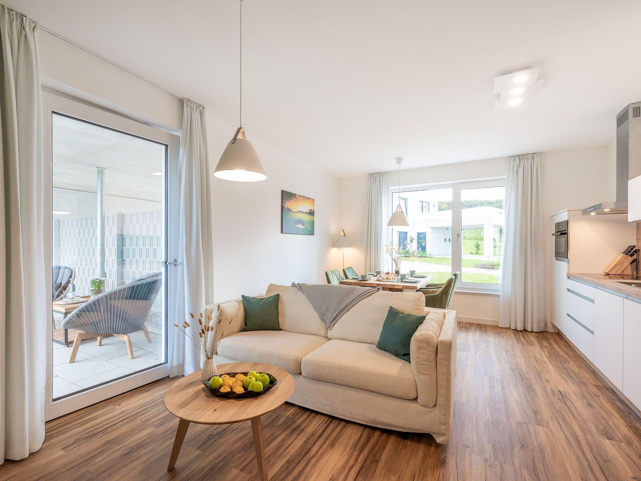 Moderne Ferienwohnung mit Wellnessbad, Terrasse und Golfplatzblick in Lohme, ideal für Naturliebhaber und Golfer.