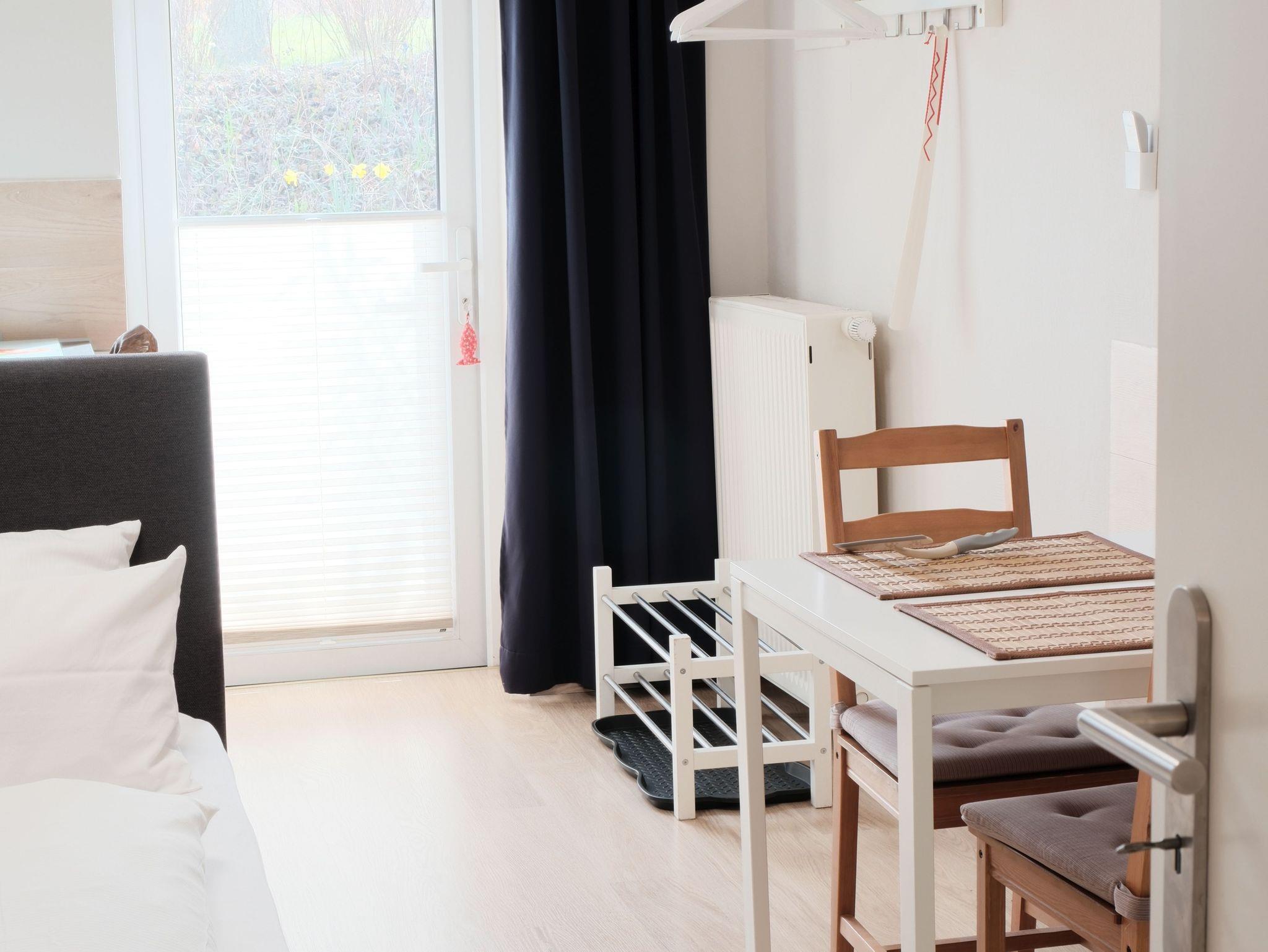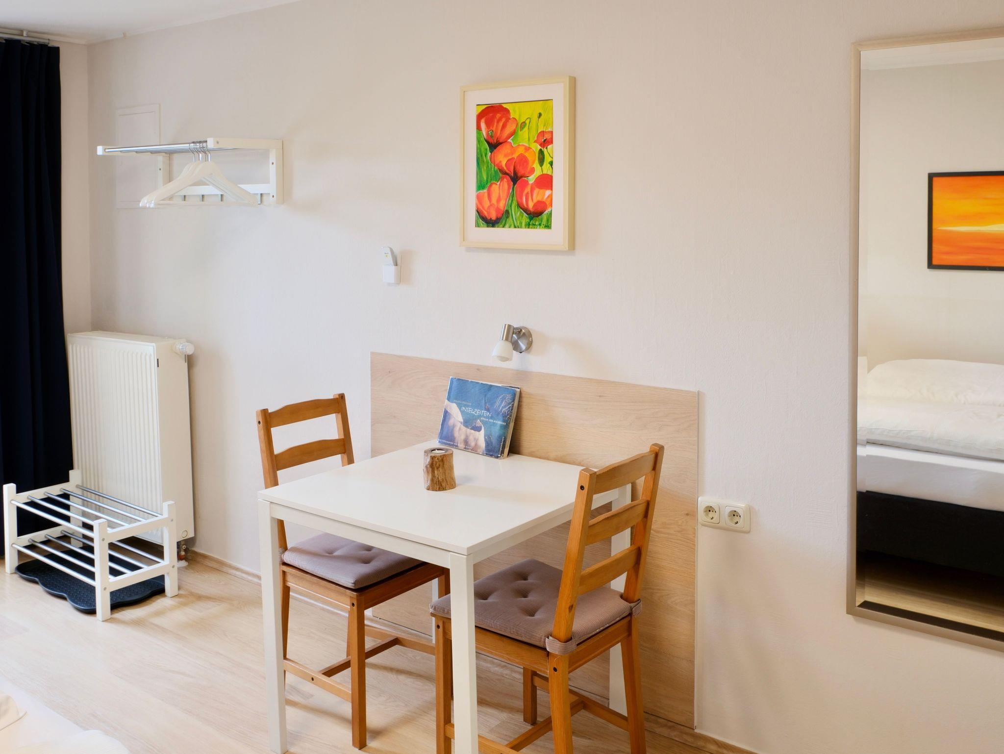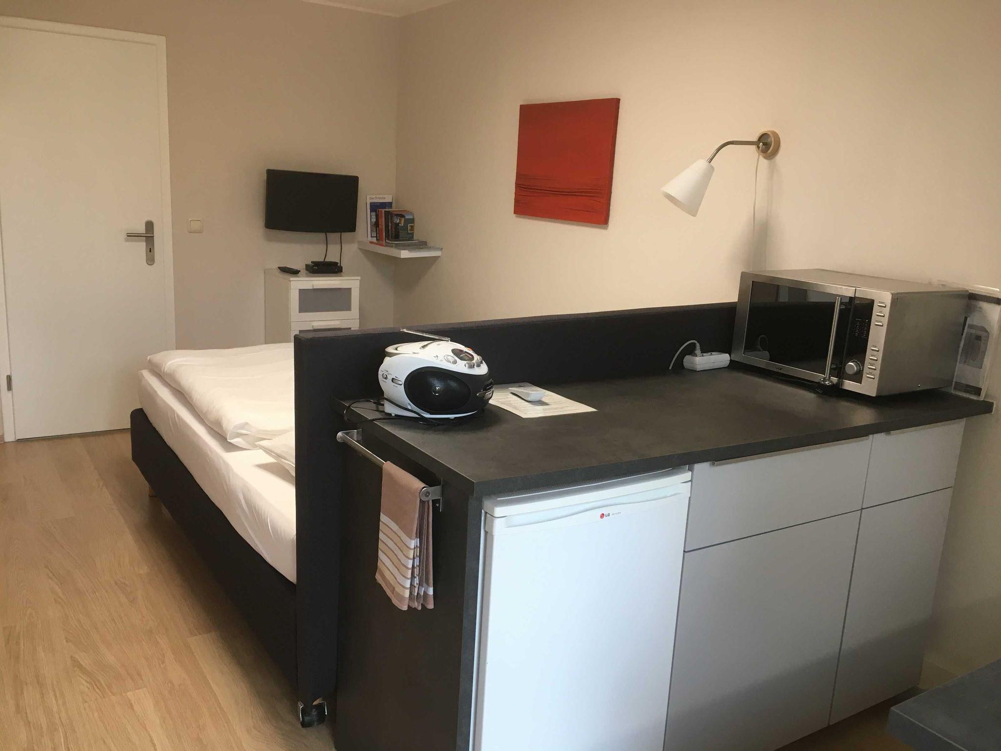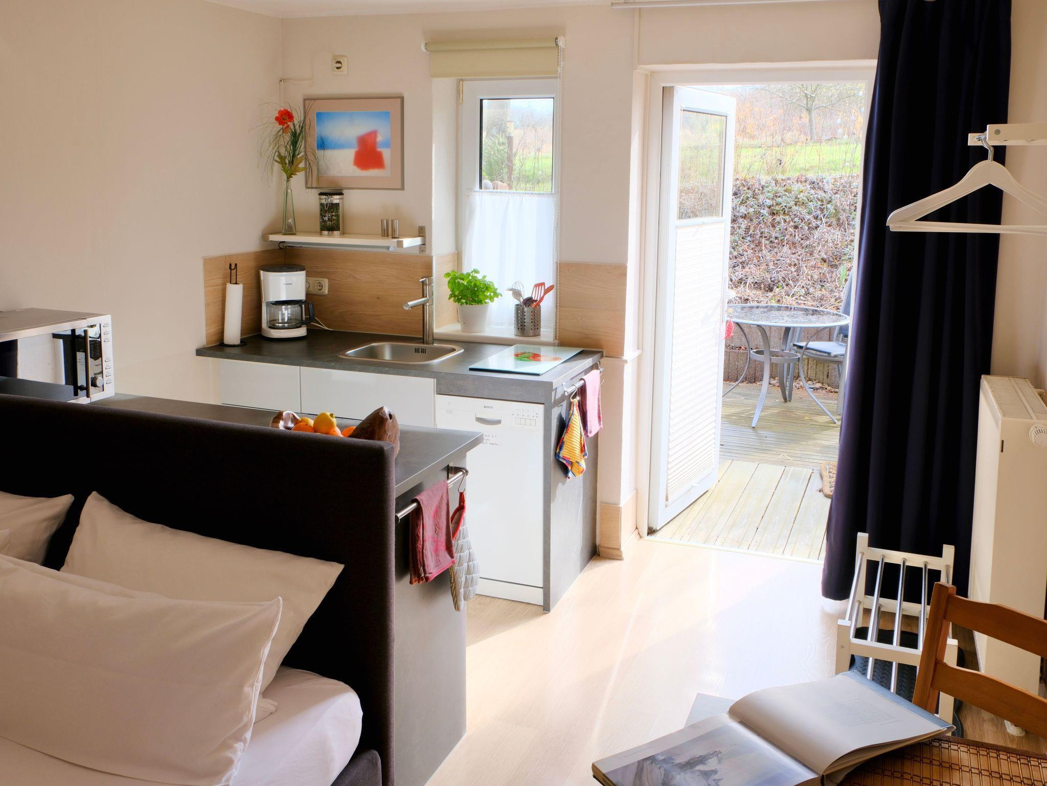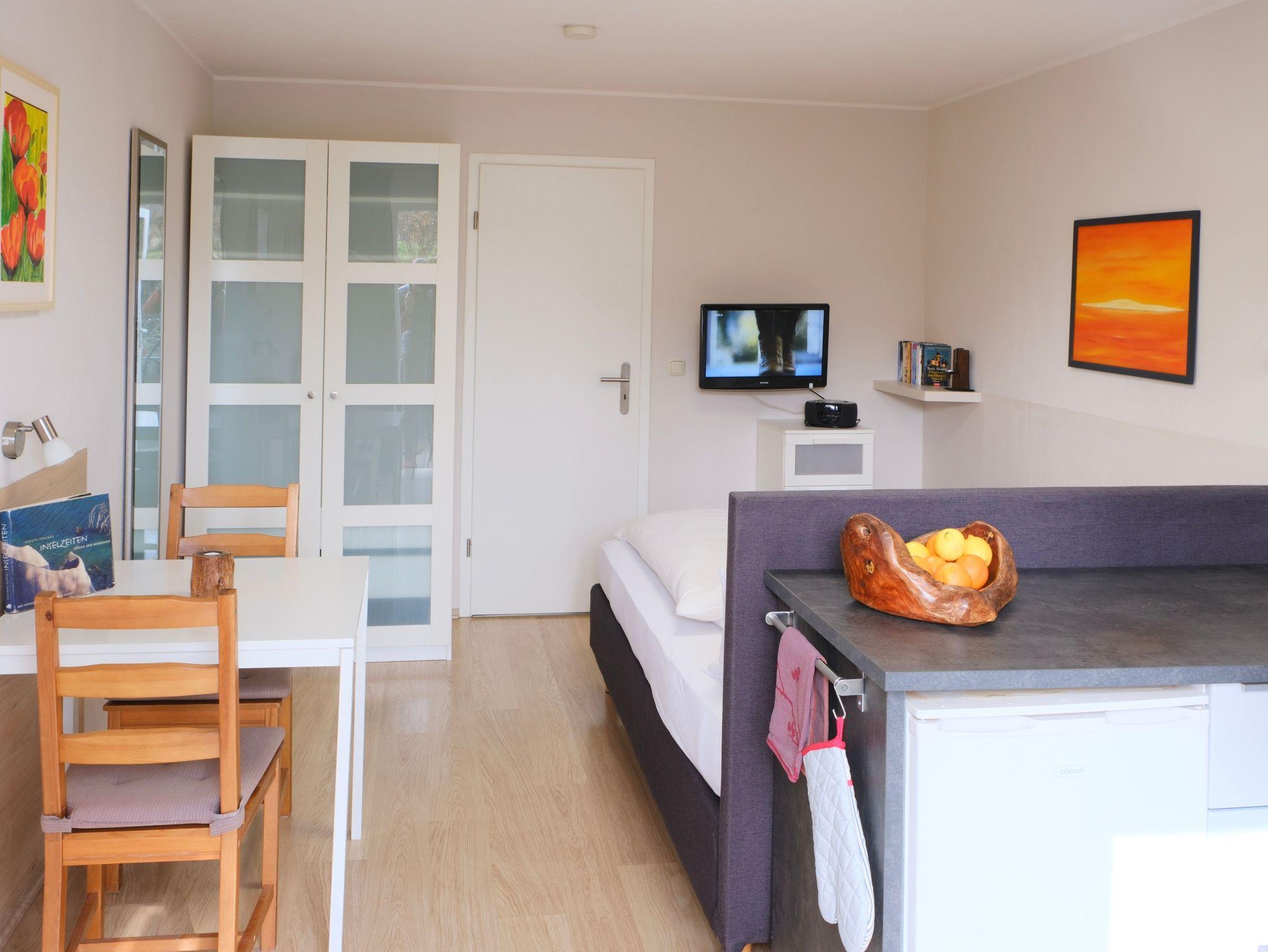 Das Studio Klatschmohn ist eine 20 qm große 1-Raum-Wohnung für 1 - 2 Personen und besteht aus einem kombinierten Wohn-/Schlafraum mit integrierter Küchenzeile, Bad, Terrasse (8 qm).