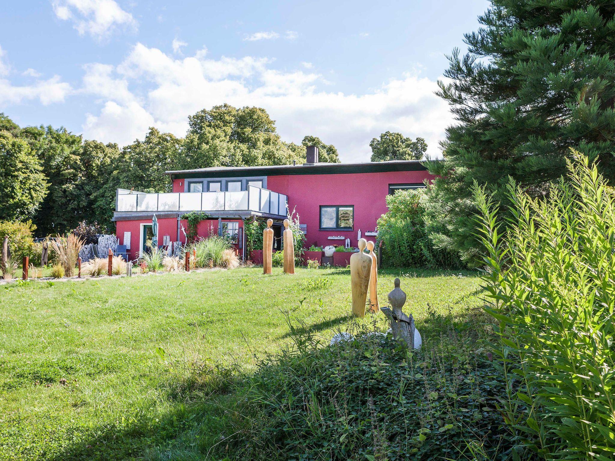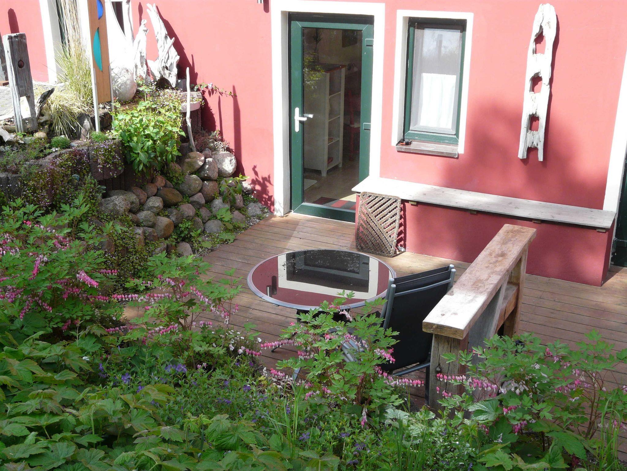 Zu jeder Wohnung gehört eine Außenterrasse mit Gartenmöbeln, Sonnenschirm und Grillmöglichkeit. Darüber hinaus finden Sie bei uns einen großen Natur- und Nutzgarten, in dem Sie neben vielfältig angelegten Beeten auch noch Wegrandblumen und Heilpflanzen sowie verschiedene Ruhezonen mit Sitzgruppen und Liegen zum Entspannen finden. Manchmal ganz offensichtlich, bisweilen recht versteckt können Sie im Garten Kunstobjekte des Hausherren entdecken und bei Gefallen käuflich erwerben.