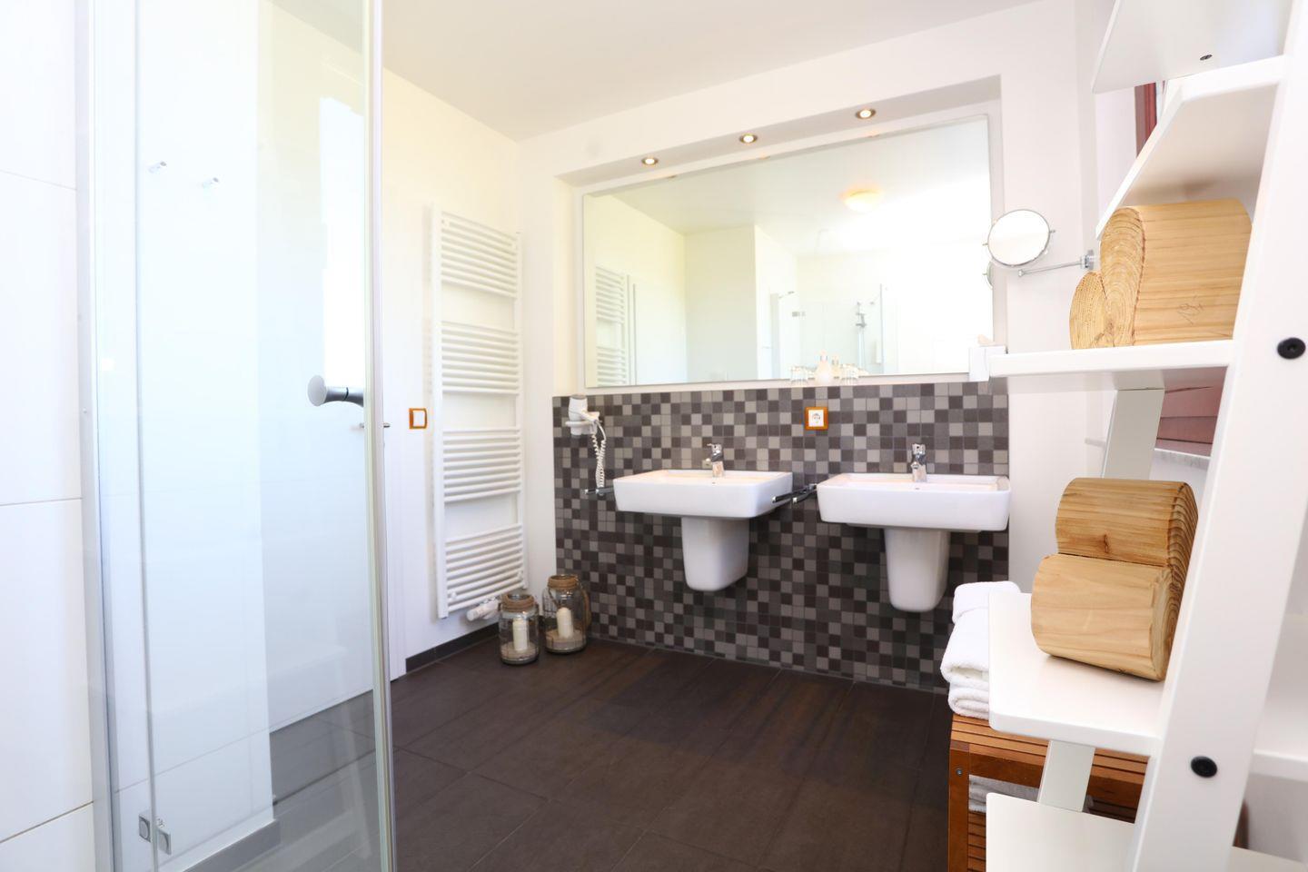 Einzigartig die Lage hoch über der Ostsee und direkt am Nationalpark Jasmund mit seiner berühmten Kreideküste. Entspannen und genießen Sie lichtdurchflutete Großzügigkeit pur verteilt auf 55 qm Wohnfläche. Großzügig und offen der helle Wohnbereich mit integrierter Küche und Essbereich. Ein Balkon geht von der Küche ab. Über den Wohnbereich gelangen Sie auf den großen zweiten Balkon. Beide bieten tolle Ausblicke - mal weitläufig über die Ostsee und den Golfplatz oder auf den wunderschönen Schlossgarten. Vom Flur gelangen Sie in das Wohlfühl-Schlafzimmer und das moderne Duschbad mit Blick auf die Ostsee. Da macht der erste Gang ins Bad richtig viel Freude. Nachts hört man die Bäume
