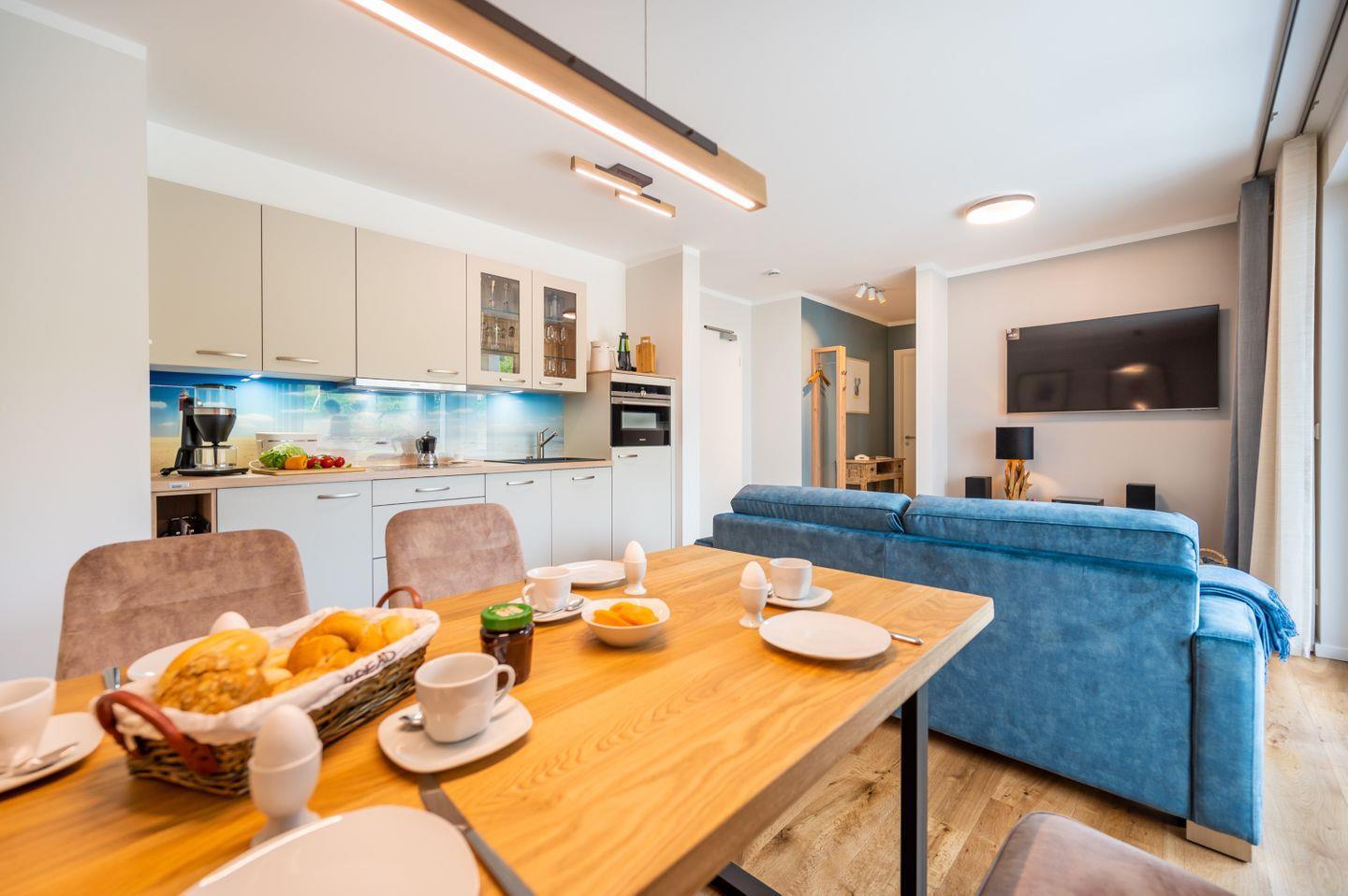 Die im Erdgeschoss gelegene Ferienwohnung verfügt über 2,5 Räume auf einer Wohnfläche von 58qm. Die Sonnenterrasse mit Gartenzugang bietet einen Ausblick auf den Golfplatz und Schloss Ranzow. Vom hochwertigen Entertainmentpaket, über Highspeed-Internet, Wellnessbad, vollausgestattete Küche, private Ladestation für Elektrofahrzeuge u.v.m.