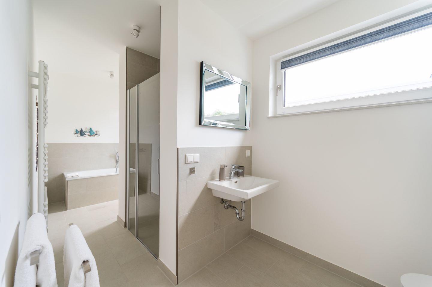 Das moderne Bad mit Dusche und Badewanne ermöglicht einen perfekten Start in den Tag.