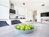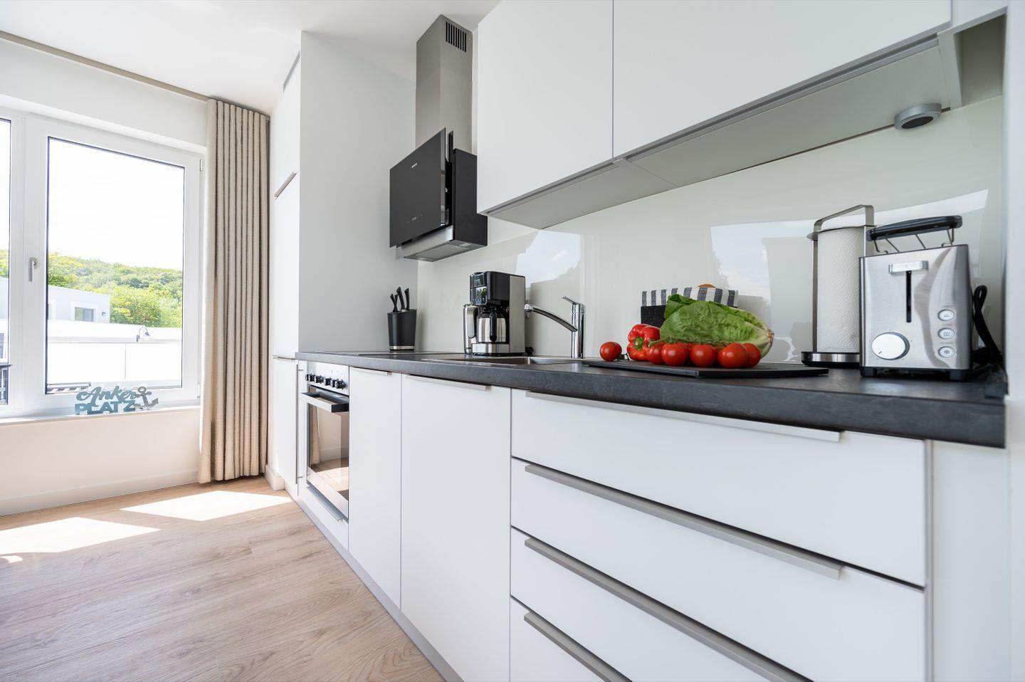 Hell und vollständig ausgestattet fügt sich die integrierte, moderne HANO-Einbauküche (Zeile) exzellent ein. Herd, Backofen, Kühlschrank mit Gefrierfach, Geschirrspülmaschine, Kaffeemaschine, Toaster, Wasserkocher und vieles mehr, die Küchenausstattung lässt keine Wünsche offen.