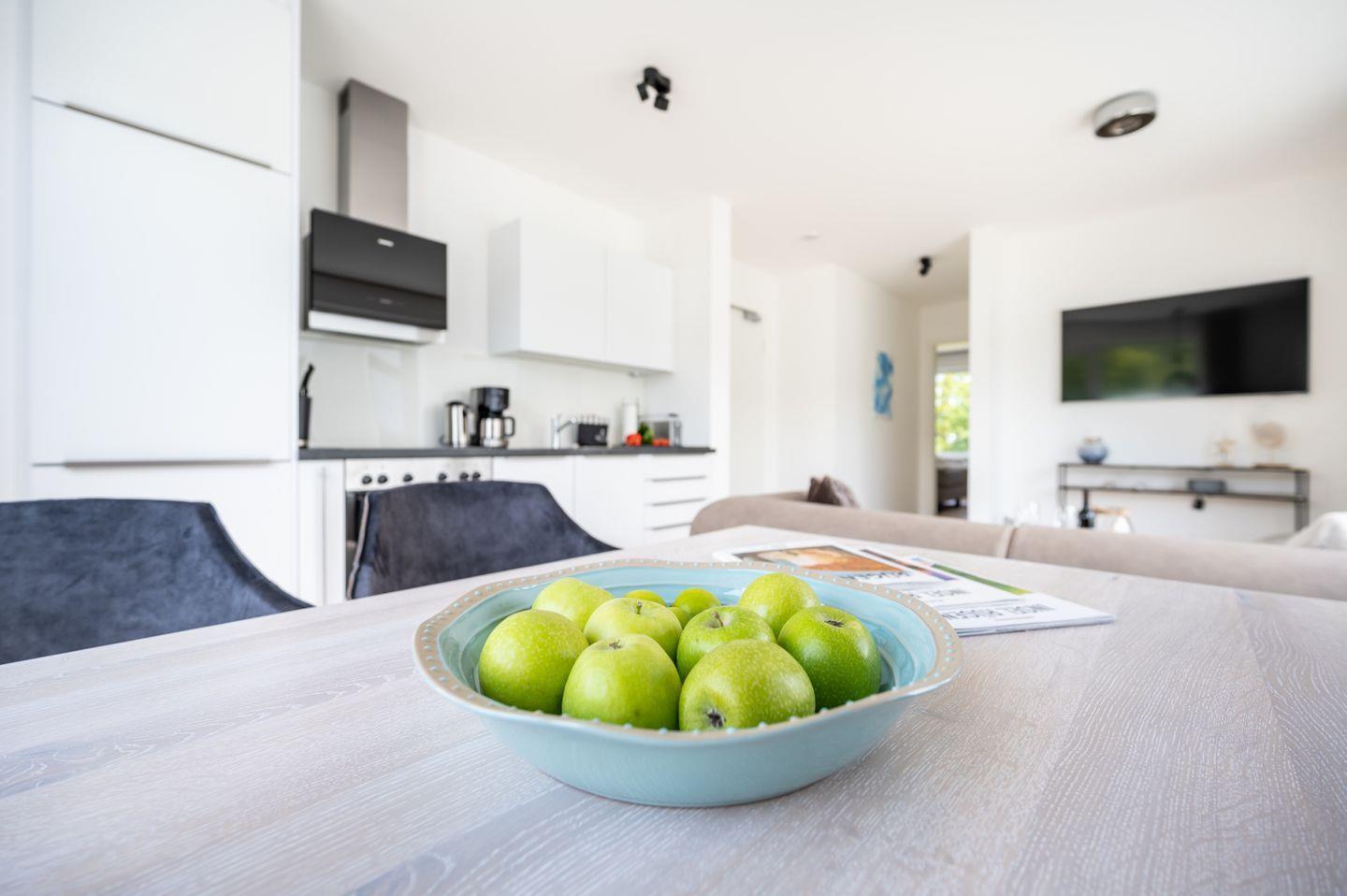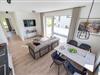Im modern ausgestatteten, lichtdurchfluteten Wohn-/Esszimmer erwarten Sie eine gemütliche Sitzecke mit einem Samsung Flat-TV (55 Zoll) und ein optisch getrennter Essbereich.