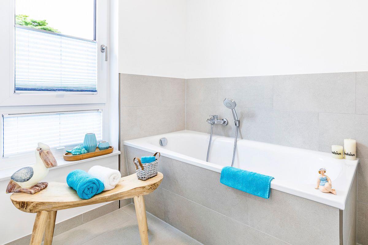 Das moderne Bad mit Dusche und Badewanne ermöglicht einen perfekten Start in den Tag.