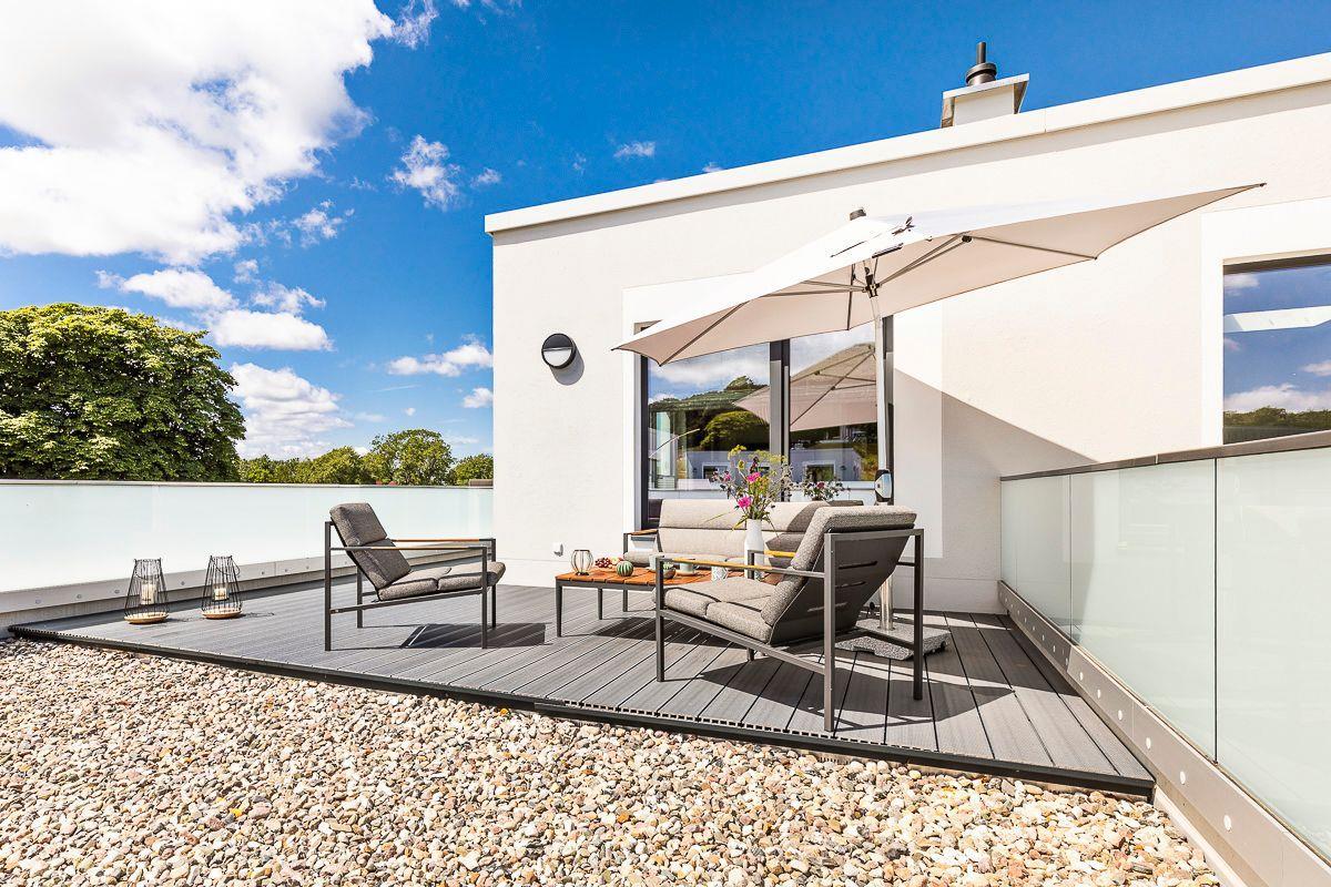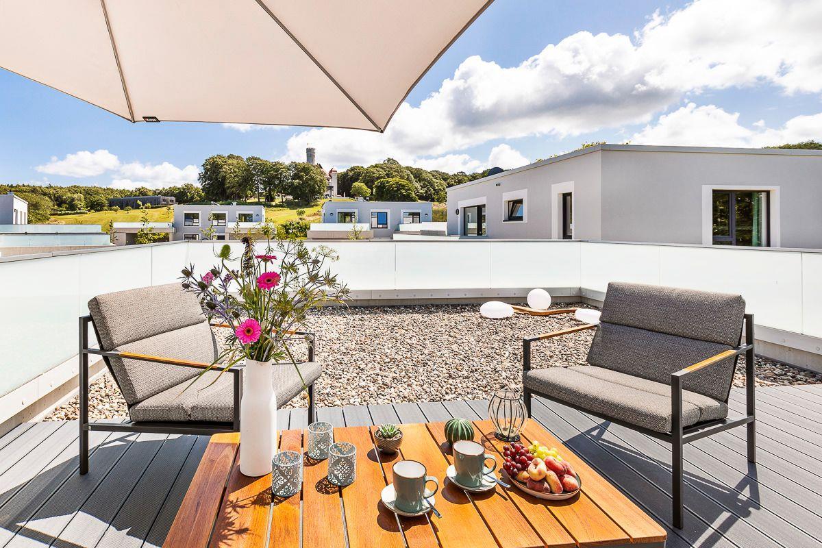 Das hier angebotene Appartement befindet sich im Obergeschoß der im März 2022 fertiggestellten Villa 19 und bietet auf einer komfortablen Wohnfläche von ca. 67 qm Wohnqualität höchsten Anspruches. Die aufgrund der optimalen Lage stets sonnenverwöhnte große Terrasse von über 40 qm bietet mit den hochwertigen Four-Season-Outdoor- 4SO- Design-Lounge-Möbeln und einem Strandkorb den perfekten Ort zum Entspannen. Zudem bietet sich ein fantastischer Blick auf das Schloss Ranzow und die einmalige Natur. Ein Sonnenschirm spendet bei Bedarf Schatten.