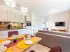 Die moderne Küchenzeile von Nobilia ist mit allem ausgestattet, was man im Urlaub benötigt, und gelungen in den offenen Wohn-/Essbereich mit Zugang zur Terrasse integriert.