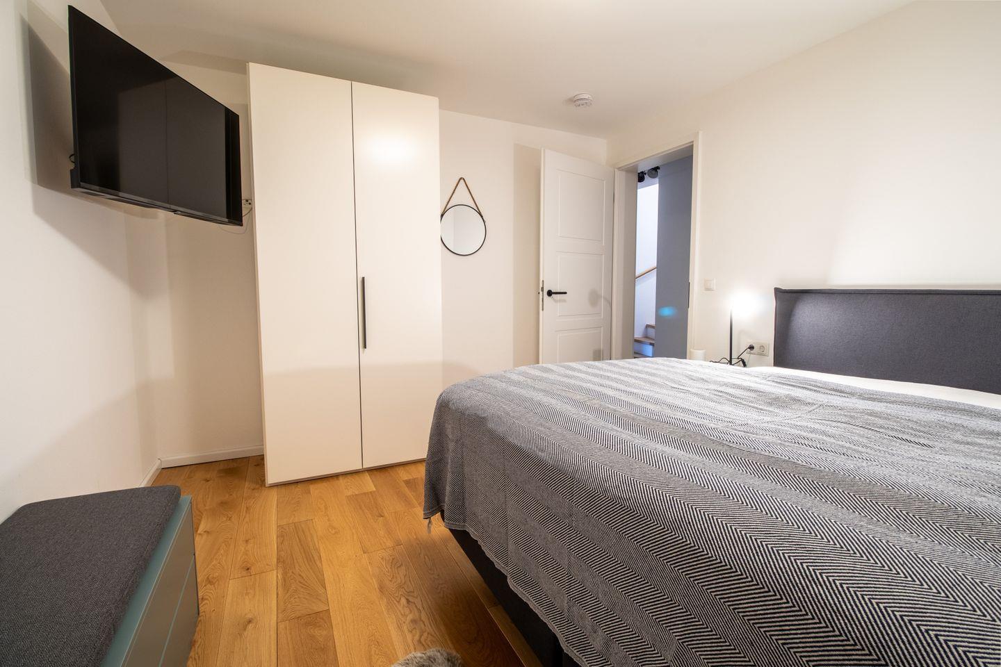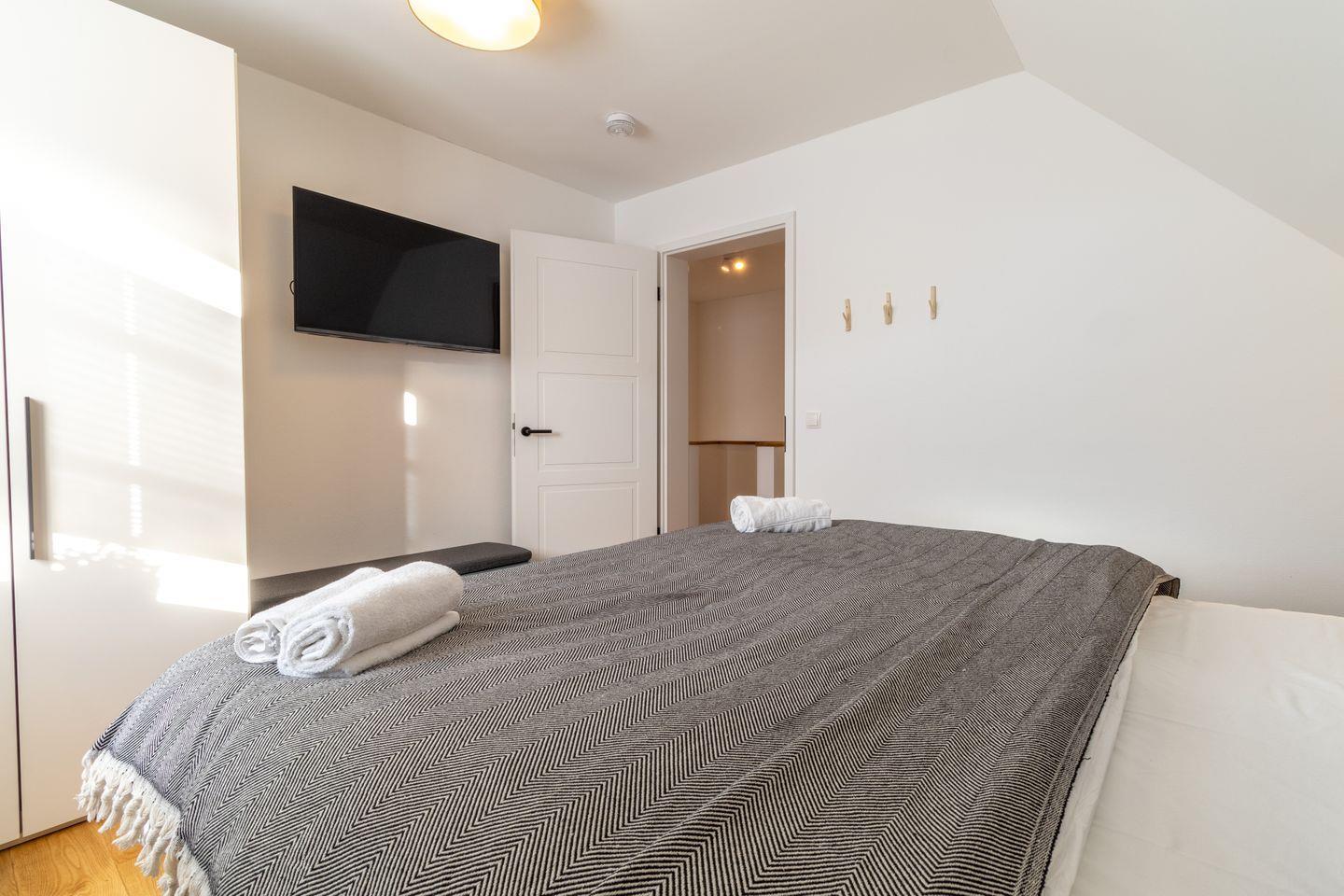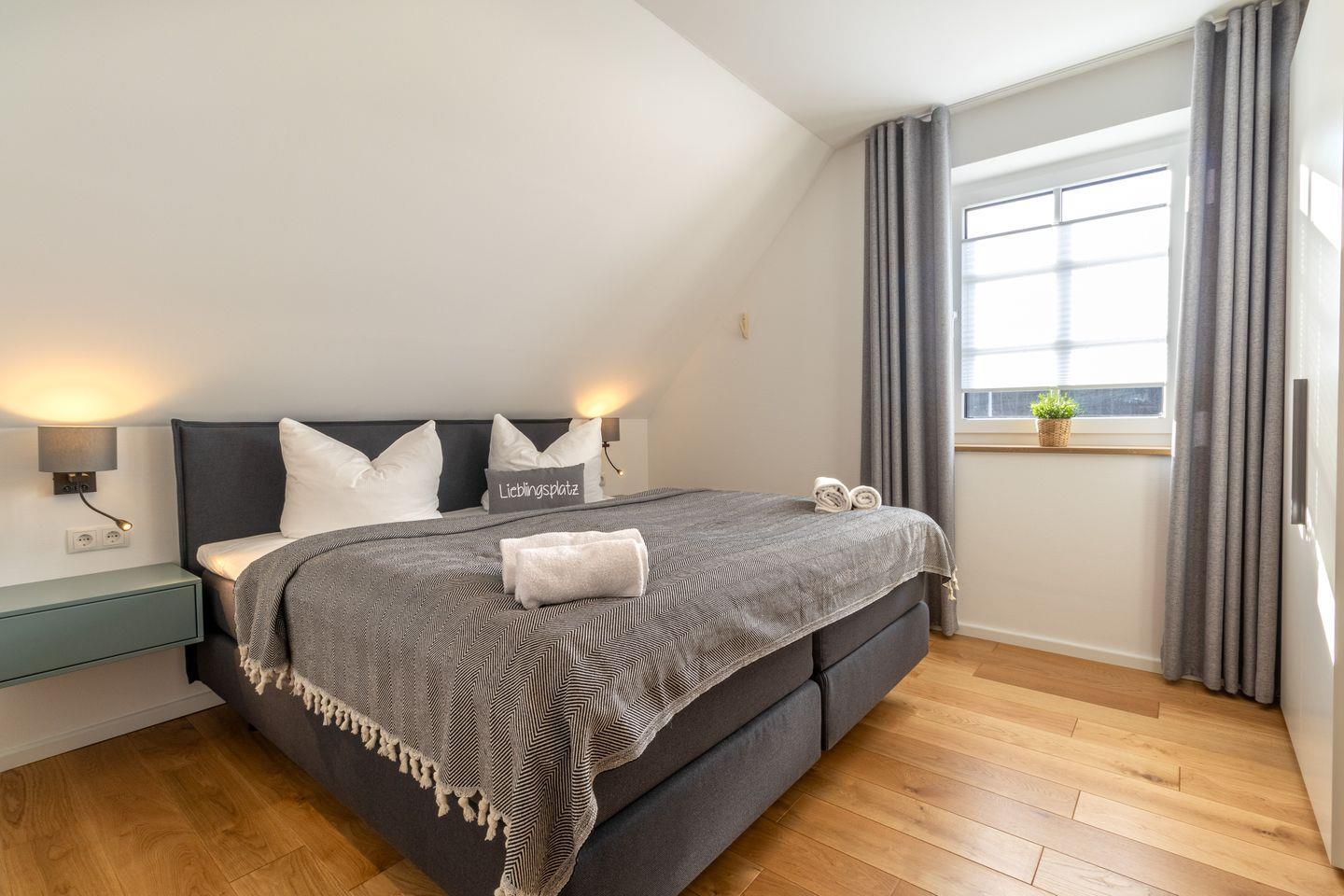 Drei großzügige Schlafzimmer bieten erholsame Nächte auf komfortablen Boxspringbetten. Zwei Schlafzimmer befinden sich im Obergeschoss, das dritte im Souterrain. Alle Räume sind mit TV ausgestattet. Verdunkelungsplissees sorgen für eine angenehme Nachtruhe. Große Einbauschränke bieten genügend Stauraum.