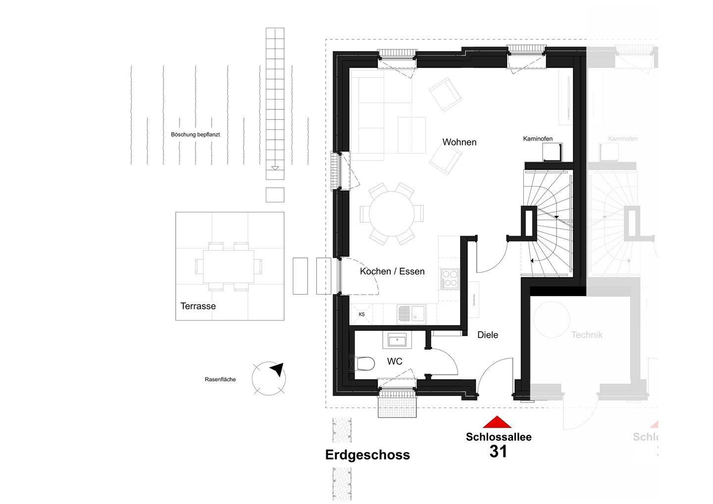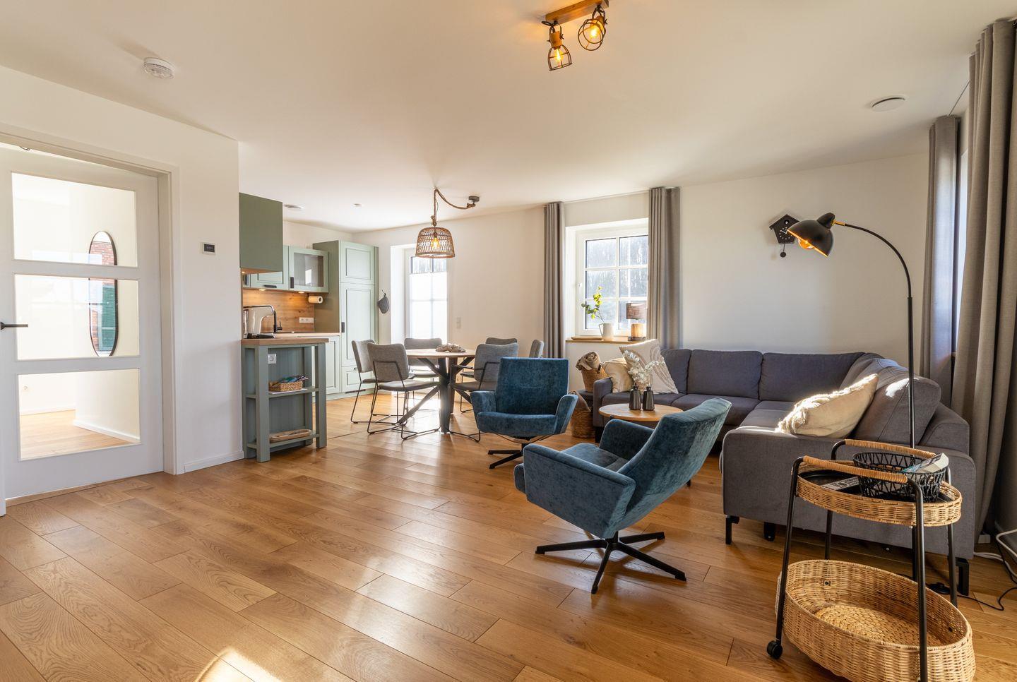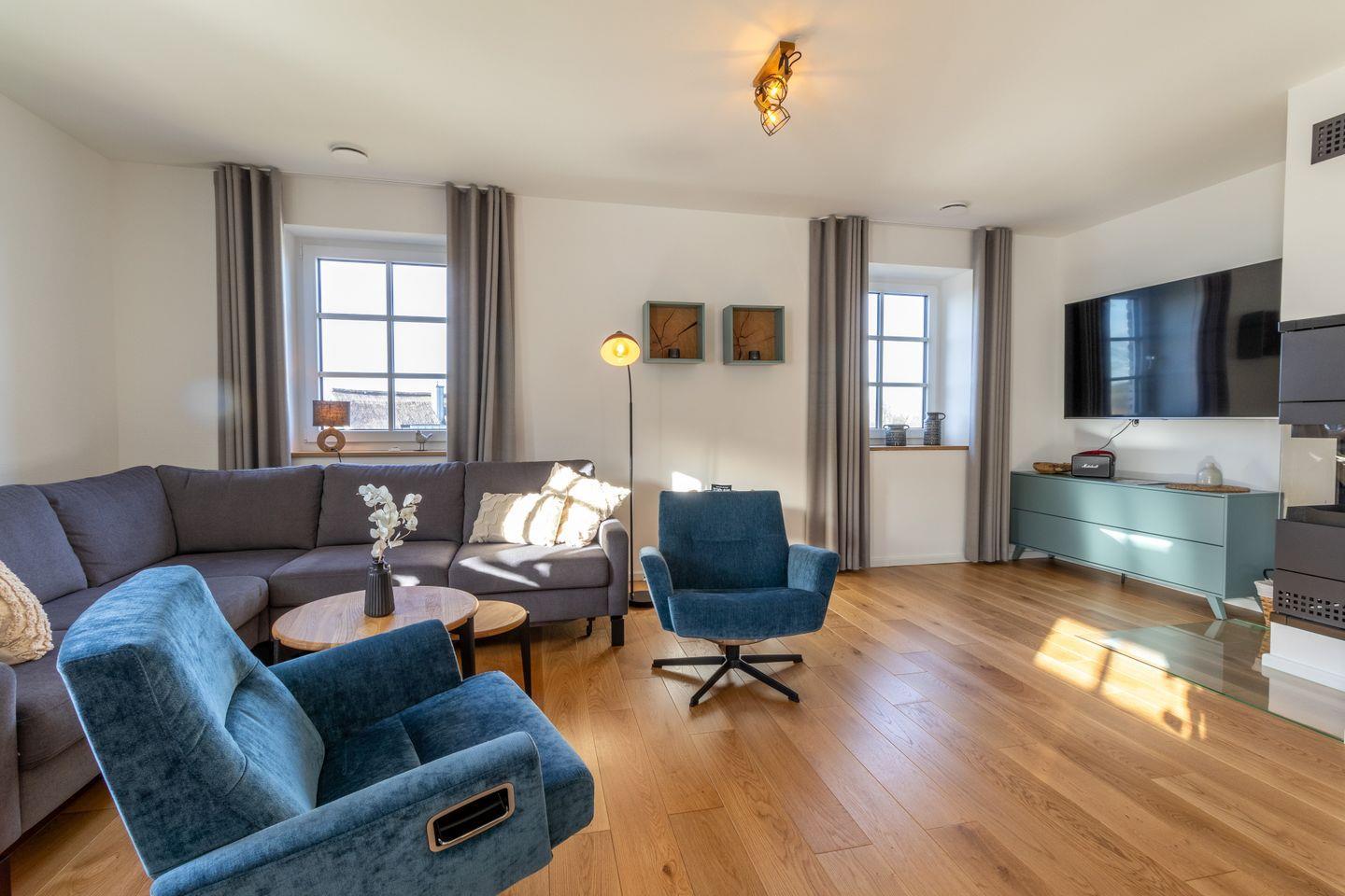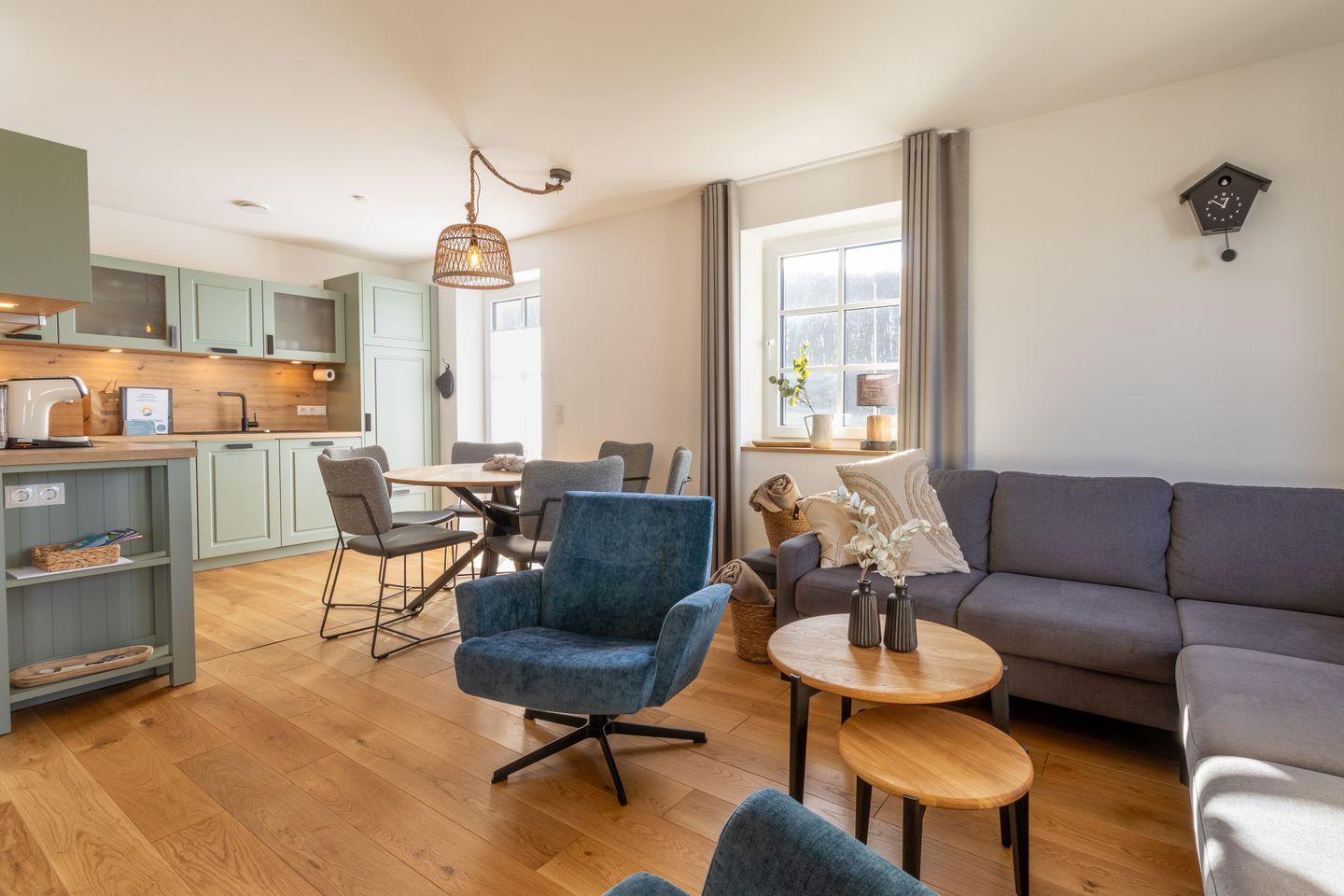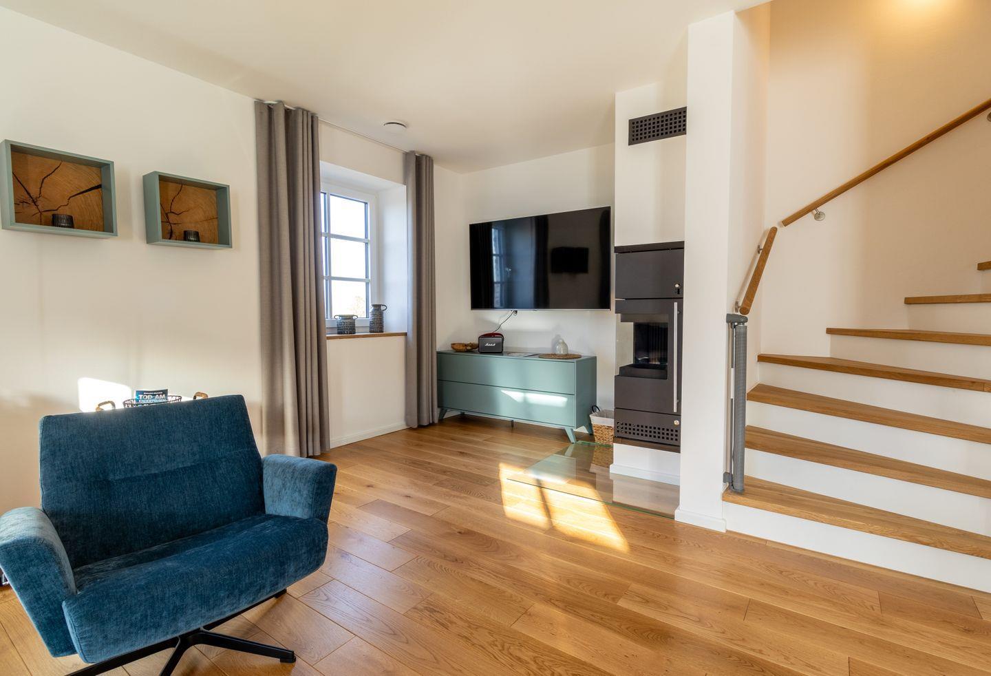 Im Erdgeschoss erwartet euch ein lichtdurchfluteter Wohnbereich mit Kaminofen, bequemer Sofalandschaft und Smart-TV. Die offene Küche mit Kochinsel, hochwertigen Geräten und direktem Zugang zur Terrasse macht gemeinsames Kochen zum Erlebnis. Im Sommer genießt ihr den Garten und den traumhaften Ausblick, im Winter sorgt das prasselnde Feuer für gemütliche Abende.