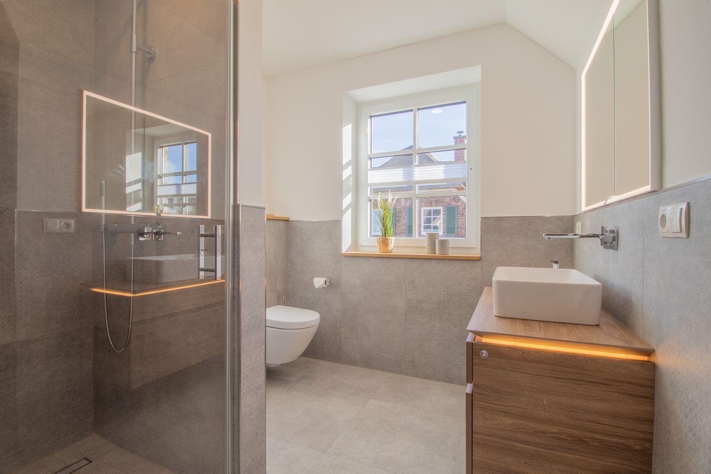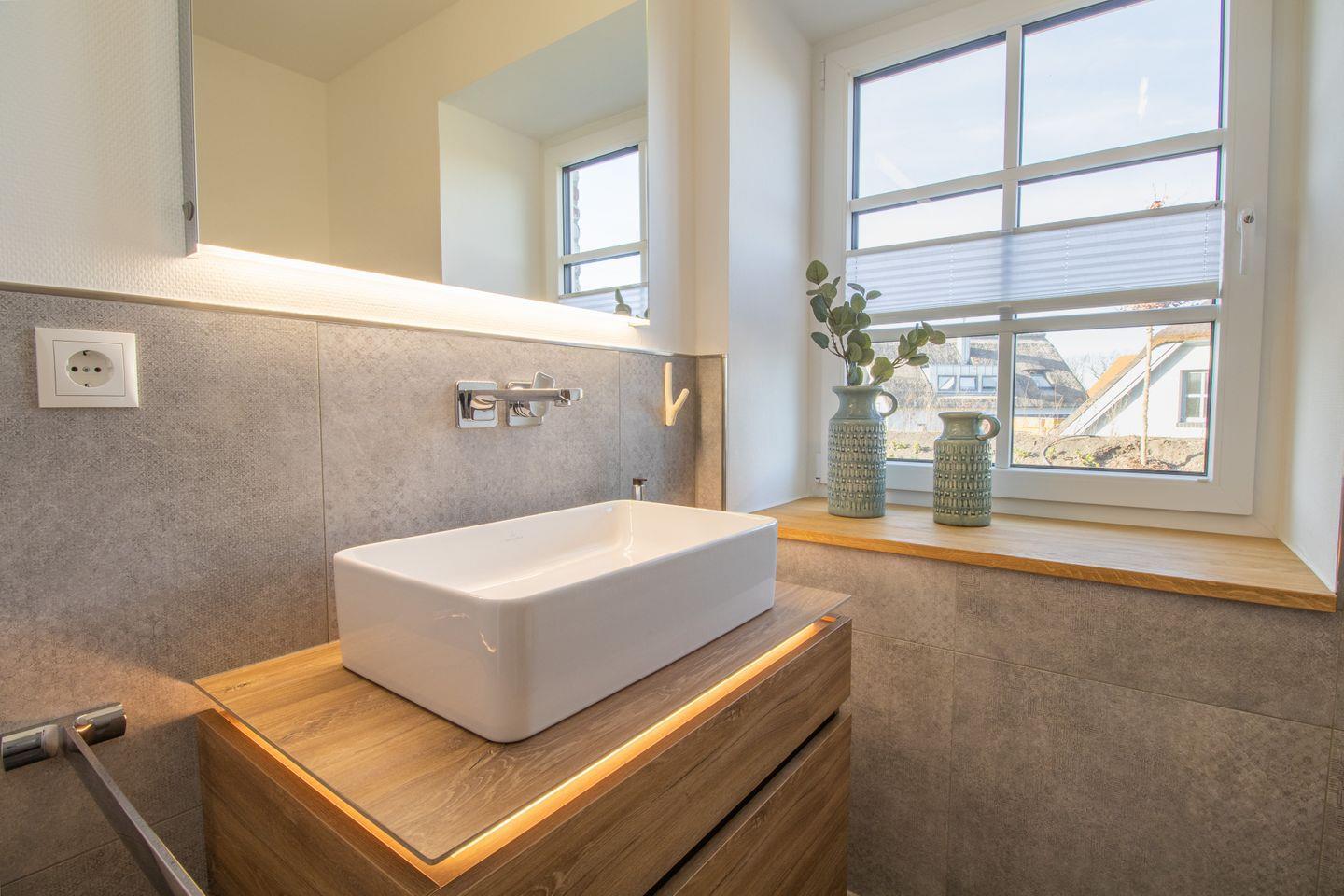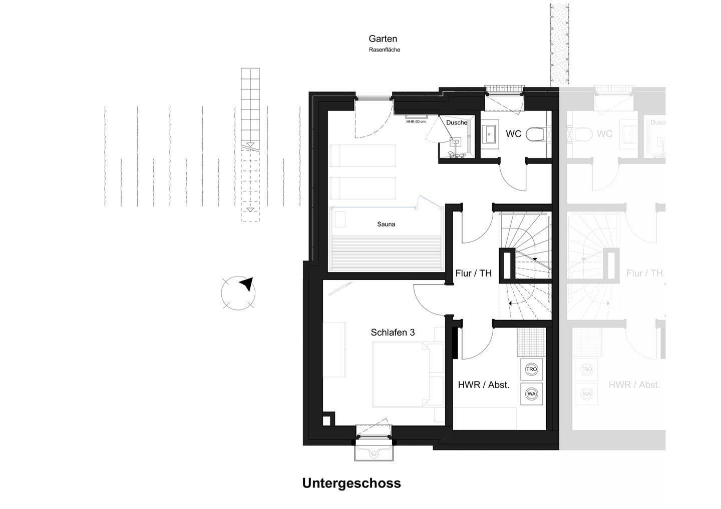 Der private Wellnessbereich im Souterrain bietet eine große Sauna, Dusche, Liegen und einen ruhigen Lichthof – perfekt zum Entspannen nach einem aktiven Tag. Die großzügige Glasfront bringt viel Tageslicht und schafft eine wohltuende Atmosphäre. Ein weiteres Badezimmer mit bodengleicher Dusche befindet sich im Obergeschoss.