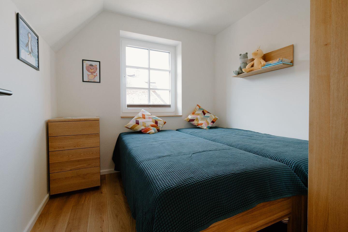 Die drei Schlafzimmer im Obergeschoss versprechen erholsame Nächte. Zwei davon sind mit komfortablen Doppelbetten und Smart-TVs ausgestattet, während das dritte über zwei Einzelbetten verfügt, die sich bei Bedarf zusammenschieben lassen. Verdunkelungsplissees sorgen in allen Räumen für entspannte Ruhe zu jeder Tageszeit.