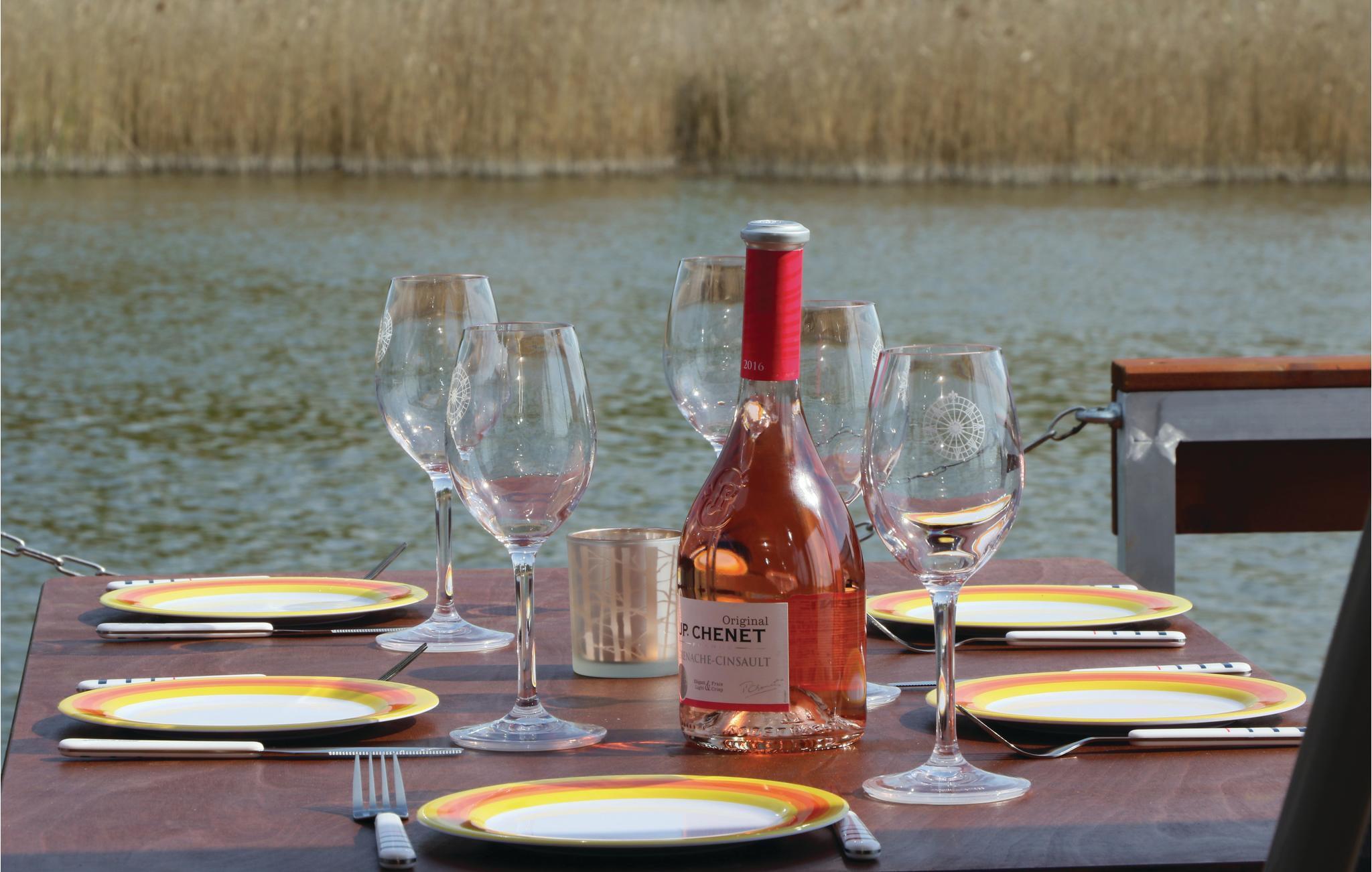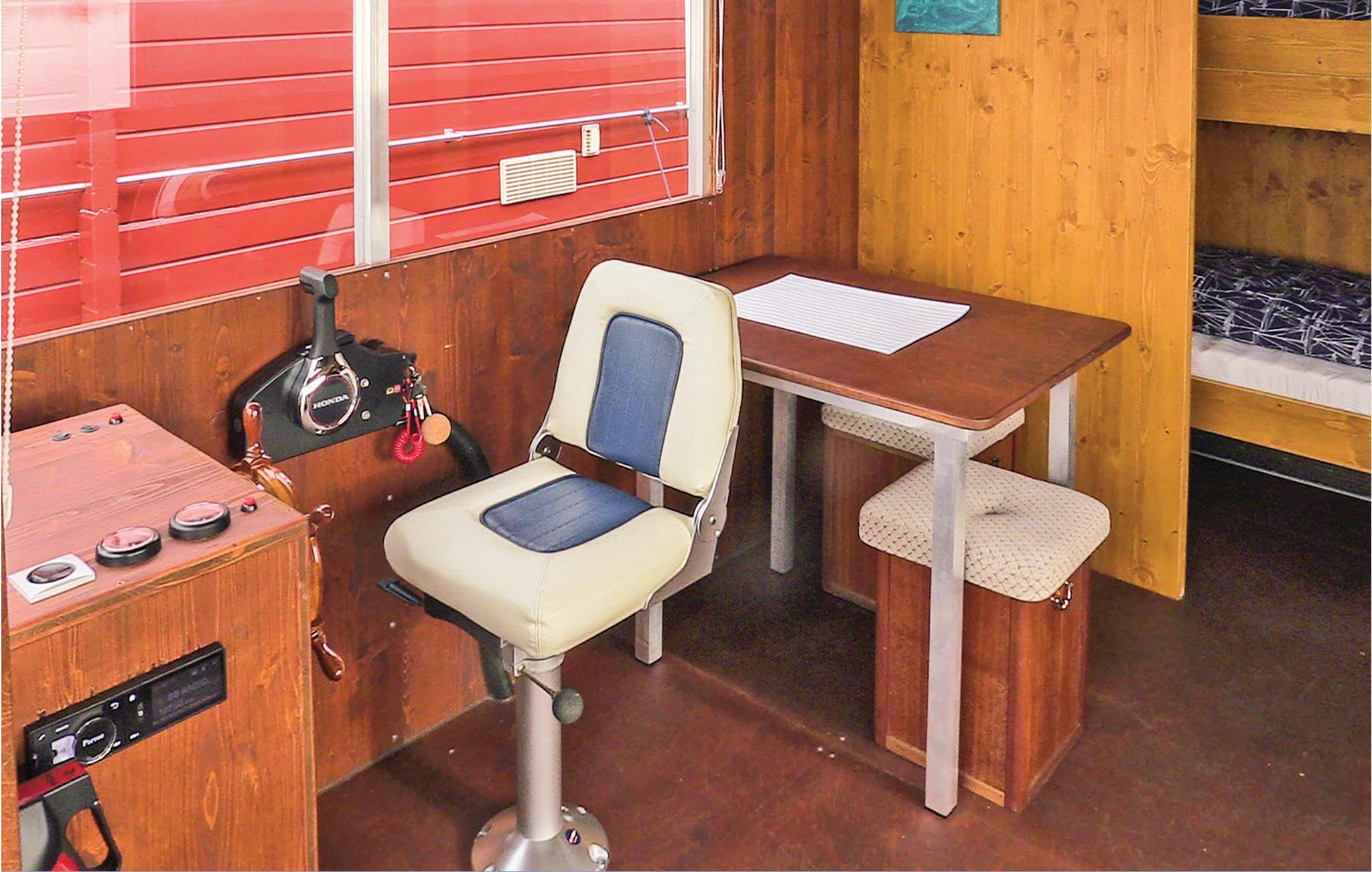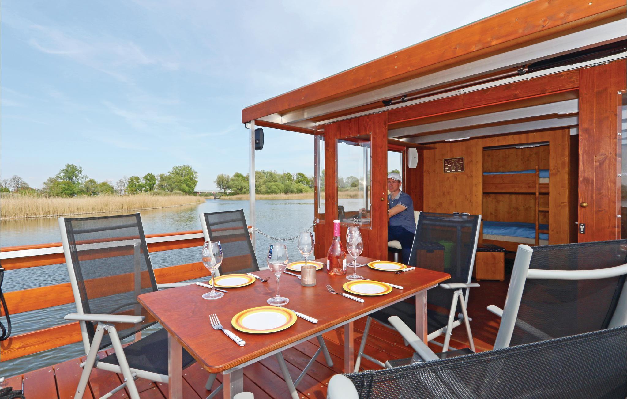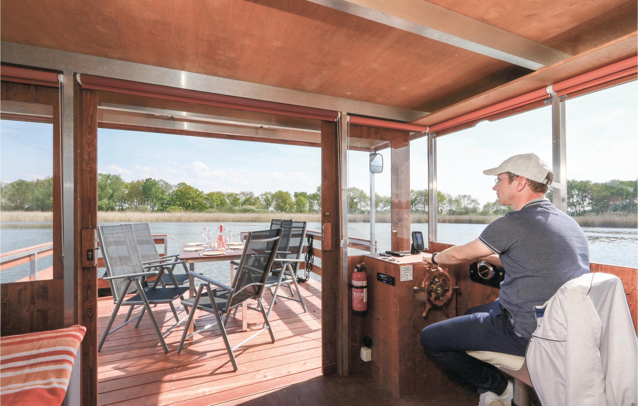 Sie betreten das Hausboot über die offene Terrasse am Bug und gelangen so in den Wohnbereich mit Steuerstand. Hier befindet sich auch die bequeme Schlafcouch mit Flachbildschirm und W-Lan, sowie einem Soundsystem und dem Essbereich. An dem mit einer Küchenzeile ausgestatteten Wohnraum liegt angrenzend ein Schlafbereich mit Etagenbett. Separat daneben befindet sich der gemütliche Hauptschlafraum mit Doppelbett, welcher einen herrlichen Blick auf das Wasser bietet. An Bord gibt es ein separates kleines WC mit Handwaschbecken. Eine Warmwasserdusche befindet sich außen am Heck (Abwasserentsorgung im Hafen gg. Gebühr möglich). Eine ausreichende Anzahl an Schwimmwesten und Fendern befindet sich auf dem Hausboot.