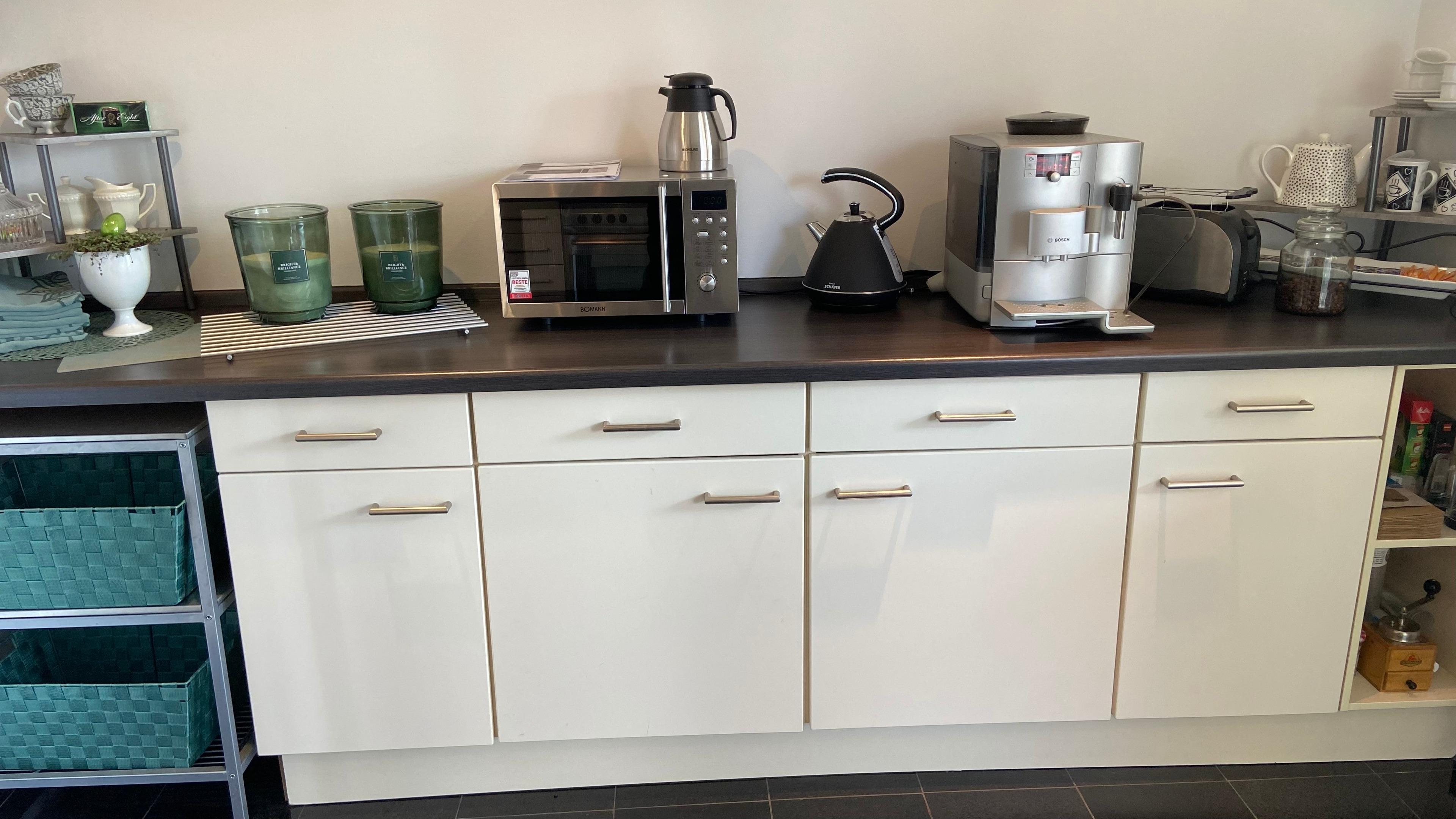 Komfortausstattung Kochen (Töpfe, Bratpfanne, Salz, Pfeffer und Öl)