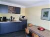 Die Küche ist mit Spüle, 2-Platten Ceran-Kochfeld, Spülmaschine, Kühlschrank m. Gefrierfach, Kaffeemaschine, Wasserkocher, Mikrowelle, Toaster und einem Esstisch ausgestattet.