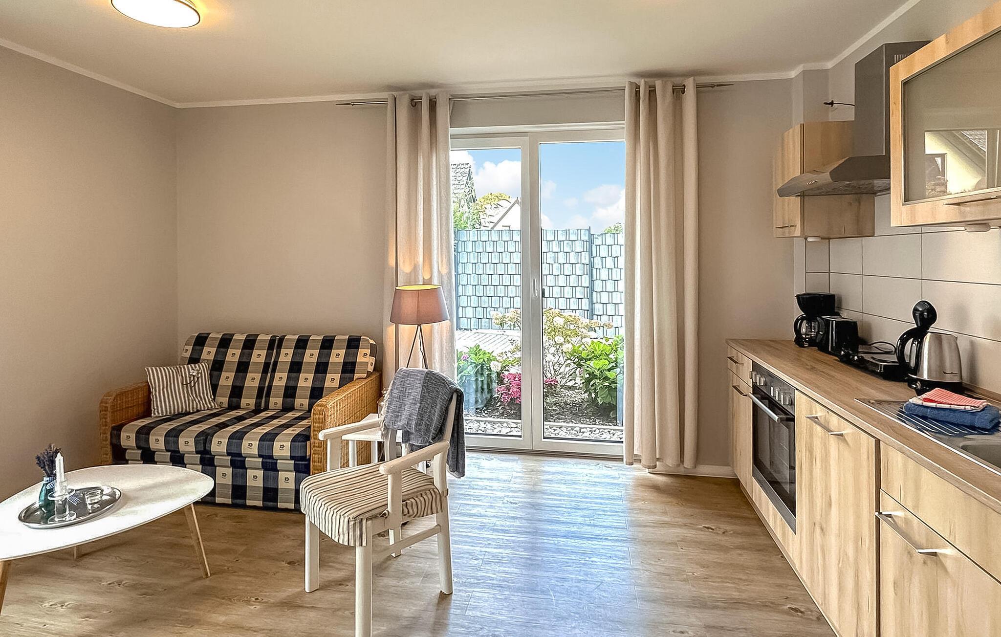 In Ortslage von Lubmin befindet sich auf dem ca. 370 qm großen Wohngrundstück im Erdgeschoss eines Wohnhauses die separate Ferienwohnung für zwei Personen. Der Strand am Greifswalder Bodden, Restaurants und Einkaufsmöglichkeiten befinden sich im Umkreis von ca. 500 m.Die ca. 40 qm große, 2022 renovierte und mit Fußbodenheizung ausgestattete Nichtraucher-Ferienwohnung verfügt über einen Wohnraum (Polstermöbel, Flachbild-TV, Esstisch) mit offener Küchenzeile (E-Kochplatten, Backofen, Kühlschrank, Geschirrspüler, Kaffeemaschine, Toaster, Wasserkocher), einen Schlafraum (Doppelbett), ein Bad (Dusche, WC, Fön) und einen Flur.