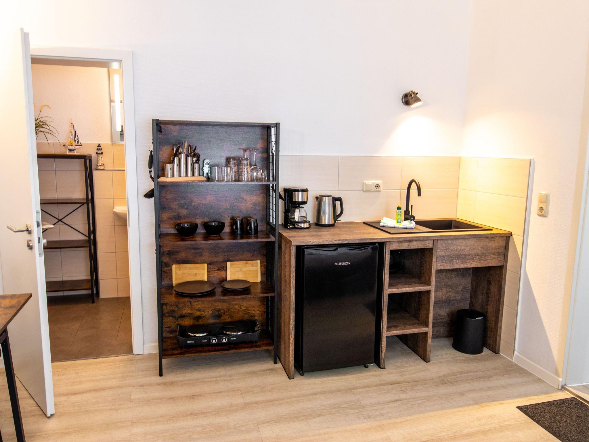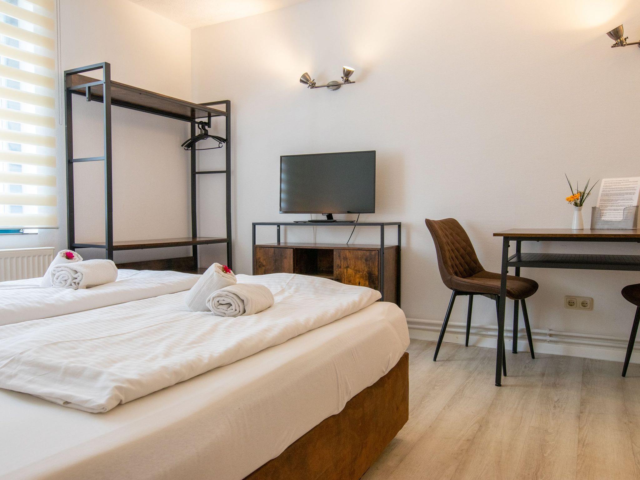 Das ca. 20 m² große Doppelzimmer befindet sich im Haupthaus der Ferienanlage. Es verfügt über einen kombinierten Wohn- und Schlafraum mit Doppelbett, eine integrierten Pantryküche sowie ein Bad mit Dusche und WC. Auch eine möblierte Terrasse kann genutzt werden. Das Zimmer eignet sich für bis zu 2 Personen. Zusätzlich kann ein Kinderbett für ein Kleinkind (bis 3 Jahre) aufgestellt werden. Kinderbett, Hochstuhl, Wäschepaket sowie ein Parkplatz sind inklusive.