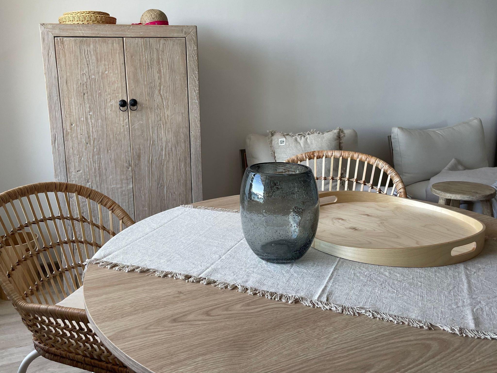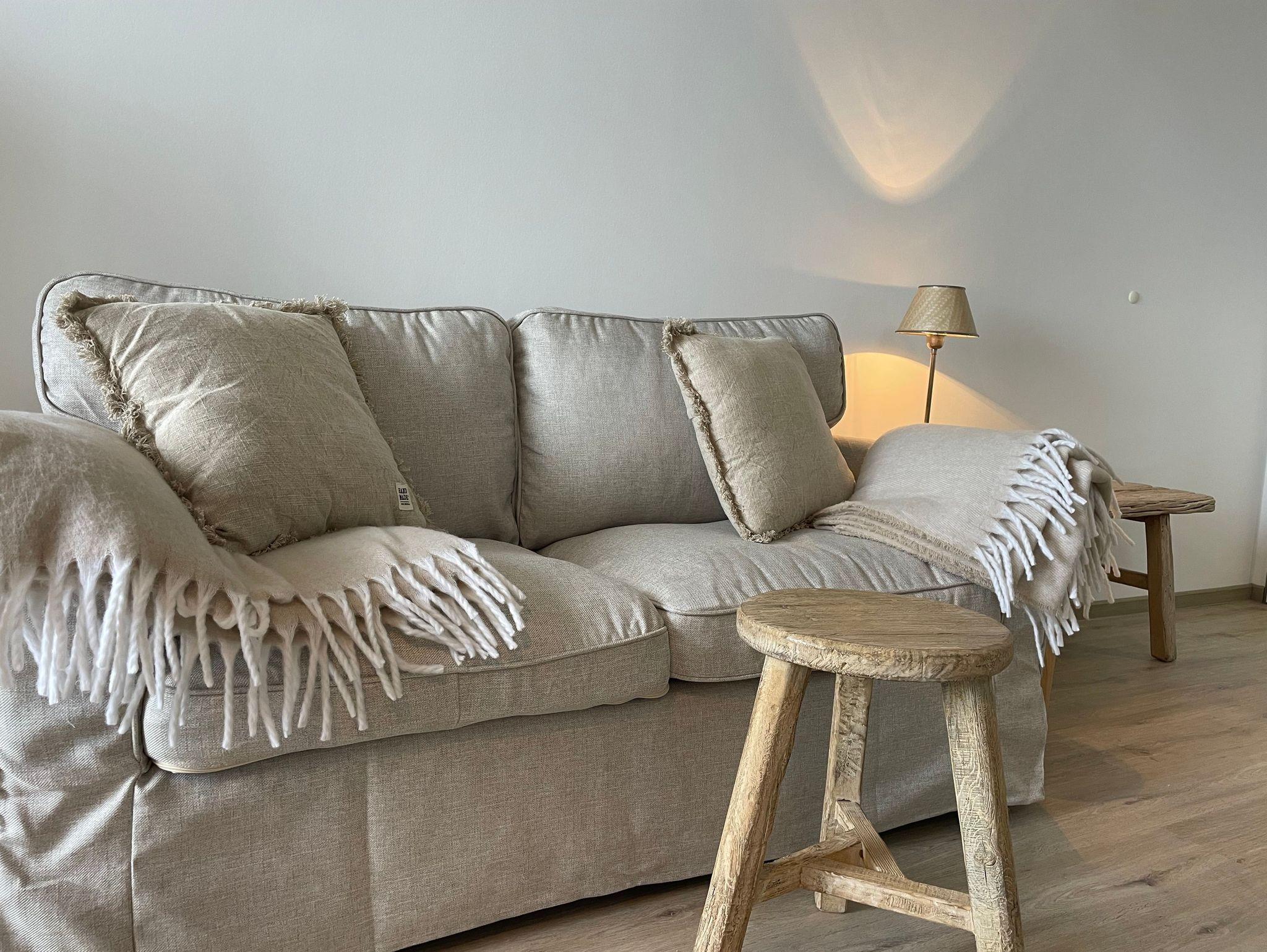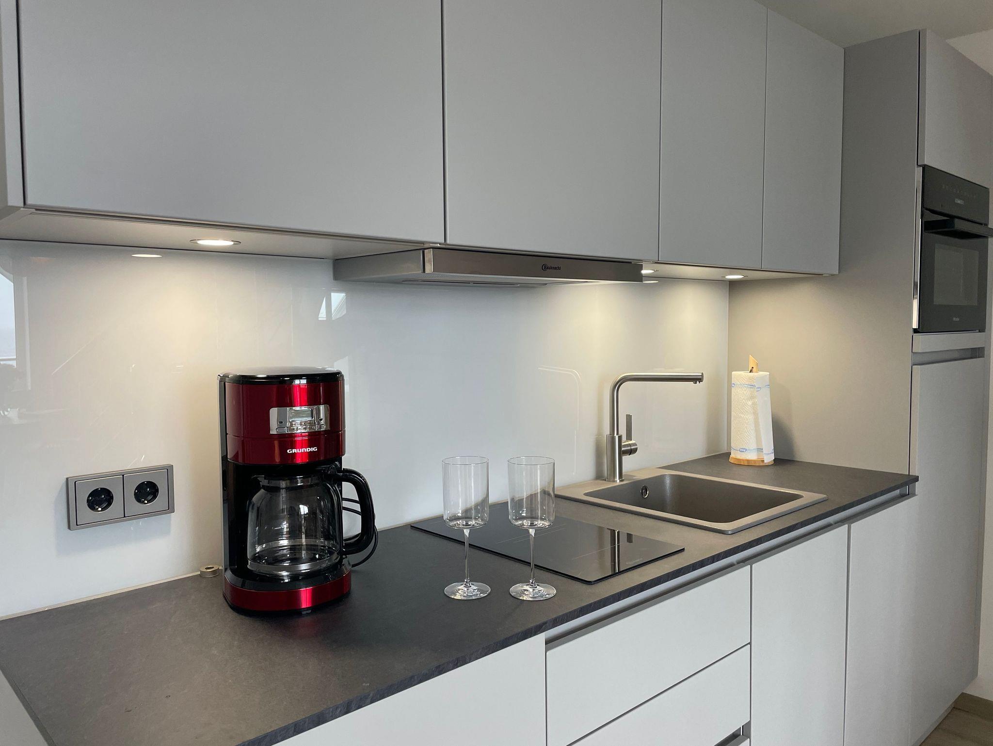 Wohnbereich mit Sofa, LCD Fernseher, voll ausgestattete Küche mit Backofen, Geschirrspüler, Esstisch, Duschbad und Schlafraum mit KING SITZE BETT 2 x 2 m. Feinste Daunenbetten runden Dein Schlaferlebnis ab.