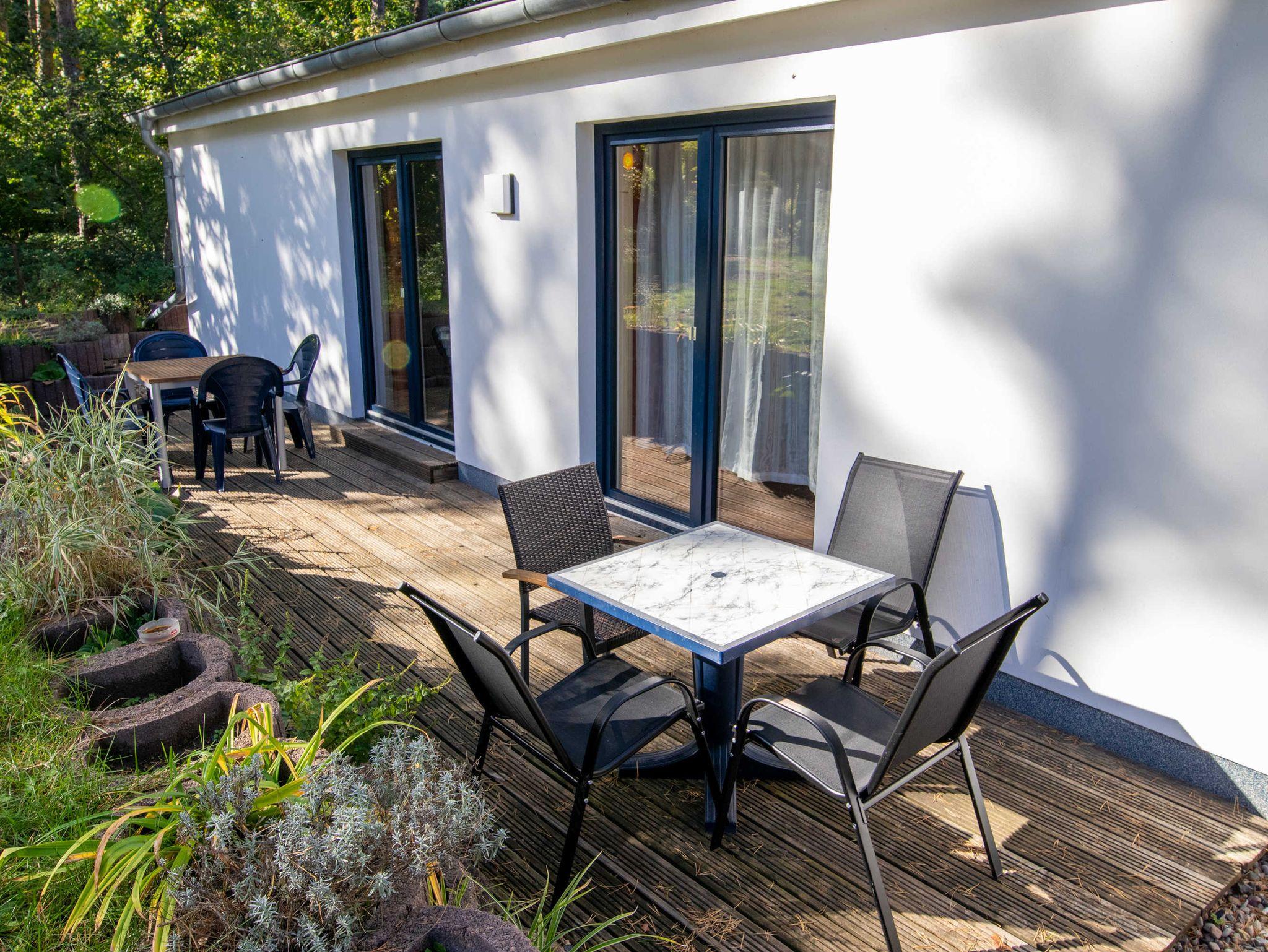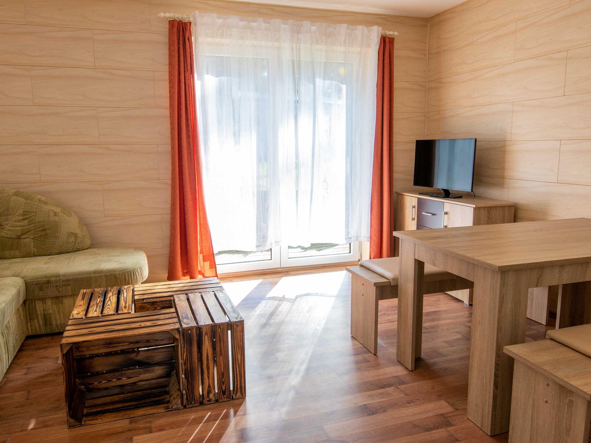 Die ca. 50 m² große Ferienwohnung befindet sich in einem einzeln stehenden Doppelhaus mit Terrasse und Blick zum Wald. Sie verfügt über ein Wohnzimmer mit Miniküche, zwei separaten Schlafzimmern, Flur und Bad.