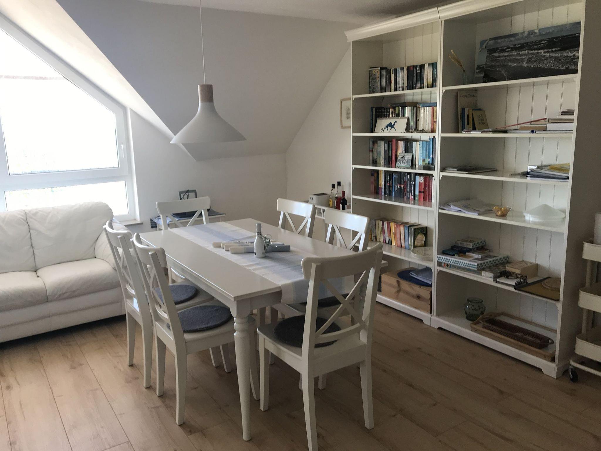 Die im zweiten Obergeschoss an der Nord- und Westseite des Hauses gelegene, durch große Glasfenster freie Blicke auf das Meer bietende, ca. 75 qm große Wohnung Nr. 55 verfügt über Bad/WC mit Dusche, zwei Schlafzimmer sowie einen geräumigen Wohnraum mit Sitzgruppe, Essplatz für bis zu 6 Personen und einer Küchenzeile ( Ceran-Kochfeld mit Backofen, Kühlschrank, Geschirrspüler, Kaffeemaschine, Toaster, Wasserkocher). Der größere Wohnraum sowie das eine Schlafzimmer haben Zugang zum südwestlich gelegenen Balkon und sind oftmals Schauplatz schöner Sonnenuntergänge.