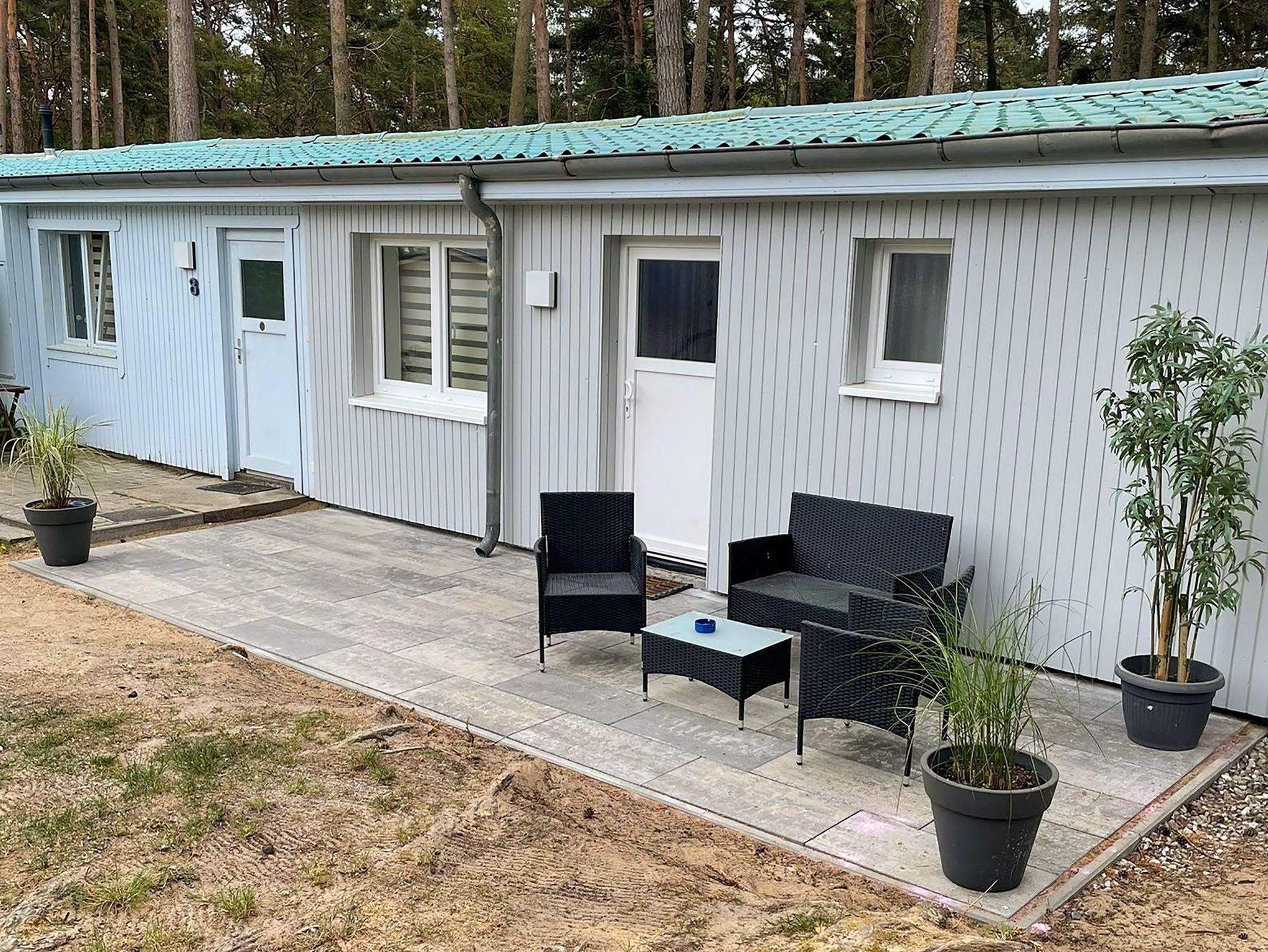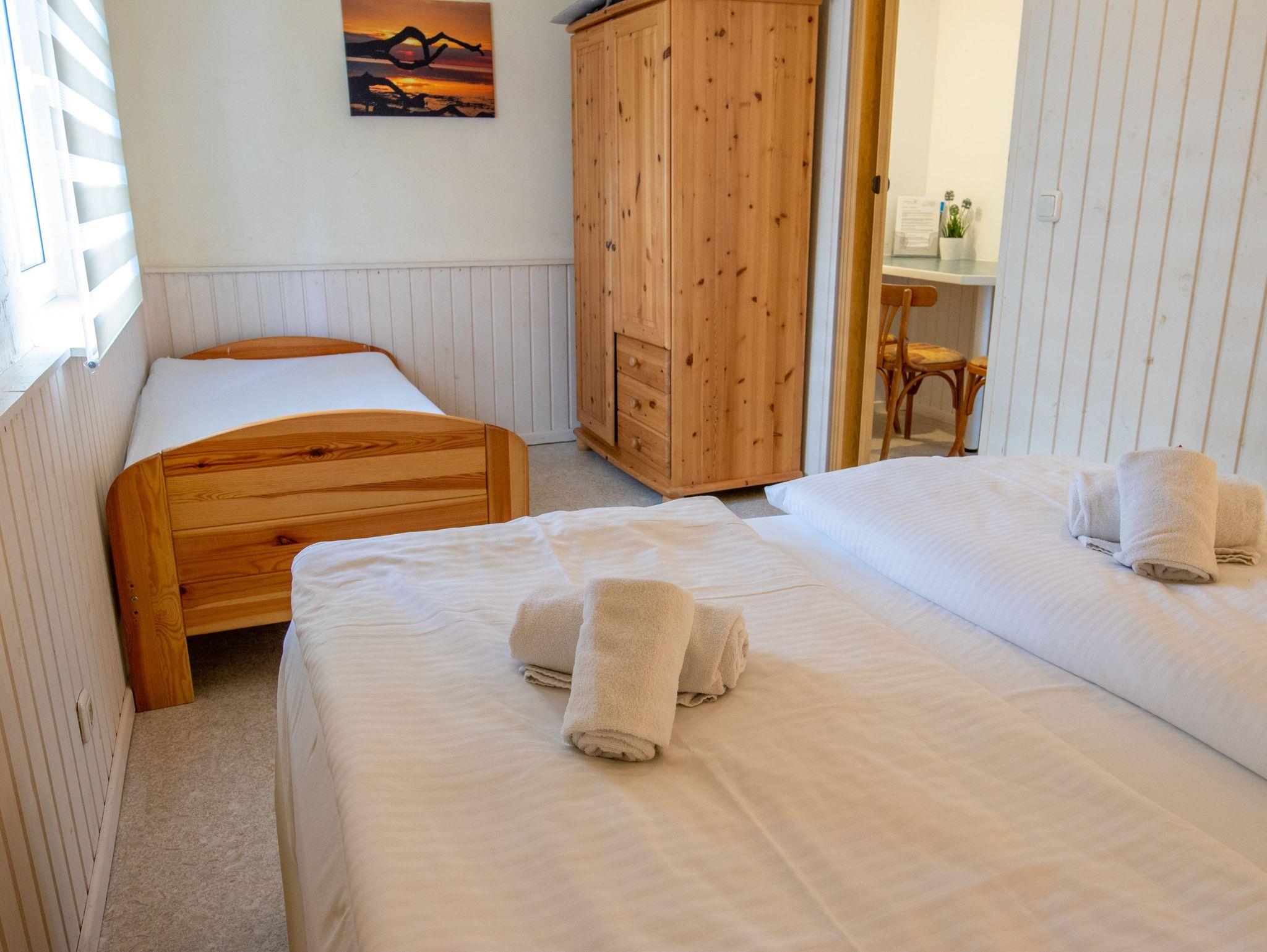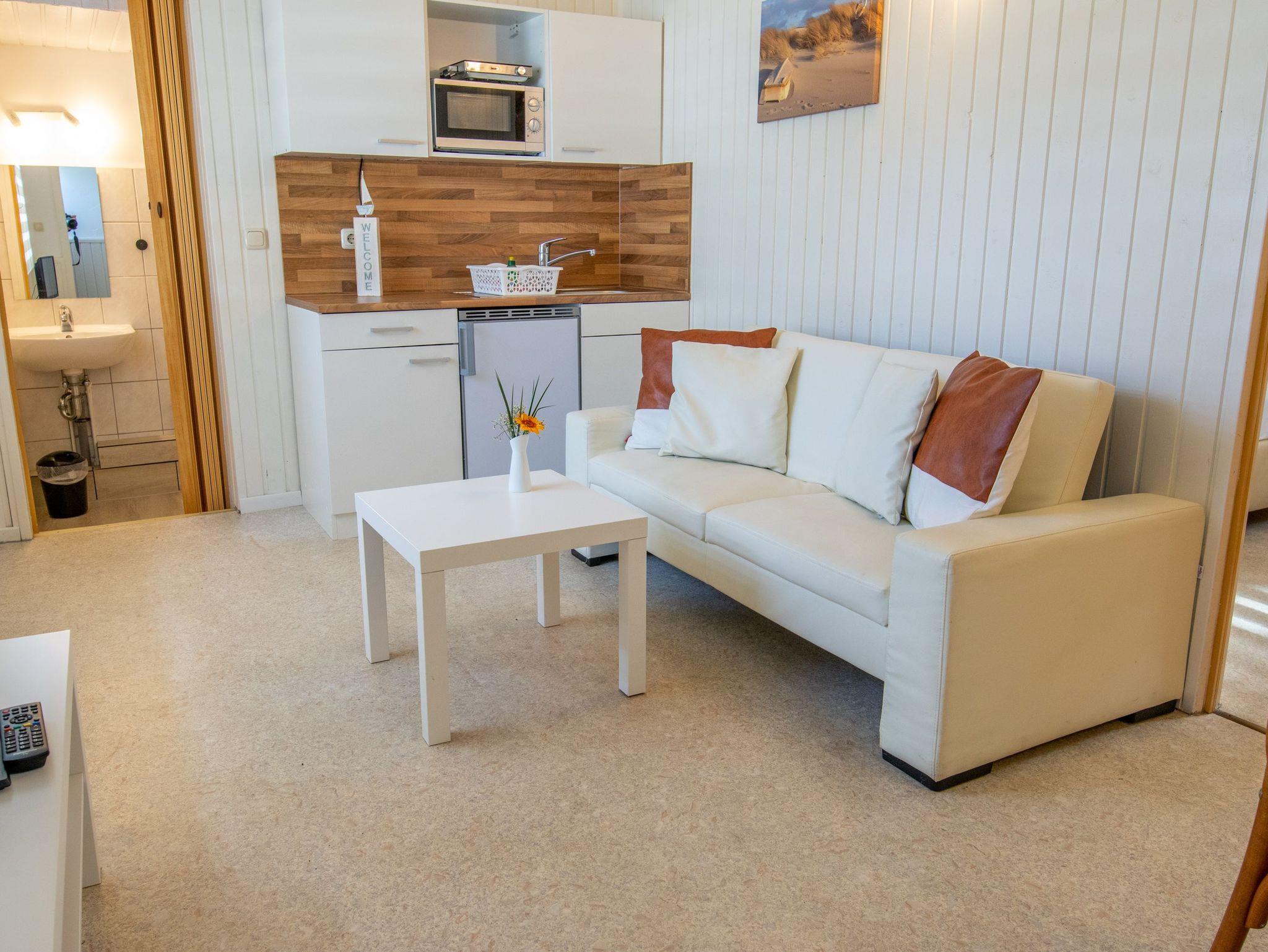 Die ca. 25 m² große Ferienwohnung befindet sich auf der Waldseite der Anlage in einem Reihenhaus mit Terrasse. Die Wohnung verfügt über ein Schlafzimmer mit einem Boxspring-Doppelbett und einem Einzelbett, ein separates Wohnzimmer mit integrierter Küchenzeile sowie ein Bad mit Dusche und WC. Vor dem Häuschen steht Ihnen eine möblierte Terrasse zur Verfügung. Die Ferienwohnung eignet sich für bis zu 3 Personen. Zusätzlich kann ein Kinderbett für ein Kleinkind (bis 3 Jahre) aufgestellt werden. Kinderbett, Hochstuhl, Wäschepaket sowie ein Parkplatz sind inklusive.