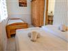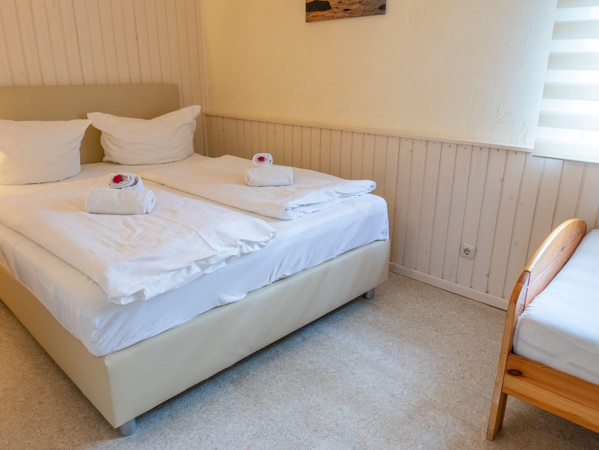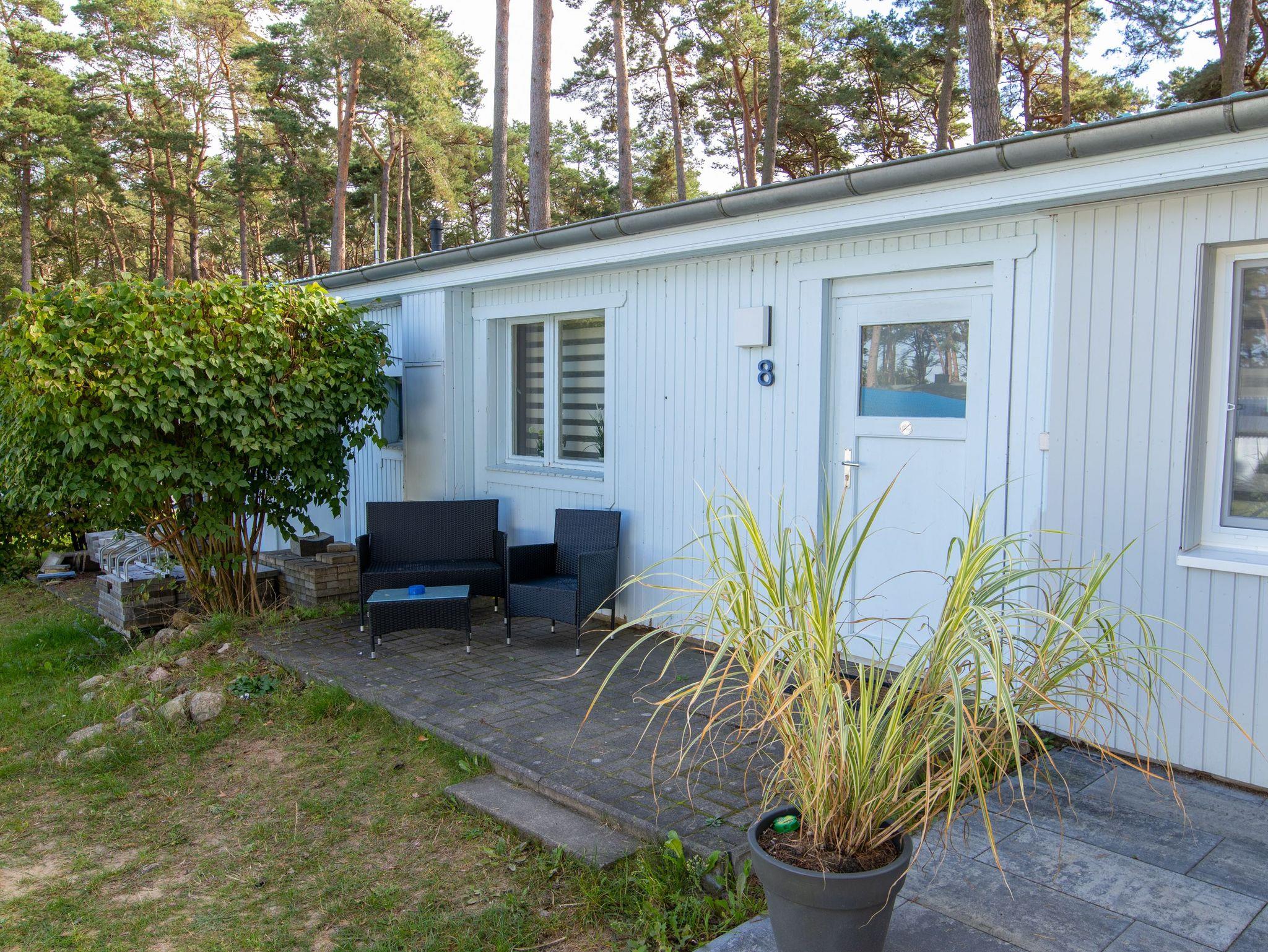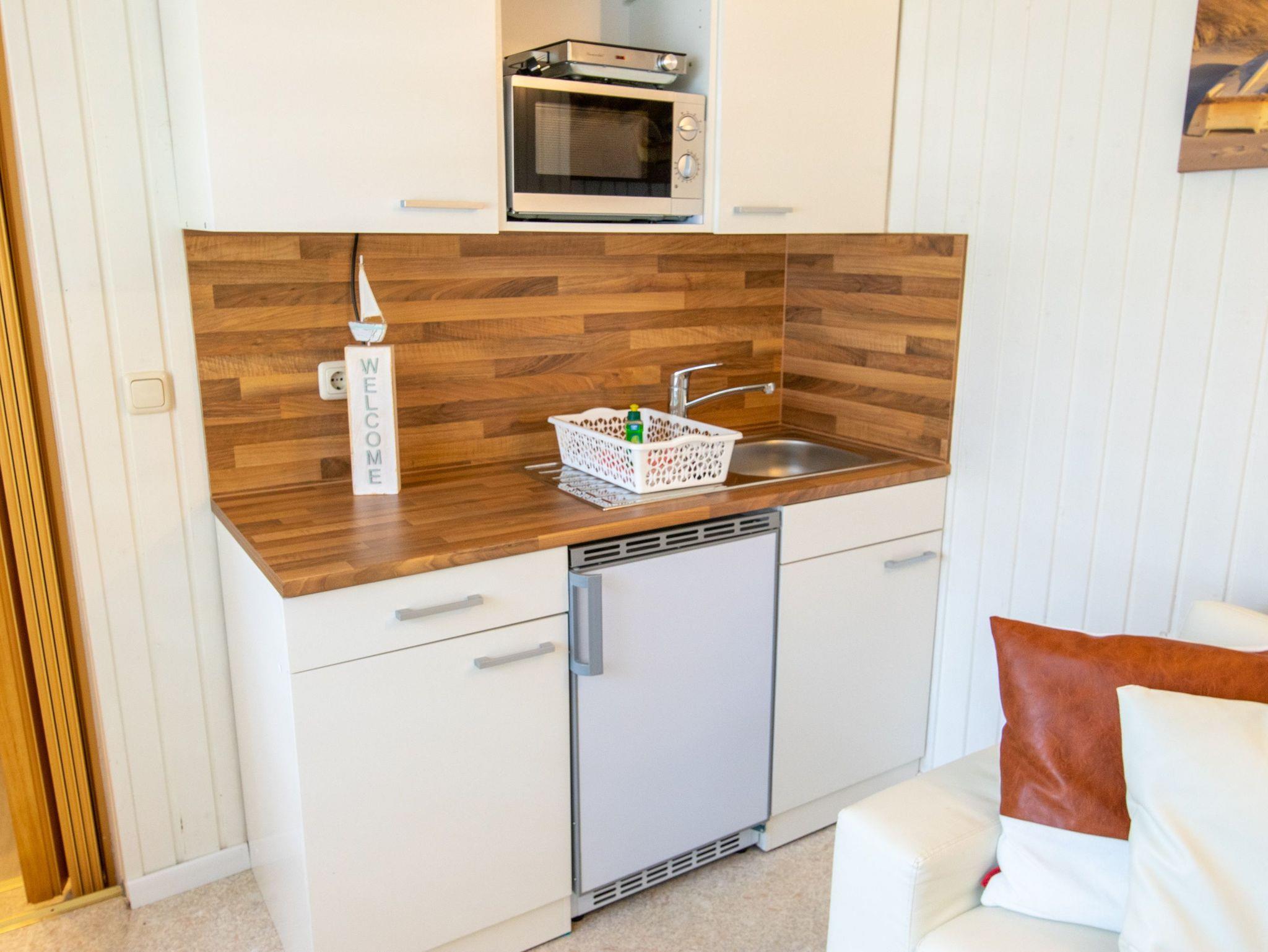 Die ca. 25 m² große Ferienwohnung befindet sich auf der Waldseite der Anlage in einem Reihenhaus mit Terrasse. Die Wohnung verfügt über ein Schlafzimmer mit einem Boxspring-Doppelbett und einem Einzelbett, ein separates Wohnzimmer mit integrierter Küchenzeile sowie ein Bad mit Dusche und WC. Vor dem Häuschen steht Ihnen eine möblierte Terrasse zur Verfügung. Die Ferienwohnung eignet sich für bis zu 3 Personen. Zusätzlich kann ein Kinderbett für ein Kleinkind (bis 3 Jahre) aufgestellt werden. Kinderbett, Hochstuhl, Wäschepaket sowie ein Parkplatz sind inklusive.