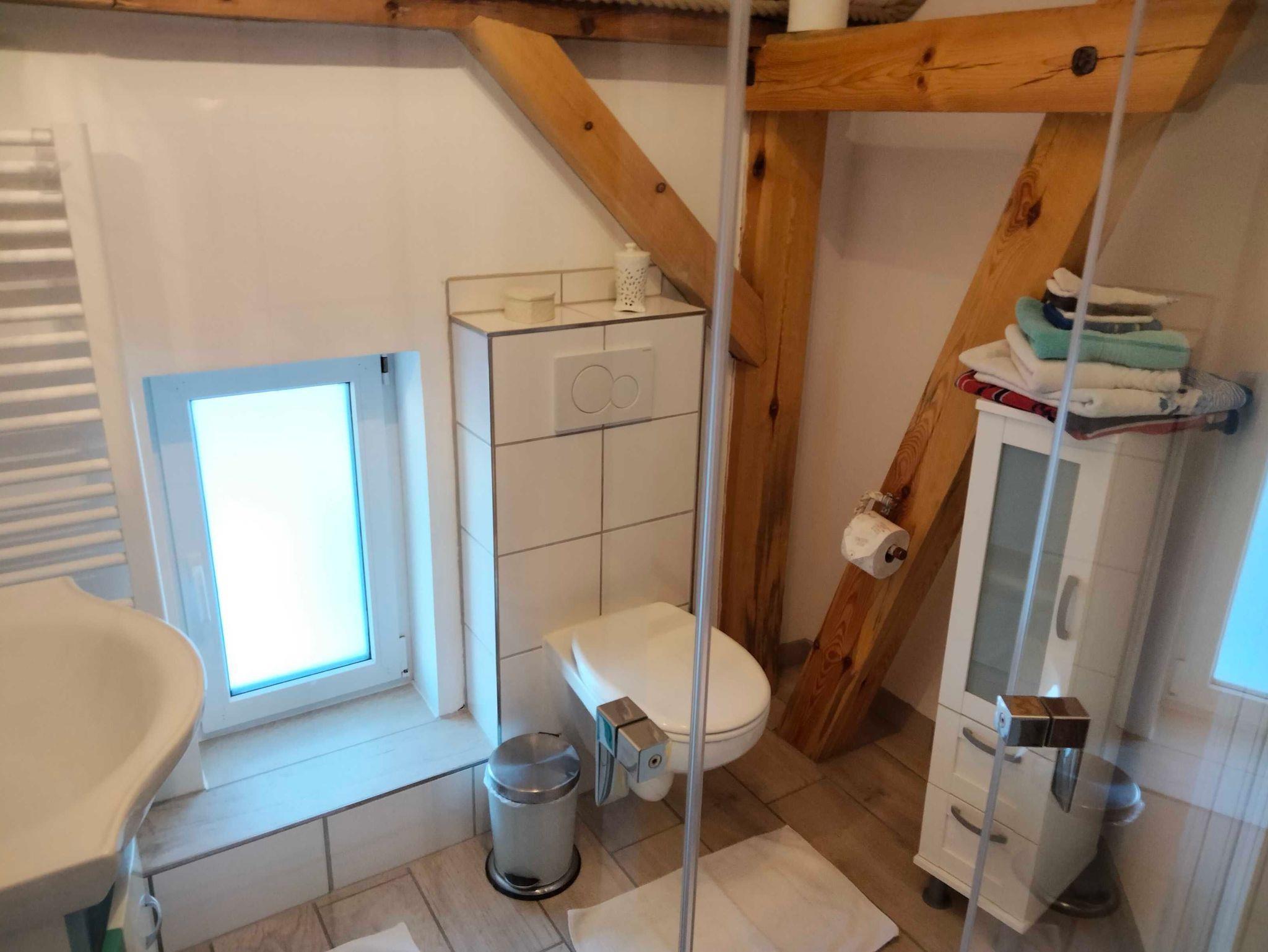 Das lichtdurchflutete Bad ist ausgestattet mit einer Duschkabine, WC, Fön, Waschtisch mit Unterschrank sowie Spiegelschrank und notwendiger Ablagefläche.