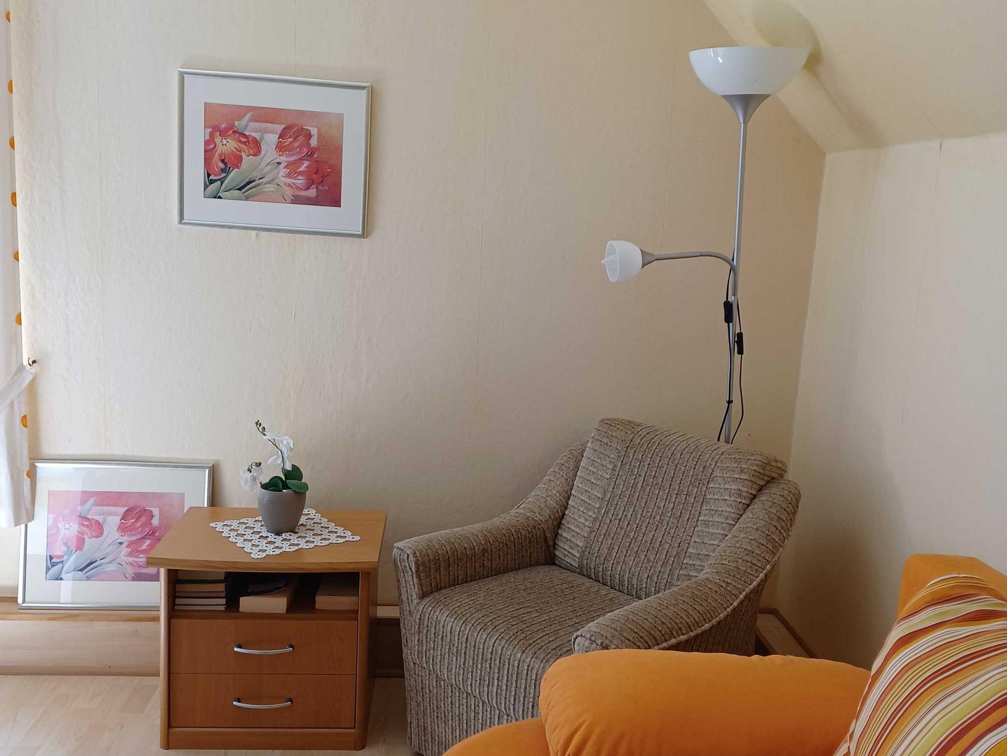 Die Ferienwohnung liegt im Obergeschoss und hat eine Größe von 90 qm und ist für 1-6 Personen geeignet. Die Wohnung ist unterteilt in eine separate Küche, zwei Schlafzimmer für je zwei bis drei Personen und einen Wohnraum. Von der Sitzecke im Wohnzimmer hat man einen Blick über den Garten auf die Müritz