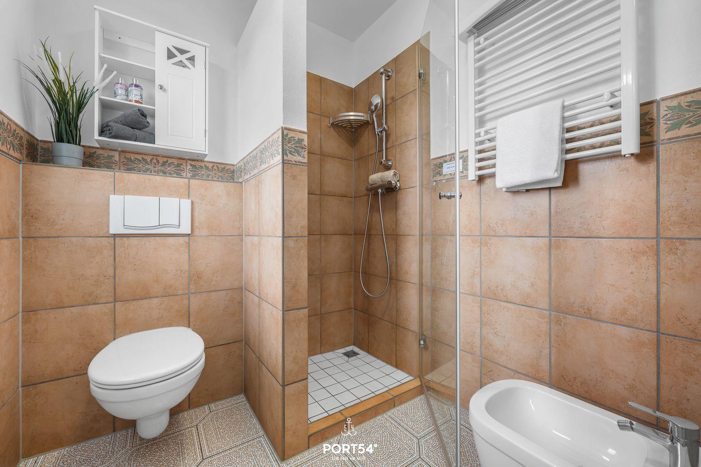 Eines der Highlights der Unterkunft ist das großzügige Badezimmer, das mit einer bodengleichen Dusche und einem Bidet ausgestattet ist. Zusätzlichen Komfort bieten Annehmlichkeiten wie ein Haartrockner, ein Kosmetikspiegel.