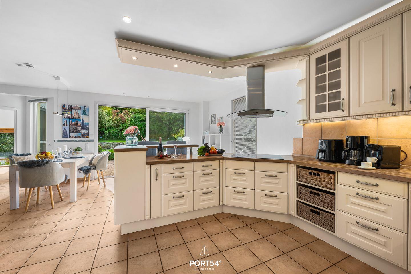 Die offene Küche, die harmonisch zum Wohnbereich gestaltet ist, ist mit modernen Geräten ausgestattet. Ein Cerankochfeld, ein Kühlschrank sowie eine Spülmaschine sorgen dafür, dass das Kochen und Aufräumen zum Vergnügen wird. Hochwertige Küchenutensilien und Geschirr stehen bereit, um die Essenszubereitung zu erleichtern. Der Essbereich lädt zu gemeinsamen Mahlzeiten ein, während die Sofaecke einen komfortablen Ort zum Entspannen und Verweilen bietet.