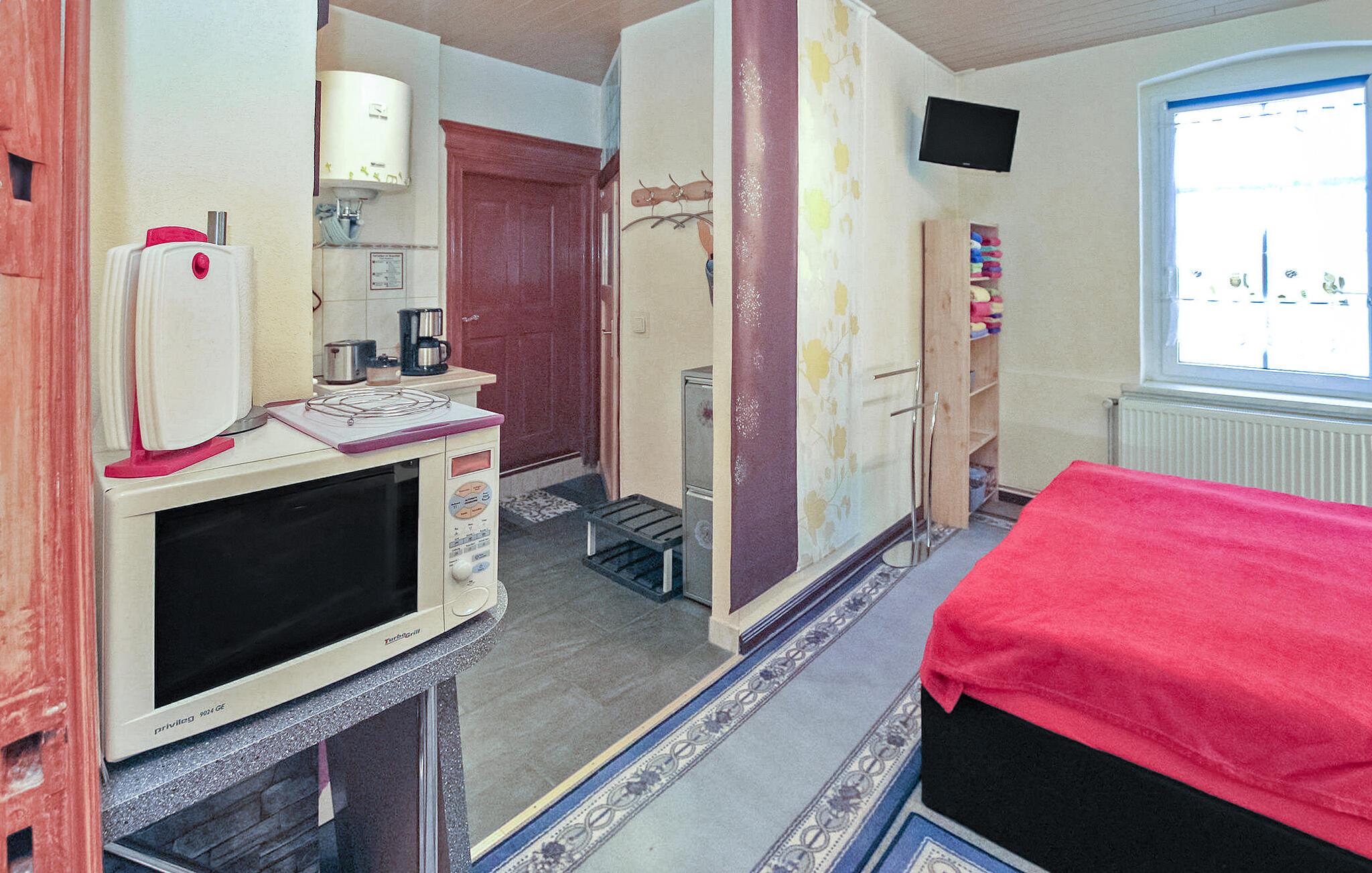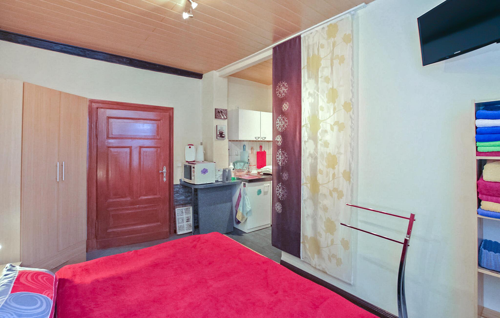 Ihre Ferienwohnung hat einen separaten Zugang im Erdgeschoss eines Wohnhauses. Der kombinierte Wohn- und Schlafraum ist funktional eingerichtet und bietet Ihnen ein Doppelbett, eine Sitzecke mit Polstermöbeln sowie einen Fernseher. Machen Sie es sich hier nach einem Ausflug bequem oder planen Sie den nächsten Tag. Die offene, im Raum integrierte Kochecke ermöglicht Ihnen, einfache Mahlzeiten zuzubereiten.
