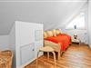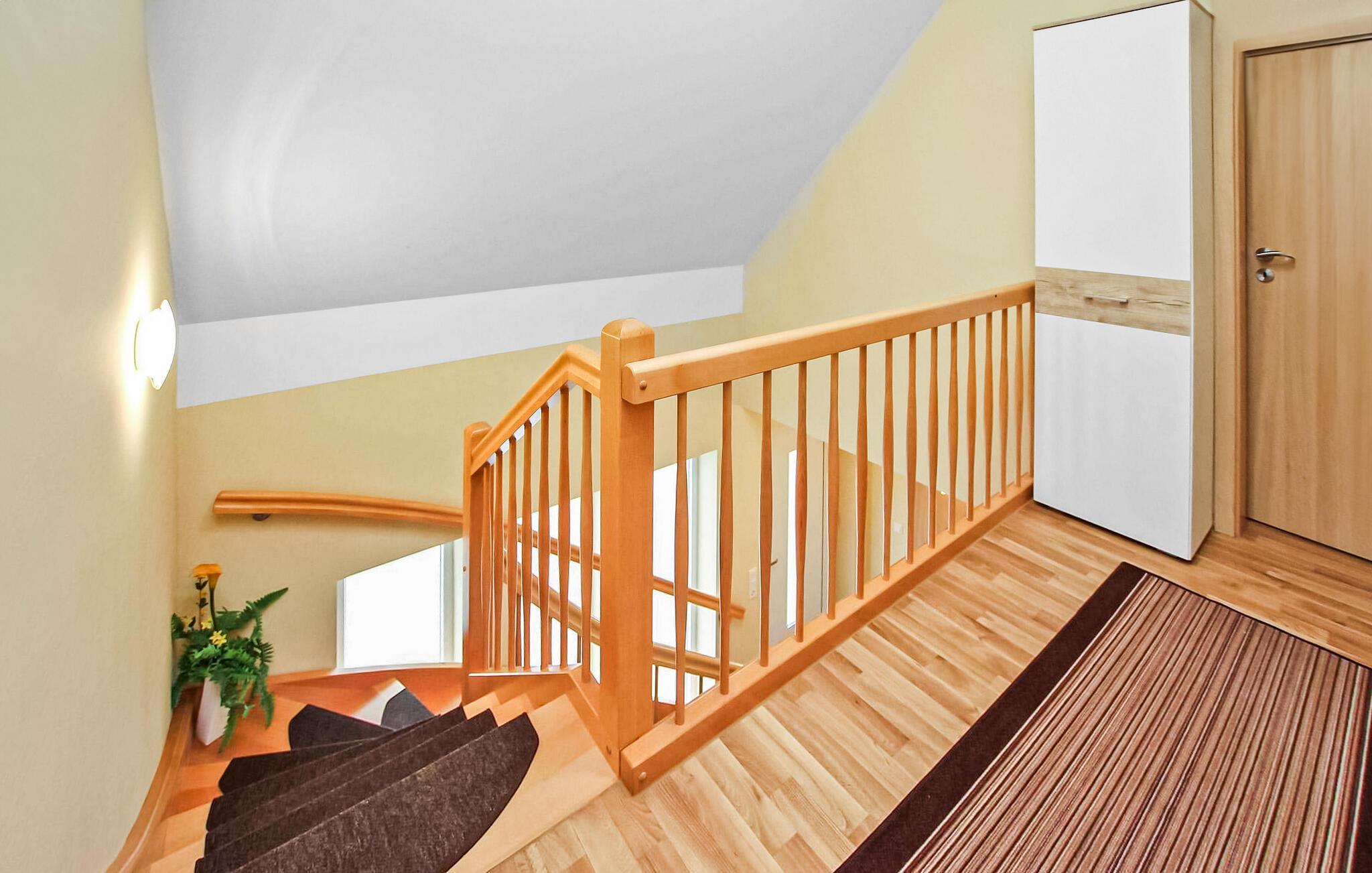 Im Obergeschoss (Zugang über eine offene Treppe) gibt es einen weiteren Wohnbereich (Polstermöbel, Schlafcouch, Schaukelstuhl, Flachbild-TV) mit Panoramablick über den See, zwei Schlafzimmer (1 x Doppel-Boxspringbett 1,40 m breit, Durchgang zum 2. Zimmer, 1 x Einzelbett) sowie ein Gäste-WC. Zusätzlich stehen eine möblierte Terrasse, Sonnenliegen, Grill, Parkplatz, Fahrrad-Abstellmöglichkeiten, eine Badeplattform am See, Kinderbett, Hochstuhl, ein Safe und kostenfreies W-LAN zur Verfügung. Gegen Gebühr: Ruderboot mit 4 PS Motor, Fahrräder.
