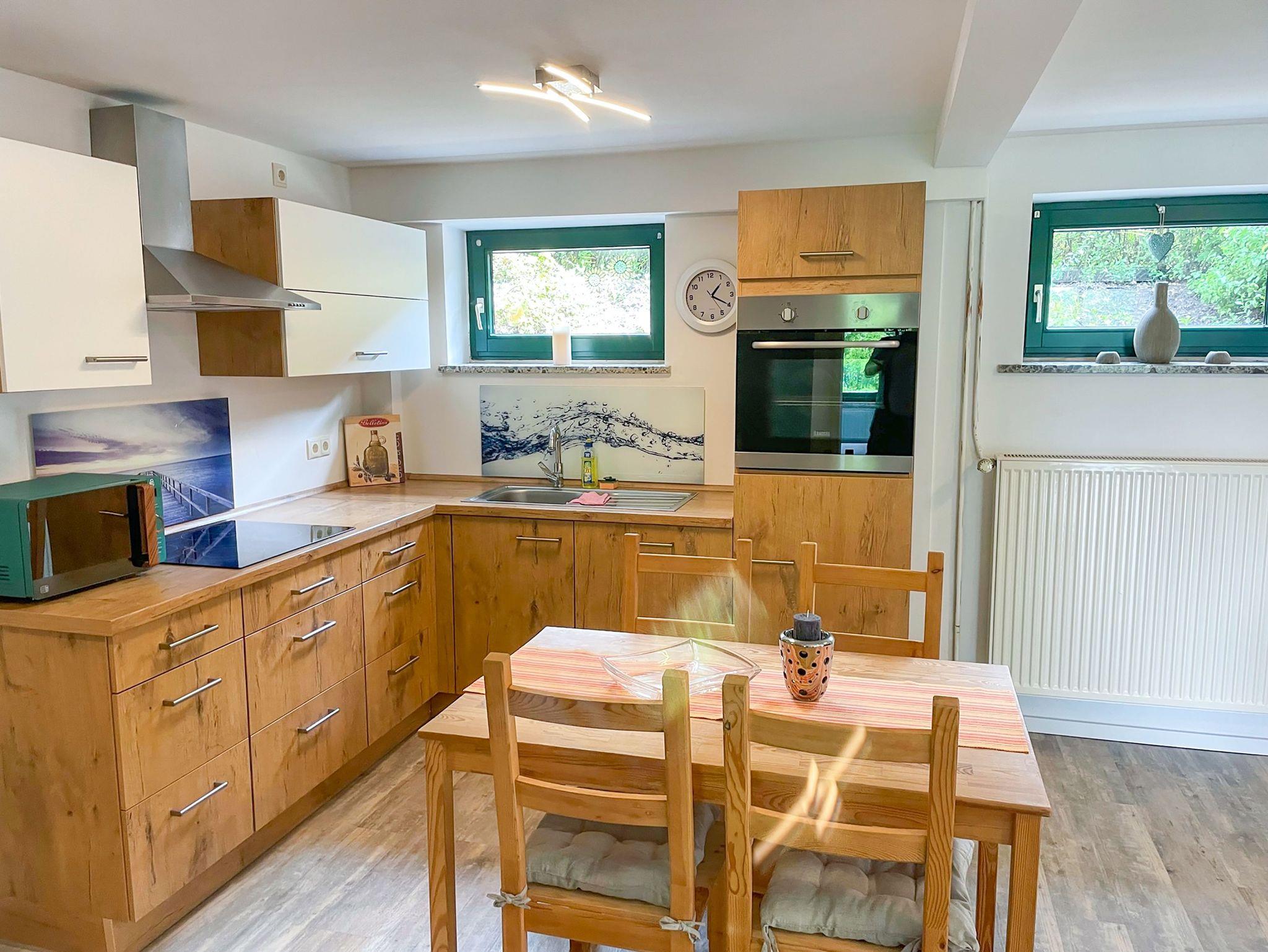 Das Wohnzimmer besticht mit einem herrlichen Blick auf den See und den eigenen Badesteg. Es umfasst ein gemütliches Sofa und TV. Über den angrenzenden Flur erreicht man die drei Schlafzimmer. Zwei Schlafzimmer sind mit einem Doppelbett (160x200) ausgestattet, das andere mit zwei Einzelbetten (90x200). Die Küche ist komplett eingerichtet und verfügt über ein Cerankochfeld, Backofen, Kühlschrank, Spülmaschine, Mikrowelle, Wasserkocher, Toaster und Kaffeemaschine.