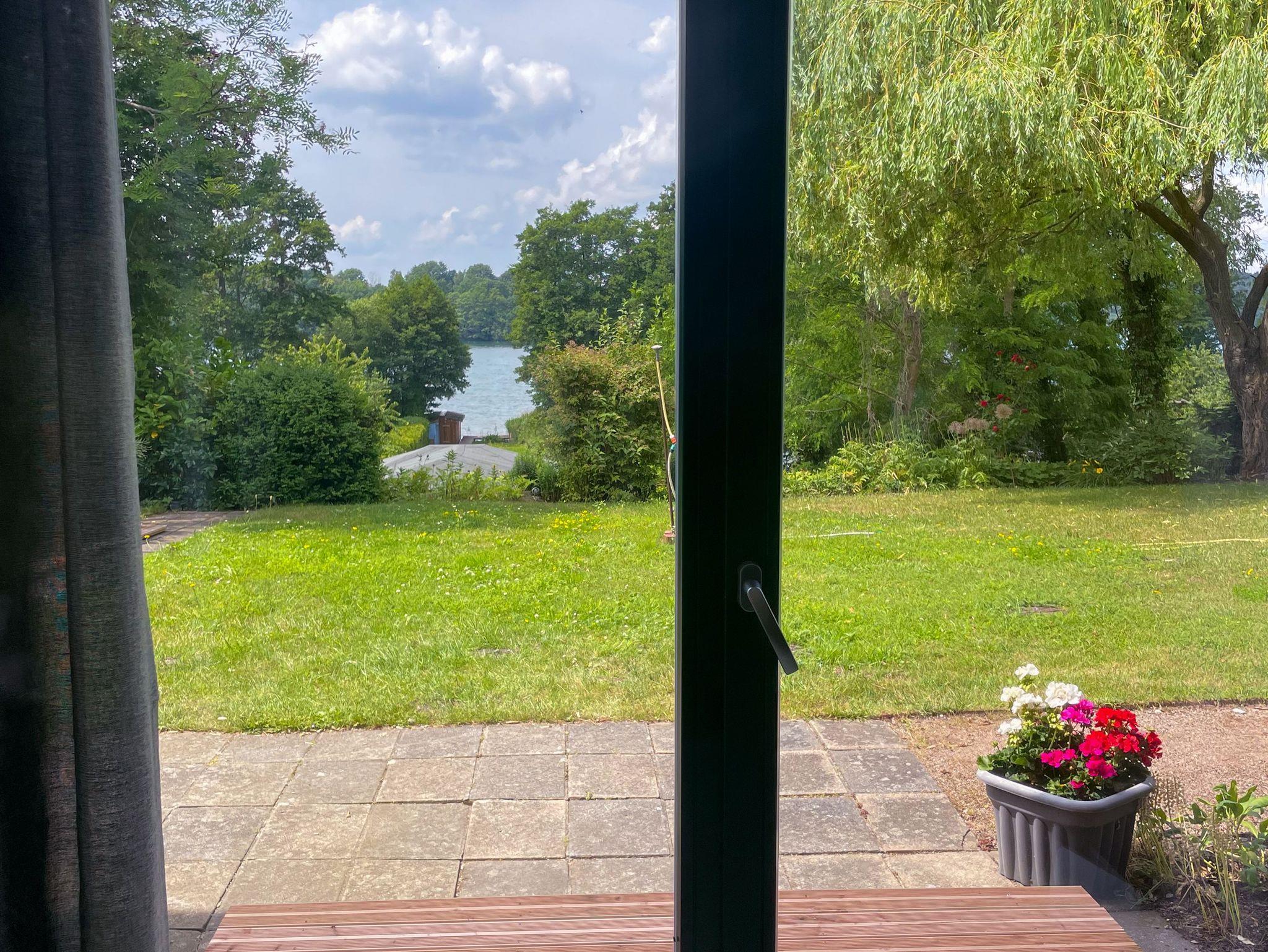 Auf der Terrasse befinden sich Gartenmöbel und ein Grill. Von der Terrasse aus gelangt man in den Garten und zum hauseigenen Badesteg und Ruderboot.