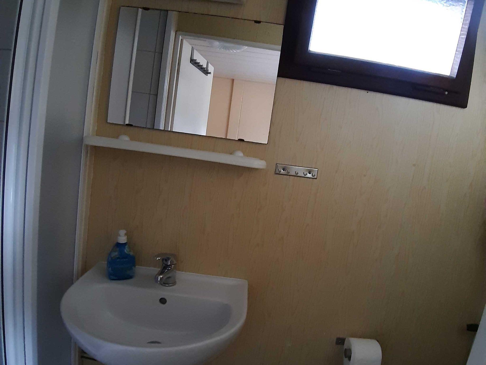 Wohnzimmer, 1 Schlafzimmer mit Doppelbett, 1 Schlafzimmer mit Etagenbett, kleines Duschbad, separate Küche, Zugang zum Bad über das Schlafzimmer mit Etagenbett, überdachte Terrasse