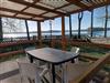 Seeblick, Wohnzimmer, 1 Schlafzimmer mit Doppelbett, 1 Schlafzimmer mit Etagenbett, kleines Duschbad, separate Küche, Zugang von der Küche zum Bad, überdachte Terrasse