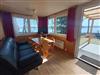 Seeblick, Wohnzimmer, 1 Schlafzimmer mit Doppelbett, 1 Schlafzimmer mit Etagenbett, kleines Duschbad, separate Küche, Zugang von der Küche zum Bad, überdachte Terrasse