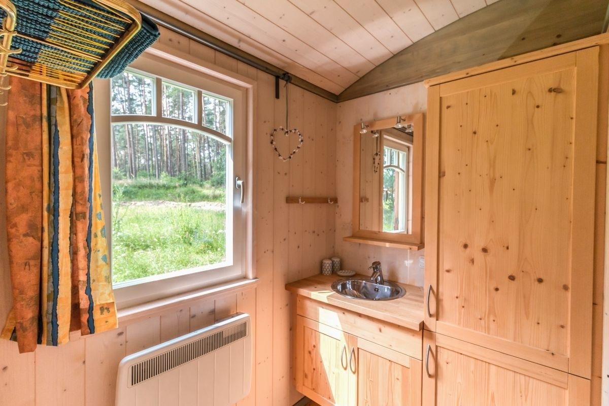 Der Wagen steht mit drei weiteren Zirkuswagen auf einer rund 2.500 m² großen wild-romantischen Waldlichtung, ein klarer Badesee nur 100 Meter weit entfernt. Vor dem Platz gibt es einen Parkplatz für Sie.