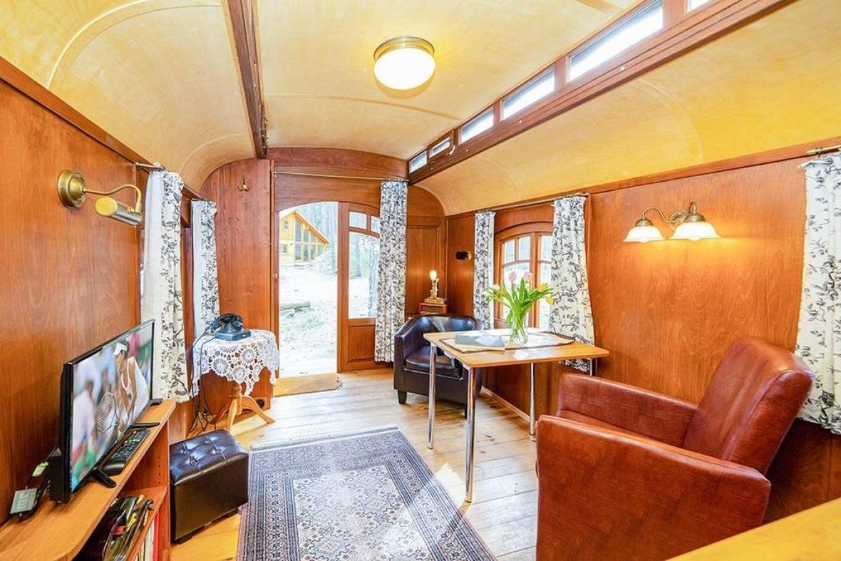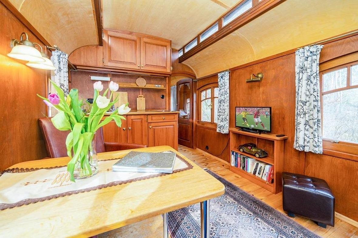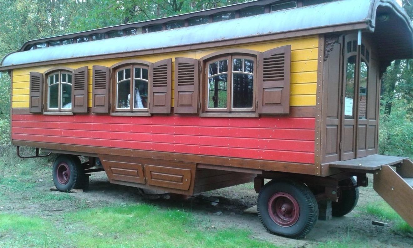 Der Zirkuswagen bietet auf 17 m² Komfort mit Wasser, Abwasser, Strom, Heizung. Er steht auf einer Waldlichtung.